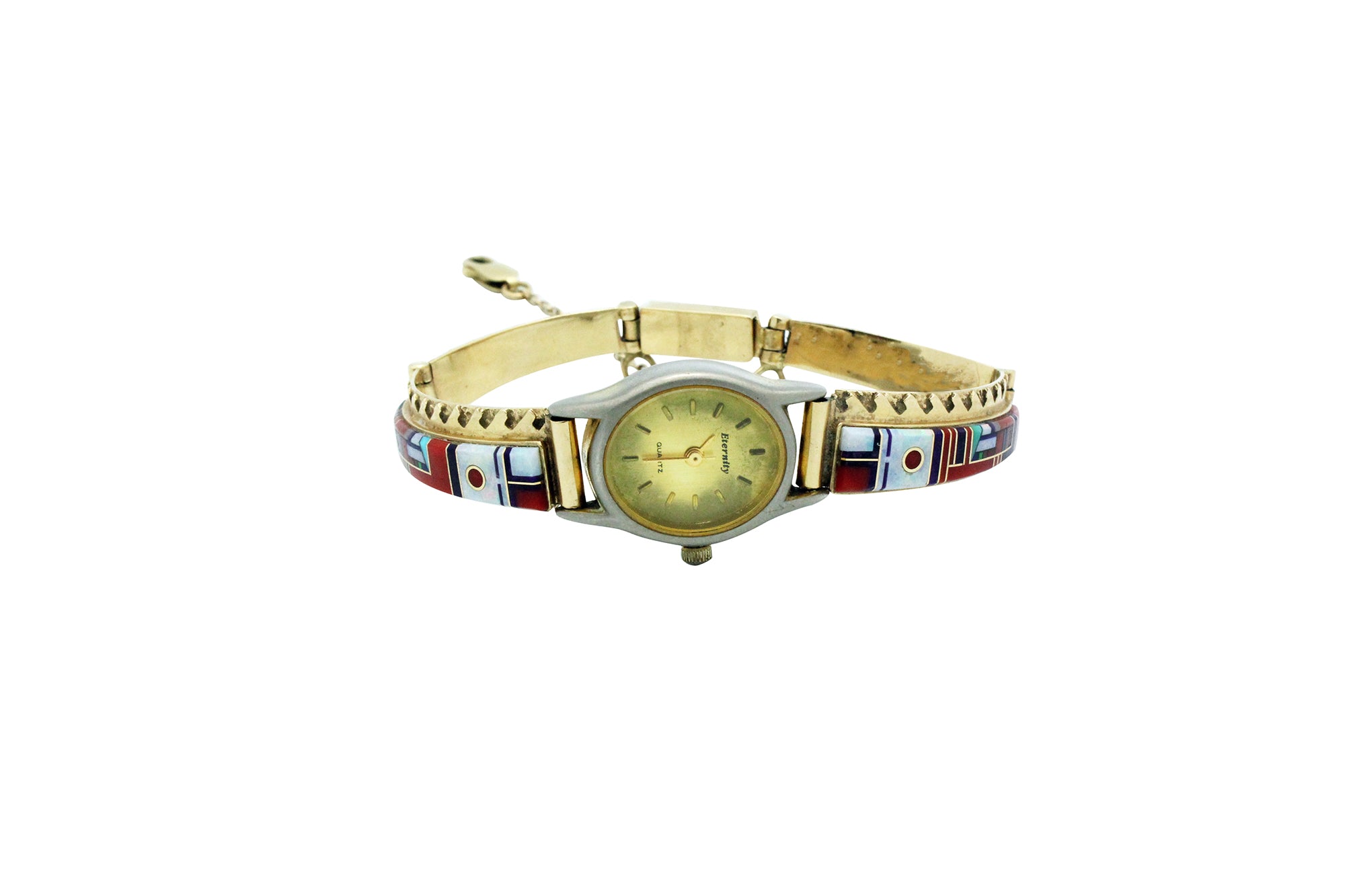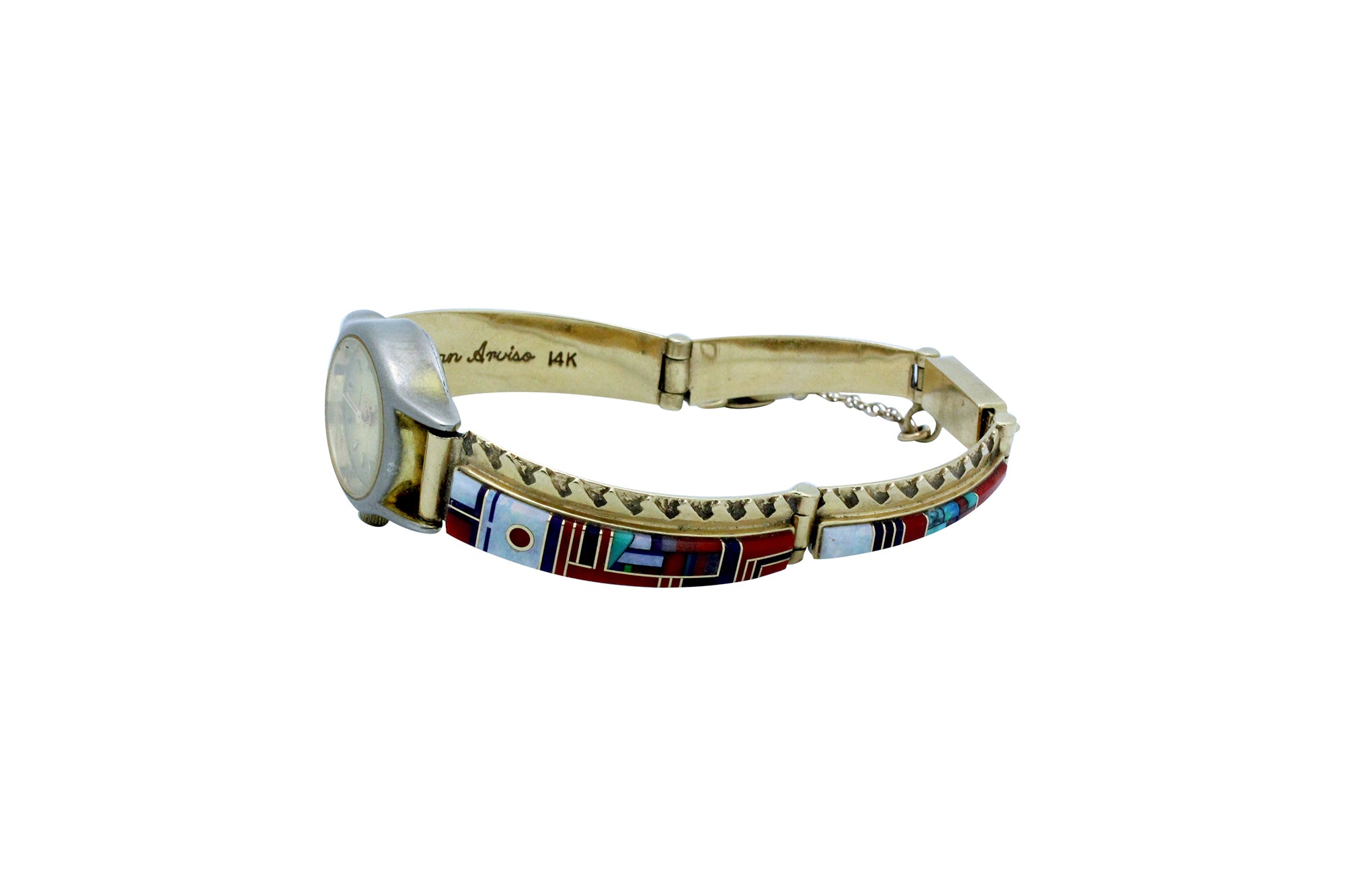 Late Navajo artist Julian Arviso loved to work with gold. His inlay style is perfect for the yellow metal. He has used a combination of opal, coral, sugilite, lapis and turquoise for this stunning link watch bracelet. You will find he has worked a Navajo Holy Yei' face into his design. The edge of the bracelet has an eye appealing design that brings everything together. This bracelet has stopped working and you will need to find a replacement, an easy procedure for a jeweler. The bracelet is circa 1990s.