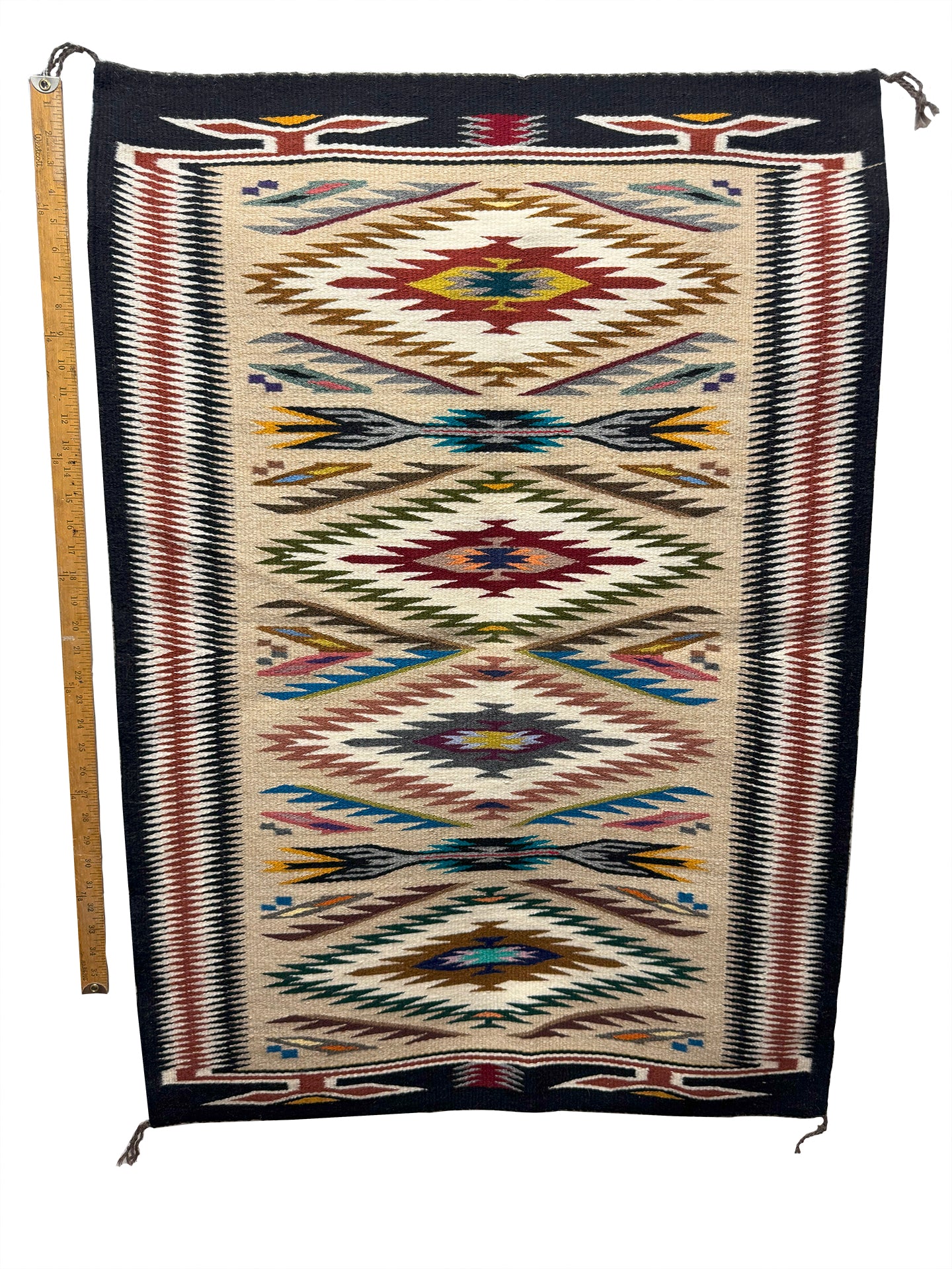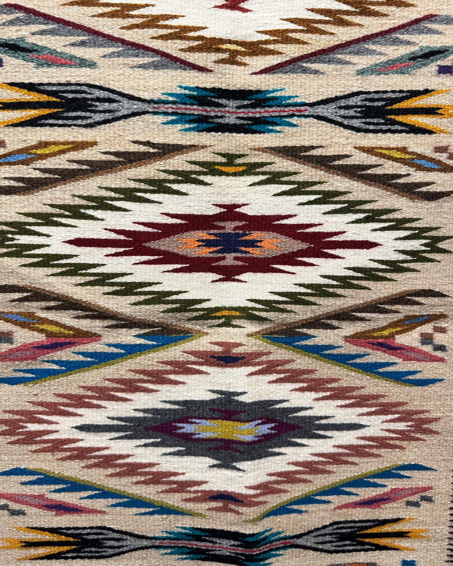 Navajo weaver Darlene Bahe is from an area rich in weaving tradition. She is known for her Teec Nos Pos style rugs and has taught her young daughters the traditional art. You will be blown away by the intricate design that captures so many Four Corner elements. The rug is classic Teec Nos Pos with the heavy border and Oriental feel. Darlene weaves this rug with a tightness that will last for generations of getting used daily. If this one is a little big, we have a few other shorter runners here at the Trading Post, just ask us for some pictures.