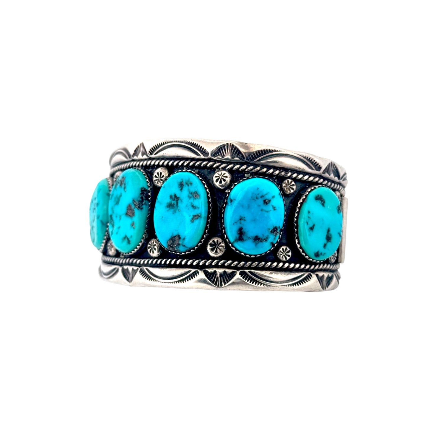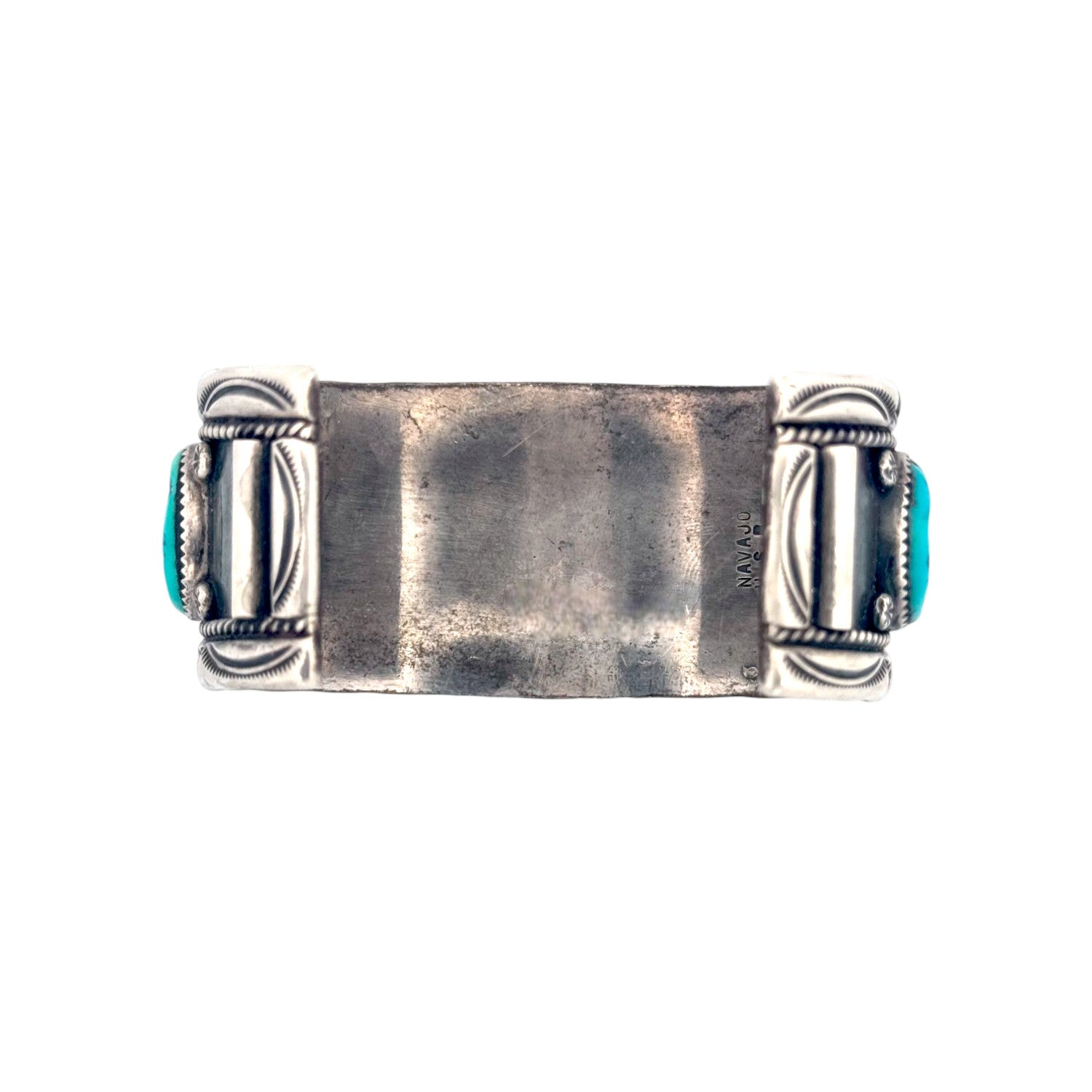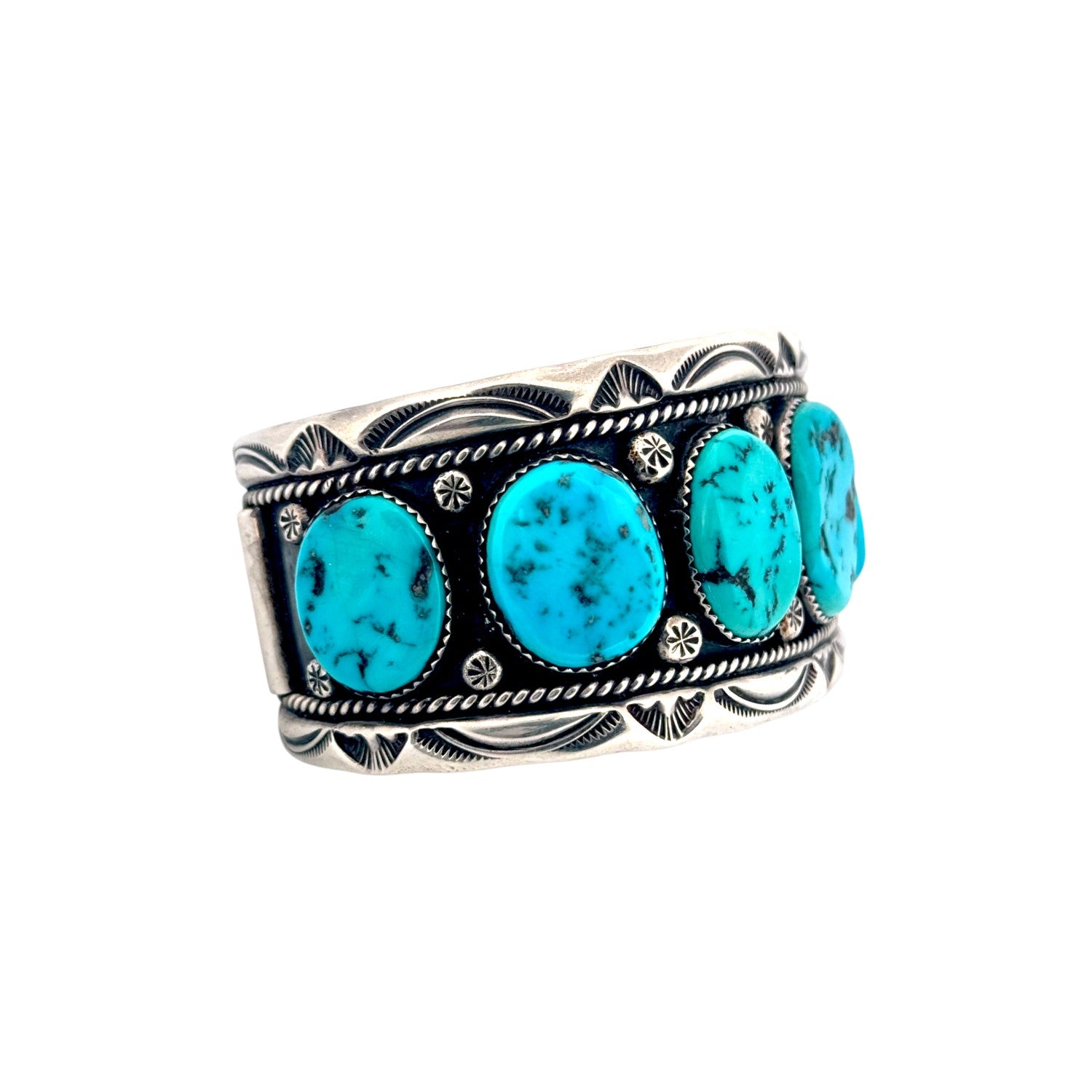 This Navajo handmade bracelet by Harry Begay is a powerful expression of traditional artistry and natural beauty. The cuff features bold oval cabochons of Waterweb Kingman Turquoise, each stone displaying vibrant blue hues with striking black web-like matrix patterns. Set in finely crafted sterling silver bezels, the stones are framed by twisted wire and accented with stamped star and crescent motifs. The oxidized background enhances the contrast, making the turquoise stand out in vivid brilliance. Wide and substantial, the bracelet carries a commanding presence while maintaining the elegance of hand-stamped detail. The craftsmanship reflects Begay’s mastery, blending durability with intricate artistry. This bracelet is both a collector’s treasure and a wearable statement of Southwestern tradition.