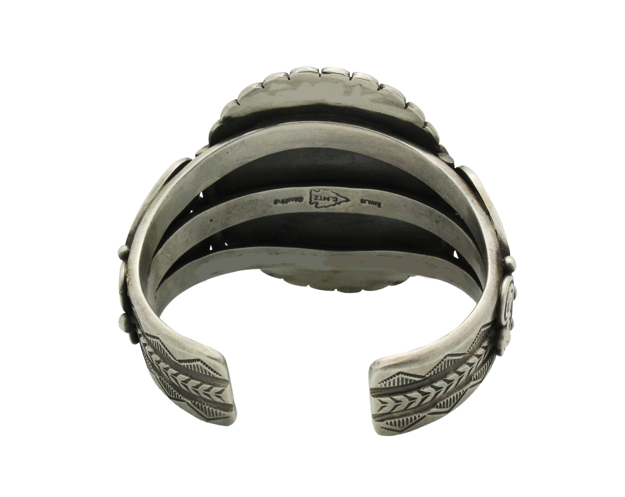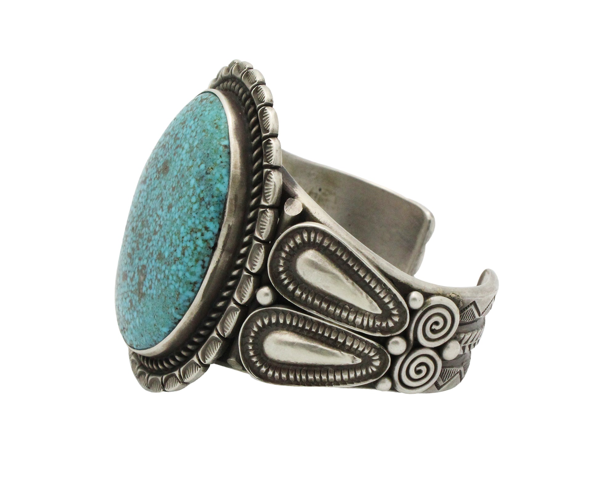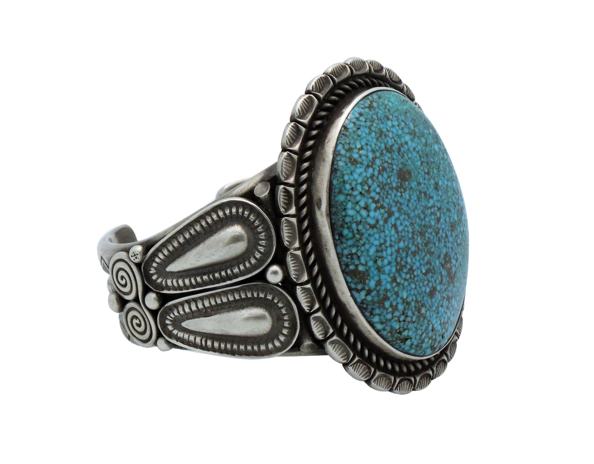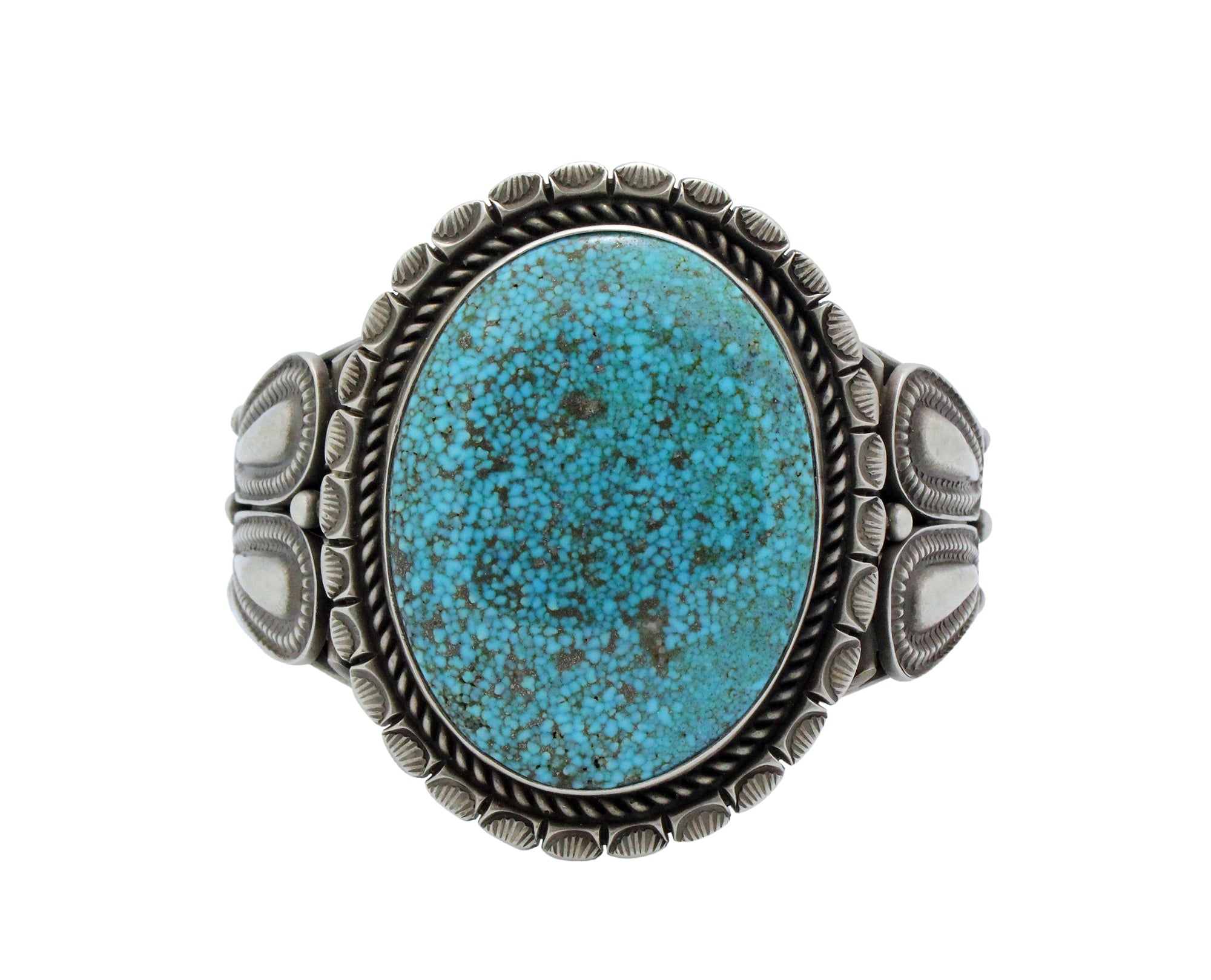 Kingman Turquoise can produce a variety of looks. From fascinating blues to greens and no matrix to a tight spider web matrix. This gorgeous Kingman rock shows off a stunning blue that hosts a tight spider web matrix. You will be impressed by the dome cut and how thick the stone is, which is revealed by the rock coming high over the bezel. Navajo silversmith Calvin Martinez was able to take the big stone and turn it into a very comfortable wearing bracelet. He doesn't take away from the rock and just adds enough silver work to turn this into a spectacular piece of wearable art. The stone sits on a stamped bracelet cuff and is finished with Calvin's brushed look. It is not everyday you get to add a rock like this to your collection.