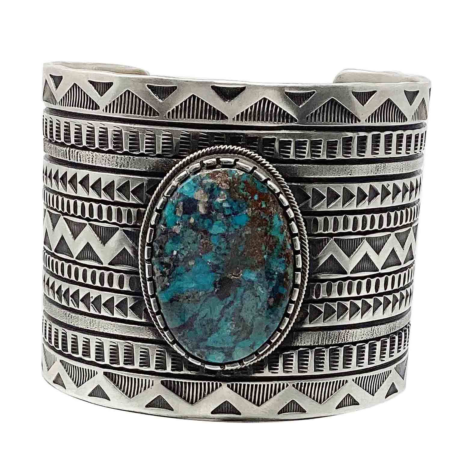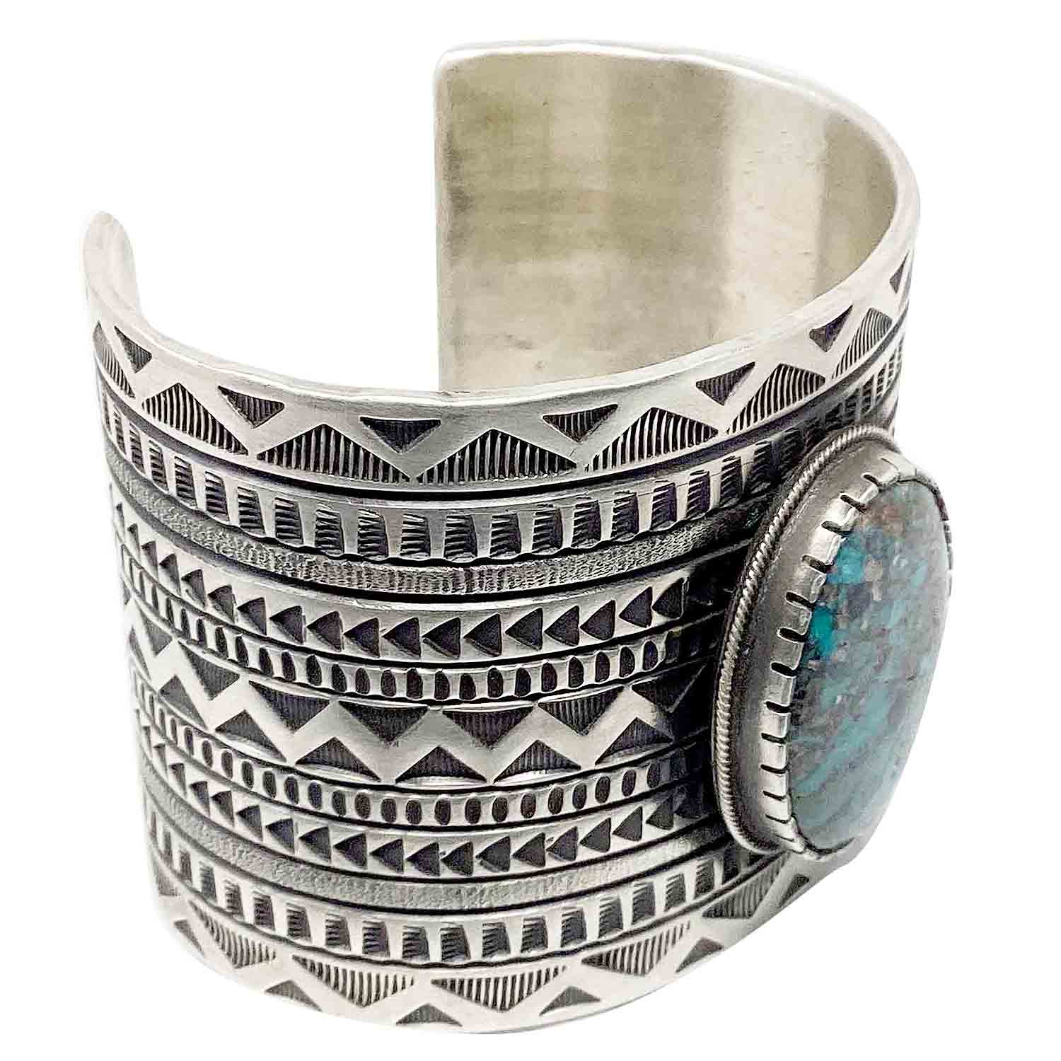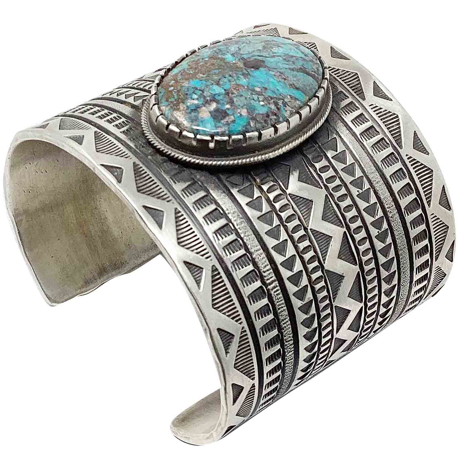 Julian Chavez, Stamped Bracelet, Wide, Bisbee Turquoise, Navajo Handmade, 7 1/4"