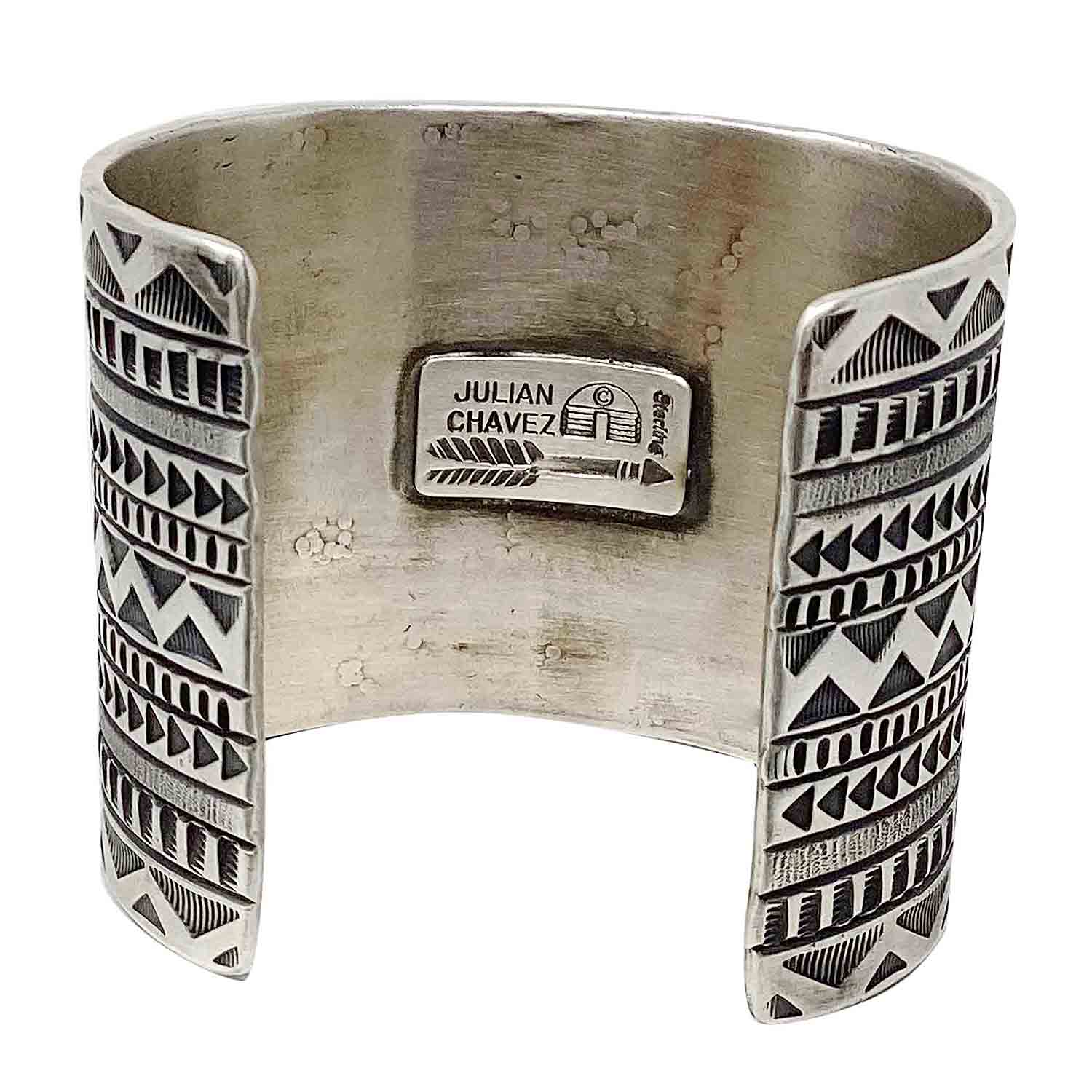 Navajo silversmith Julian Chavez made this impressive stamped bracelet. He has set a piece of very collectible Bisbee Turquoise at the center of this fabulous handmade creation. This classic Arizona rock has a signature Bisbee blue that is filled with a heavy flow of Bisbee's lavender matrix. Julian has filled the wide silver cuff with his signature stamp work, a design that showcases a collection of four different stamp designs. You will also find the oval cut stone wrapped with a very clean filed bezel, and all of the silver showcases an old style antique rustic brushed look. If you are wanting something big with a great American stone, you found it.