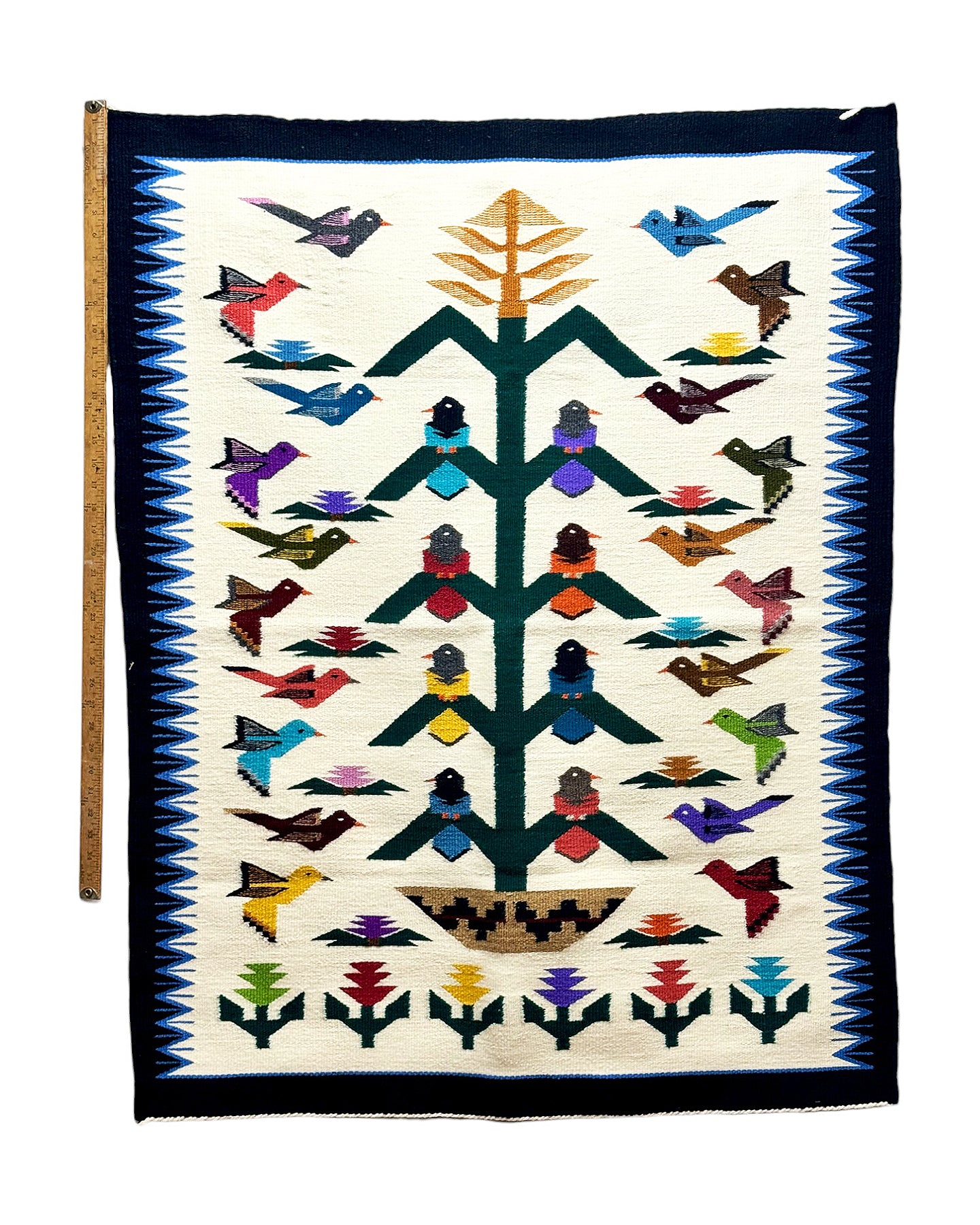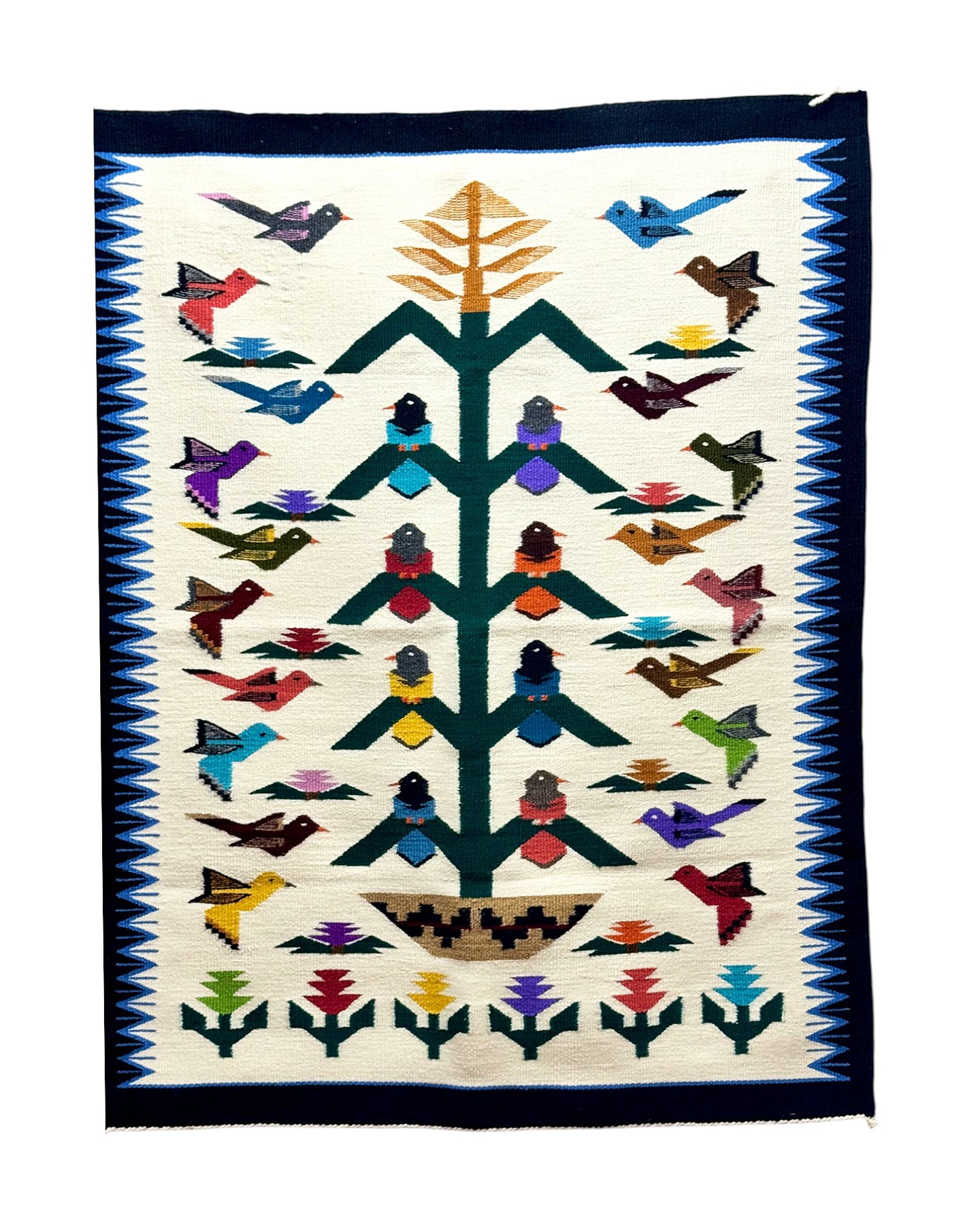 The Navajo Tree of Life is a colorful rug style usually depicting a central corn plant emerging from a Navajo Wedding basket, with birds, feathers and rainbow bars enhancing the design. For the Navajo, corn is sacred, corn is life. “Walking under the corn leaf is the Beauty Way,” a Navajo elder said. Thus, everything that is good, life affirming and positive is embodied in a Tree of Life rug.