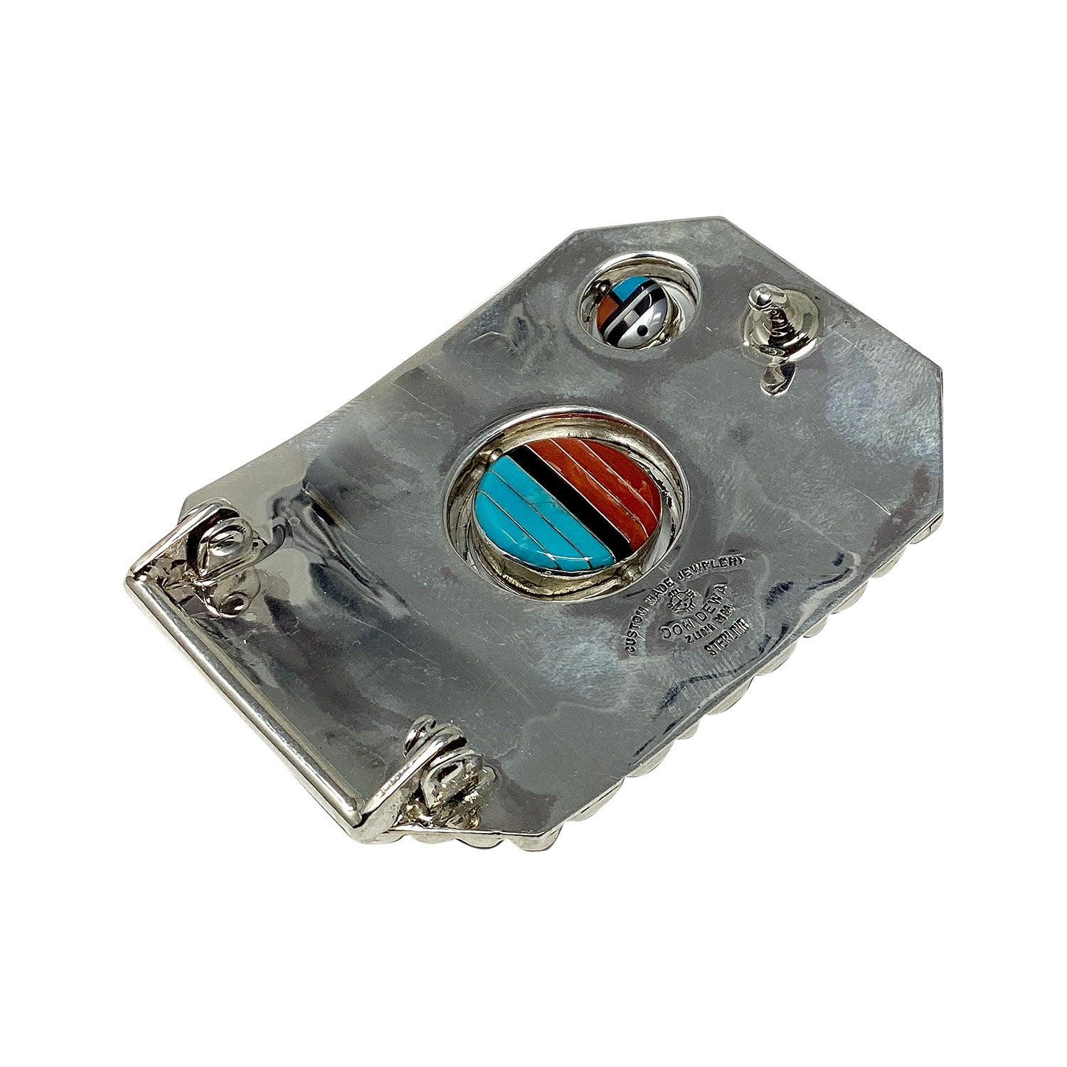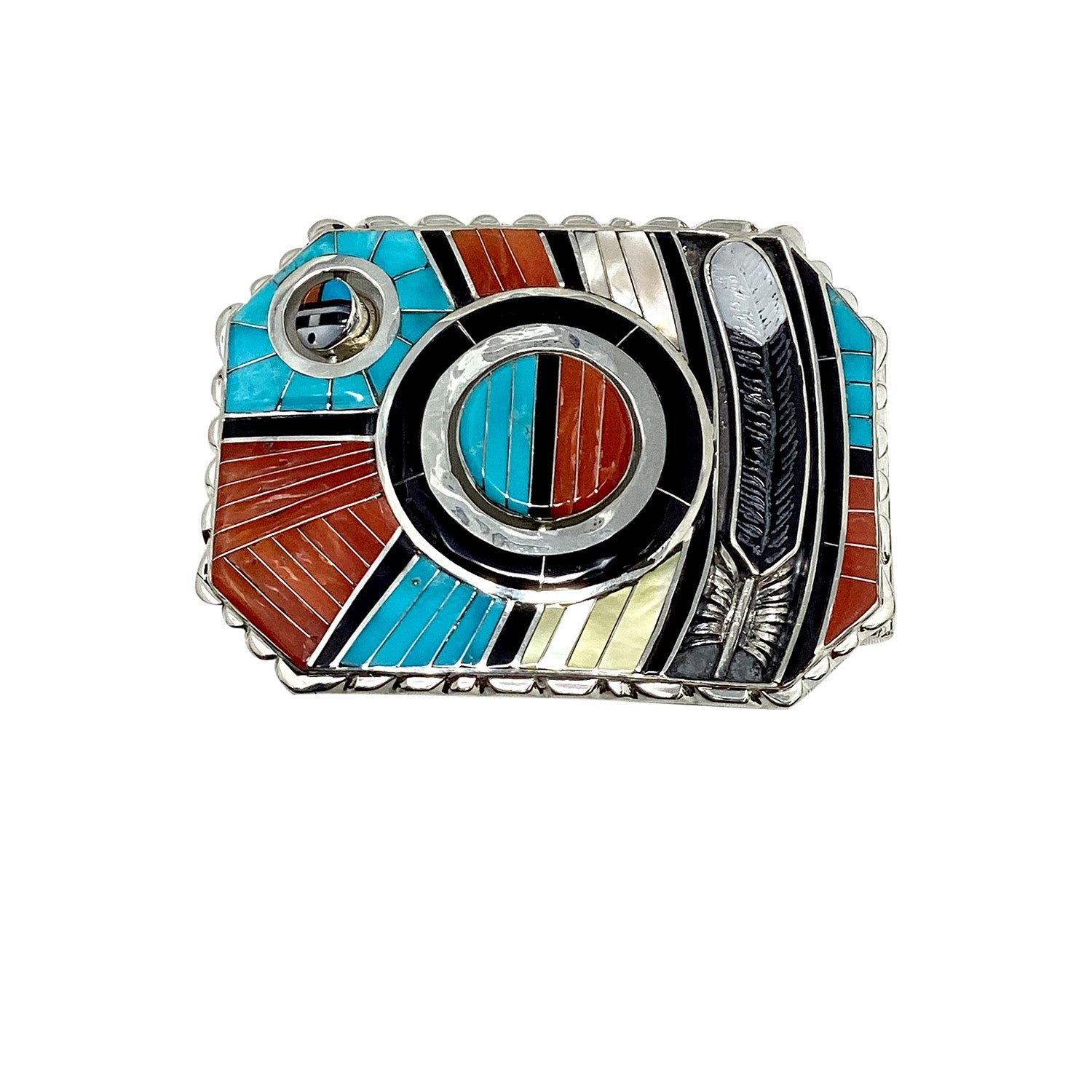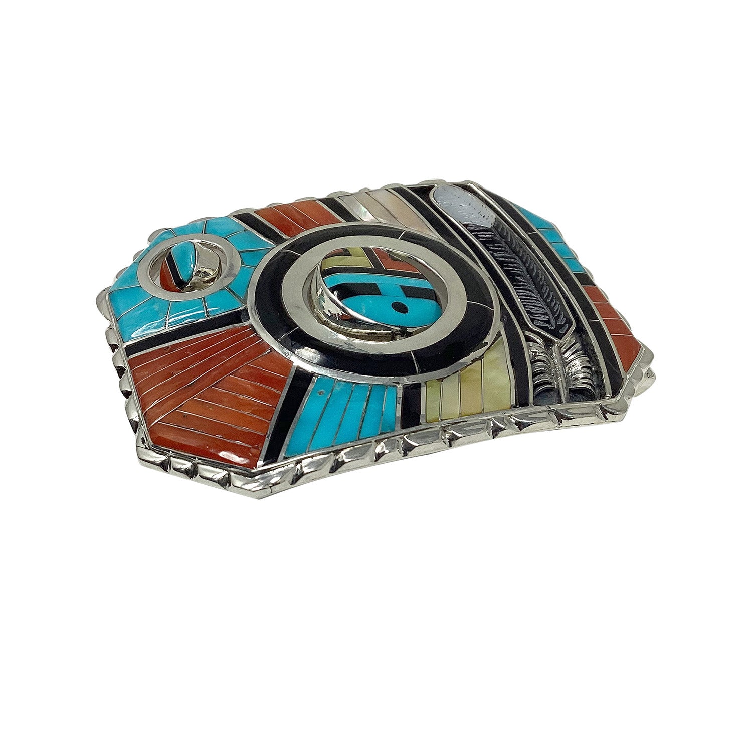 Zuni artist Don Dewa has a very distinct style. His amazing creations are recognized by First American art collectors around the world. You will find a number of his pieces designed with a rotating Sunface and etched inlaid eagle feather, and this time he has added an extra sunface but smaller from the center. This amazing buckle combines beautiful jet, coral, shell and turquoise set in a channel inlay style with thin pieces of sterling silver separating the rocks. The Sunface is a classic Zuni style that is found in many pieces of art in this New Mexico Pueblo community. Show off your contemporary Zuni style and appreciation of traditional inlay every time you put this spectacular piece on. Check out our other pieces by Don Dewa on the online Trading Post.