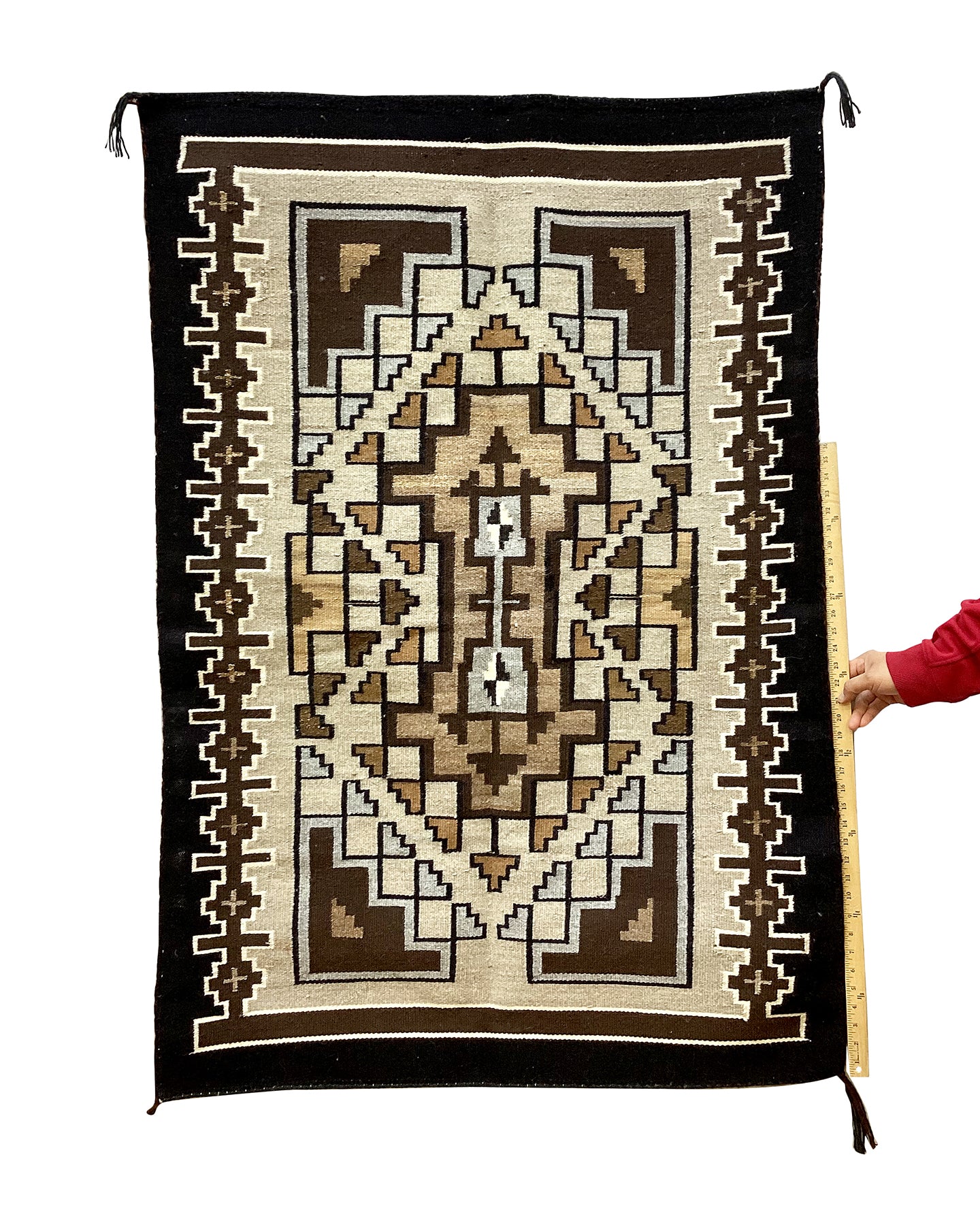 The favorite weaving for many collectors is the Two Grey Hills. Famous because of the natural sheep colors and the stiff feel of churro wool. Many Two Grey Hills will have very complex patterns and it takes a significant amount of time to realize all of the hidden symbols. Patterned after the classic Diamond designs this is definitely a style you need in your growing collection of rugs.