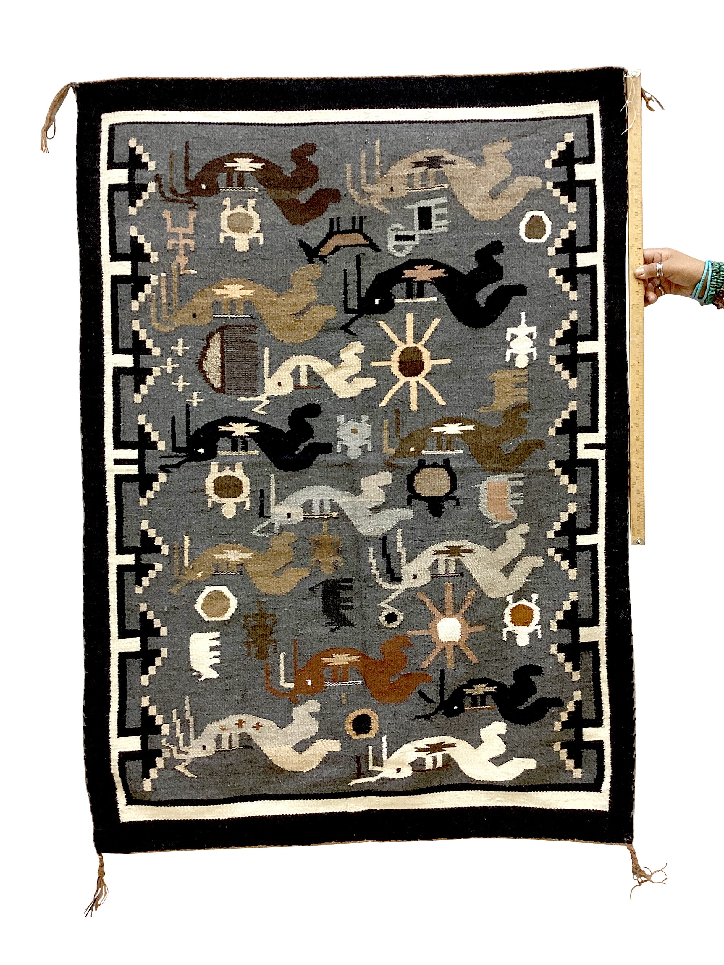 Storytelling is part of the Navajo culture. No history text had been written until the Europeans showed up, everything was passed down orally and through art. You will find storytelling in silver , basket weaving and other forms of art. That also holds true for rug weavings, where pictures and symbols tell the contemporary and traditional past of the Navajo people. Enjoy looking through our collection of pictorial rugs, some fascinating creations.