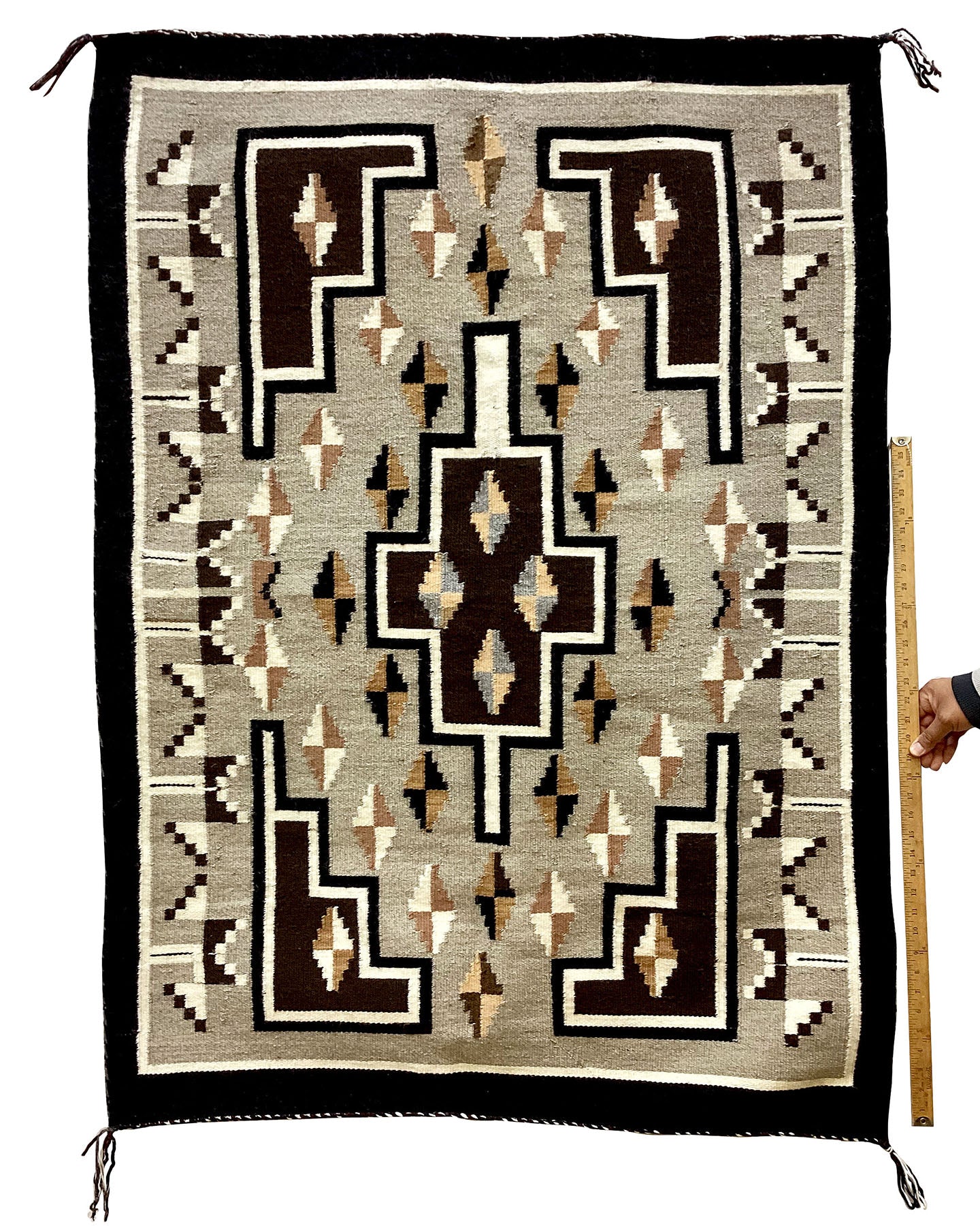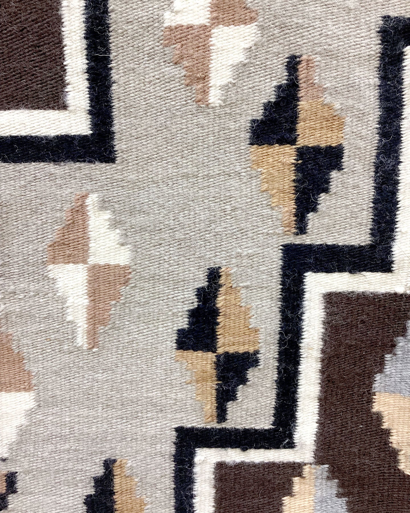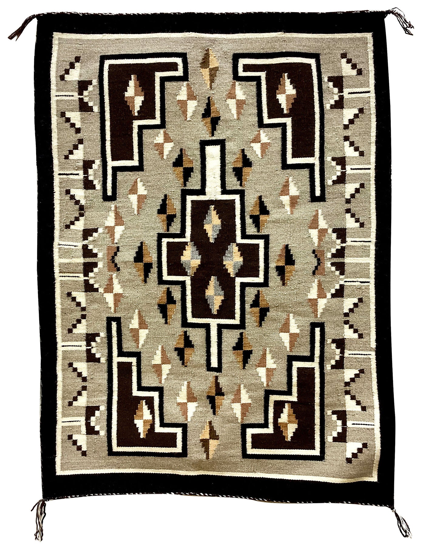 The favorite weaving for many collectors is the Two Grey Hills. Famous because of the natural sheep colors and the stiff feel of churro wool. Many Two Grey Hills will have very complex patterns and it takes a significant amount of time to realize all of the hidden symbols. Patterned after the classic Diamond designs this is definitely a style you need in your growing collection of rugs.