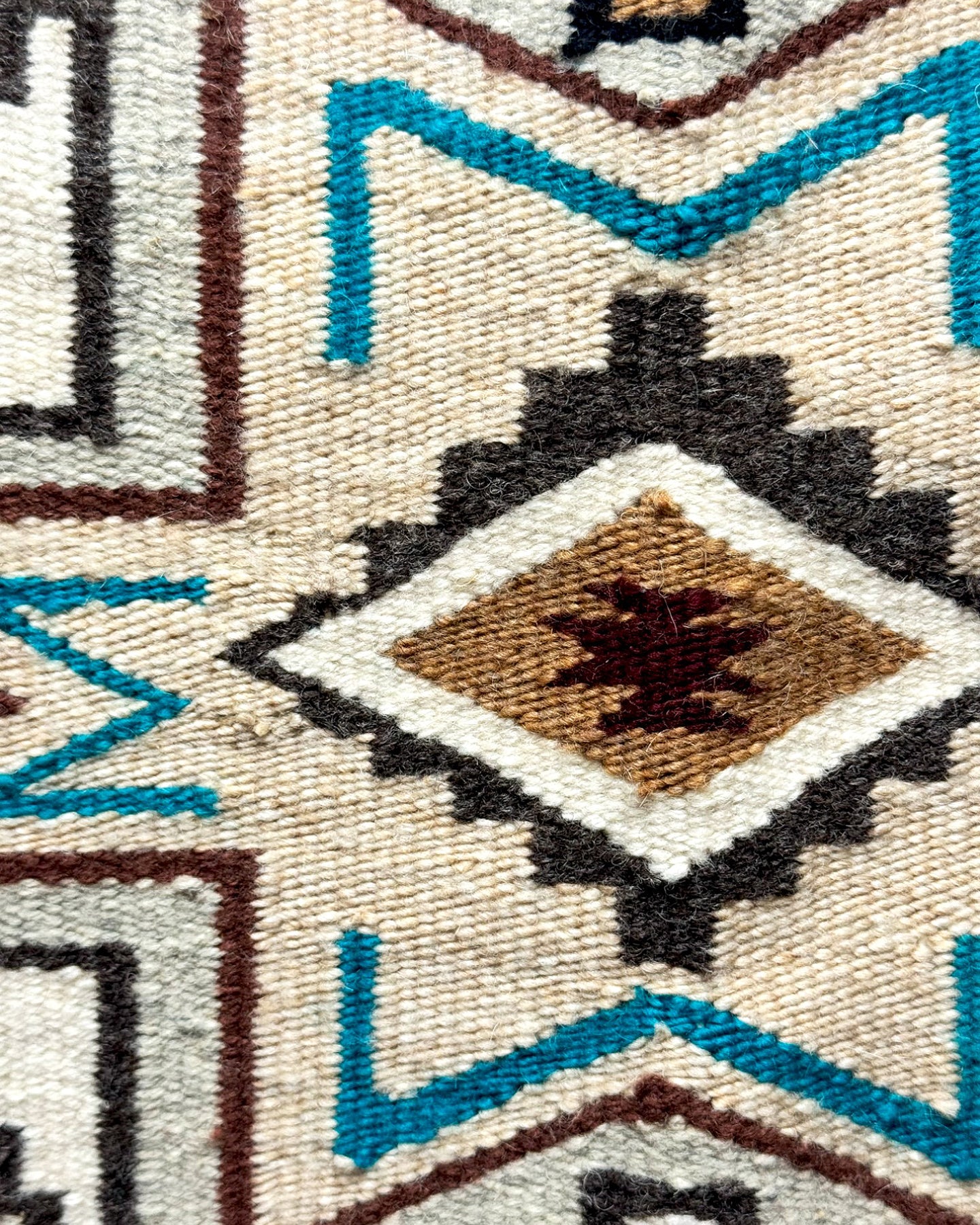 Navajo weaver Mary Harvey is from an area rich in weaving tradition. She is known for her Teec Nos Pos style rugs and has taught her young daughters the traditional art. You will be blown away by the intricate design that captures so many Four Corner elements. The rug is classic Teec Nos Pos with a heavy border and Oriental feel. Mary weaves this rug with a tightness that will last for generations of getting used daily. If this one is a little big, we have a few other shorter runners here at the Trading Post, just ask us for some pictures.
