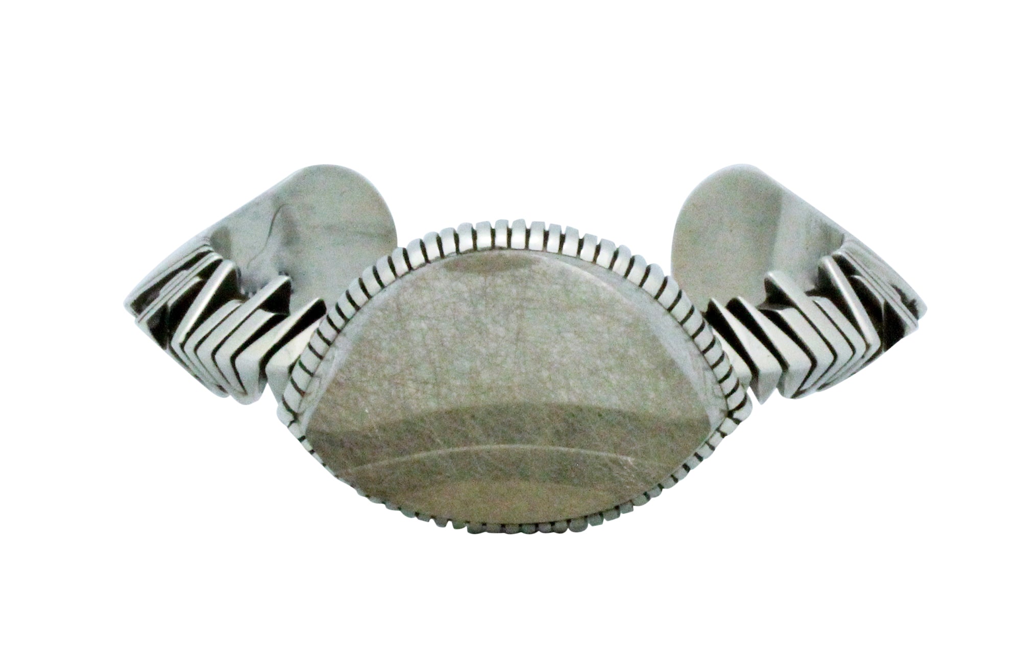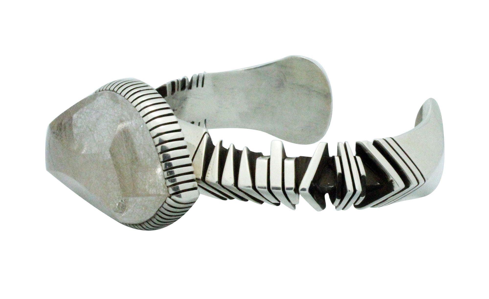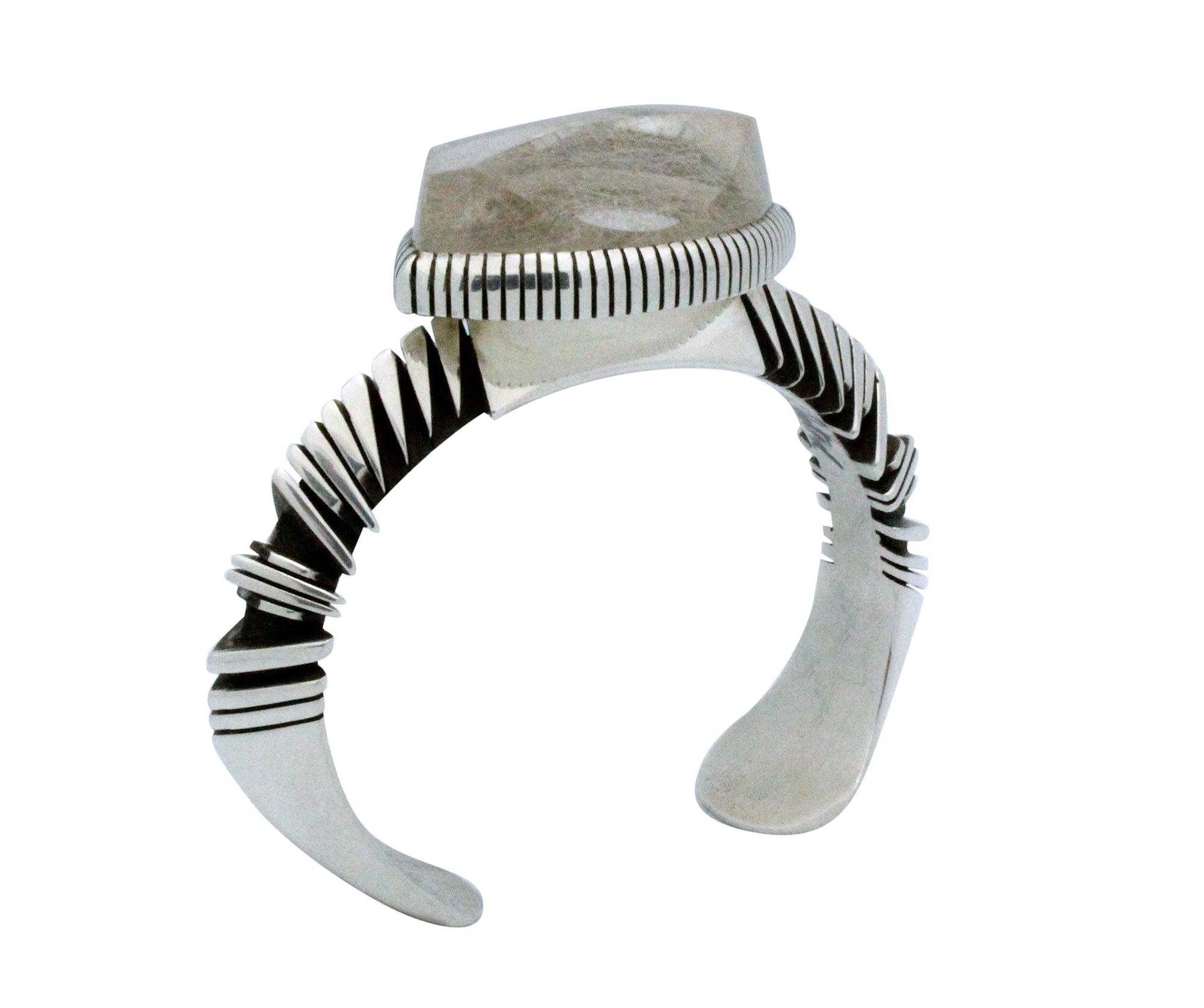 In the world of art it is really difficult to be original. Jewelry has been made for centuries and many times those antique pieces can look very similar to contemporary work. However, some artists create a look that has never been seen before. That is exactly what San Felipe artist Isiah Ortiz has pulled off with his silver work. The reason we might have never seen this style of work is because of how difficult it is. Isiah works with extremely thick pieces of silver wire and manipulates them into these incredible works of wearable art. You will find this thick triangle cuff decorated with a large piece of quartz. Enjoy adding this to your collection of one-of-a-kind Native American art.