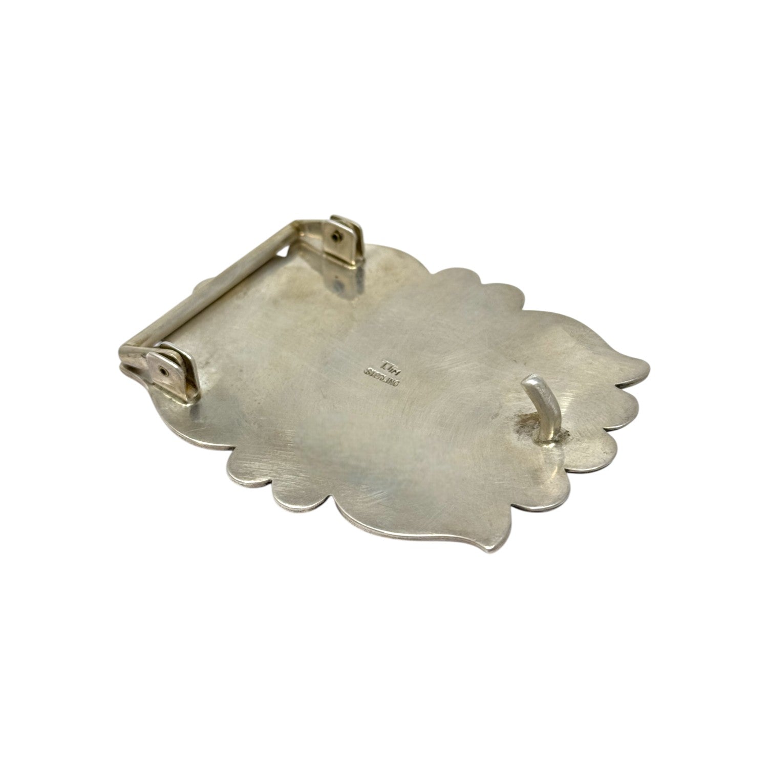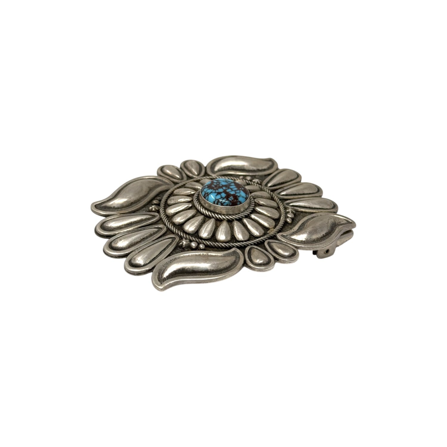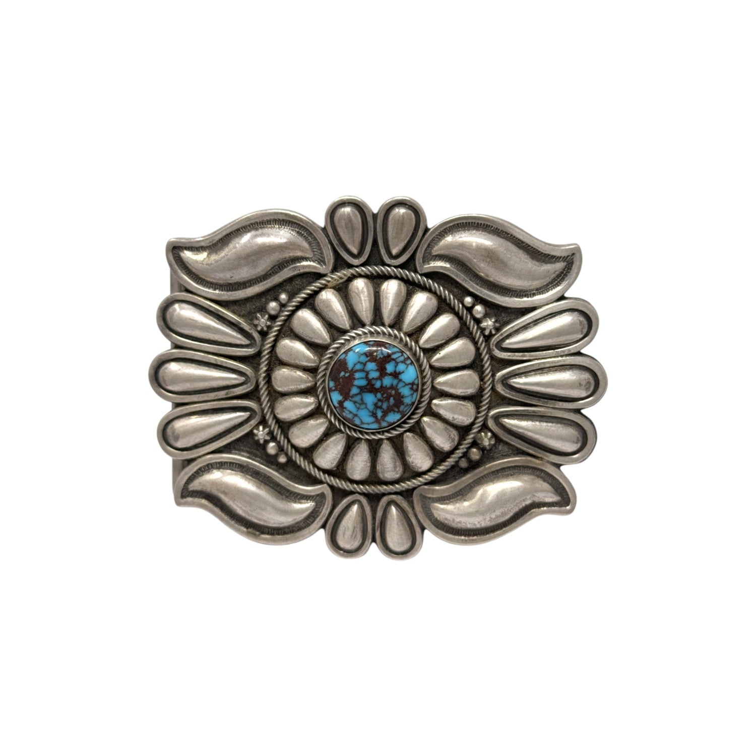 Masterfully handcrafted by renowned Navajo silversmith Thomas Jim, this sterling silver buckle is a striking display of traditional craftsmanship and refined artistry. At its heart lies a captivating Egyptian turquoise stone, known for its vivid blue hue laced with bold chocolate matrix, evoking the timeless beauty of the desert. The stone is framed by a hand-stamped floral motif, radiating with deeply detailed repoussé and scalloped designs that give the piece depth and movement. Each silver petal is meticulously raised and polished, creating a bold dimensional effect against the oxidized background. The buckle's classic rectangular shape is softened by fluid curves and elegant stamping, resulting in a design that feels both powerful and graceful.