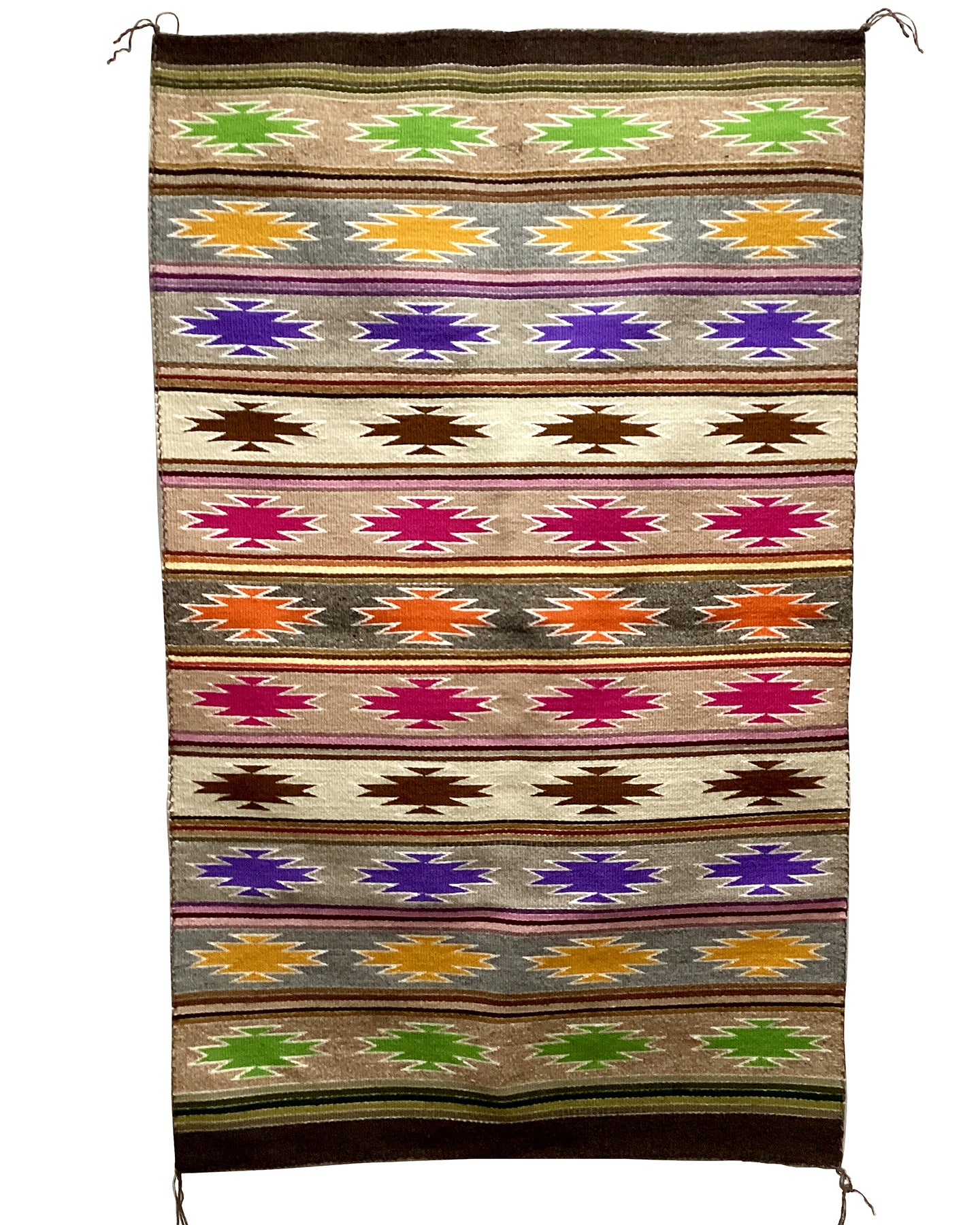 Wide Ruins, Arizona had a trading post where vegetal dyes were encouraged in rugs. That, along with the demand for excellence in the weaving has led many collectors to desire these fine rugs. Navajo weaver Jean Wilson wove this stunning branded rug. It reflects the awesome colors of the Wide Ruins area, enjoy. Before the trains started coming to this part of the world and businesses like the Fred Harvey Company started selling Navajo jewelry to the masses, most people back east didn't know anything of the Navajo. Traders like JB Moore would be one of the first to introduce the art of the Navajo to collectors back east, rugs not silver. He put together a catalog of different weavings that would be sold in large quantities. More Traders would begin to introduce Navajo weavings and even influence certain styles. Today this tradition is carried on by the Trading Posts. We have a large collection of weavings from classic Ganado Reds to Germantown Revivals. Also, old antiques that have the character that goes with age to the new contemporary weavings. Enjoy looking through our online collection and remember if you don't see what you are looking for, we have many more in the Post.