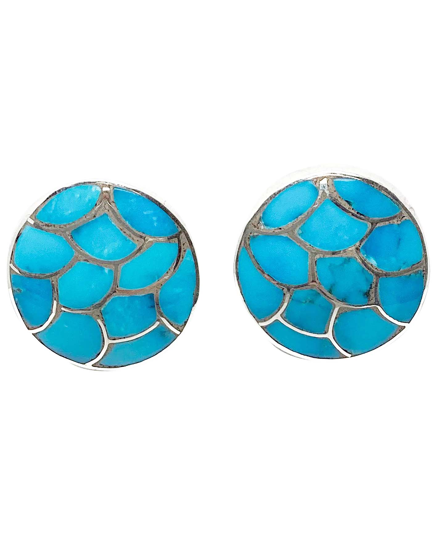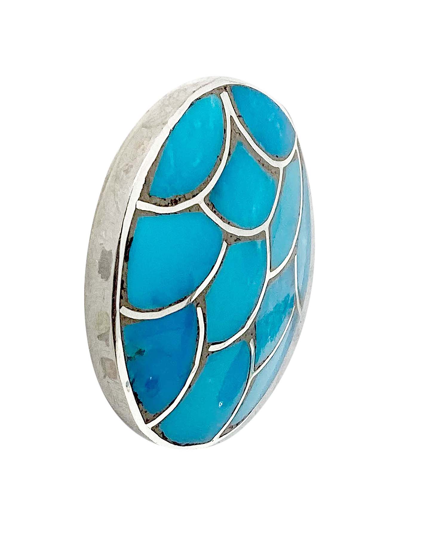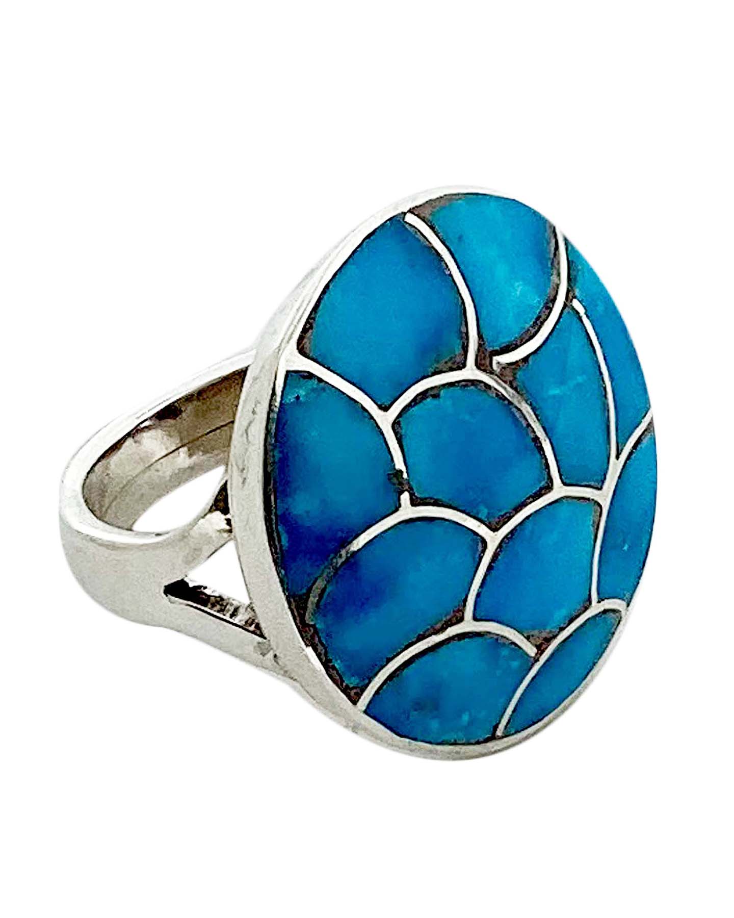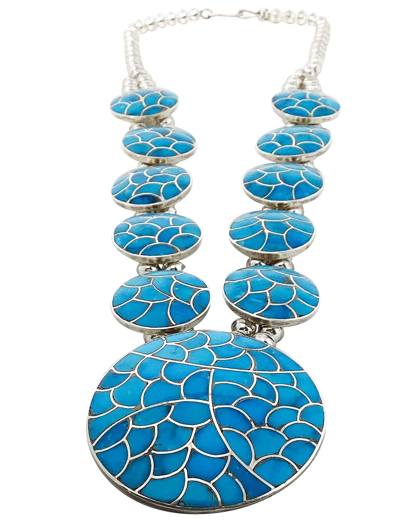 This stunning Zuni jewelry set was handmade by Lynelle Johnson. The style is classic Zuni fish scale inlay. You will find beautiful pieces of rich blue Sleeping Beauty Turquoise have been used for all three pieces. Heavy strips of curved sterling silver separate the inlaid stones creating that favorite fish scale design. Lynelle has constructed a gorgeous 11 piece necklace with sterling silver beads, pierced earrings, and a matching ring. Might be a wonderful gift for that Native art enthusiasts who likes to have those unique collections of Native American art.
