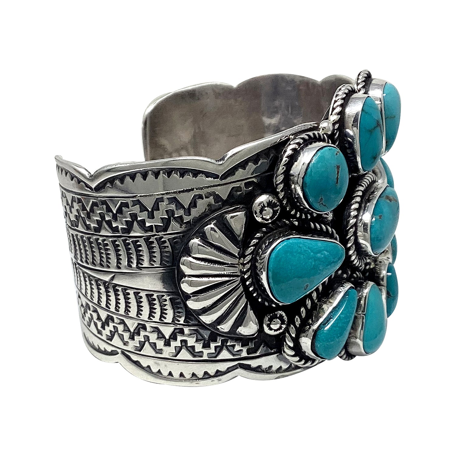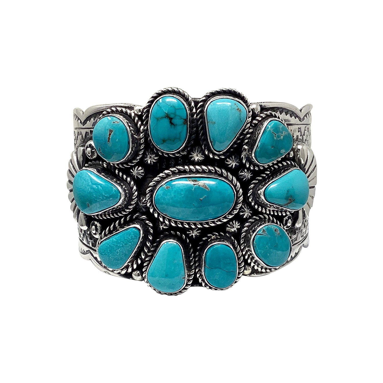 Bold silver and big stones have become the signature look of Navajo artist Tillie Jon. She has been bringing the Trading Post some incredible pieces of silver and stone. Almost all of the work she brings us is a cluster creation that uses free form cut stones that gives her work this amazing look. This bracelet has a collection of light and dark blue shades with hints of brown matrix. You will love the way the rocks sit on a heavy sterling silver cuff that has been filled with traditional stamp work. Tillie Jon's bracelet is going to impress all who see it, and not just because of the size but because of the incredible beauty. Make sure you check out the online Trading Post for the other Tillie Jon creations, while they last.