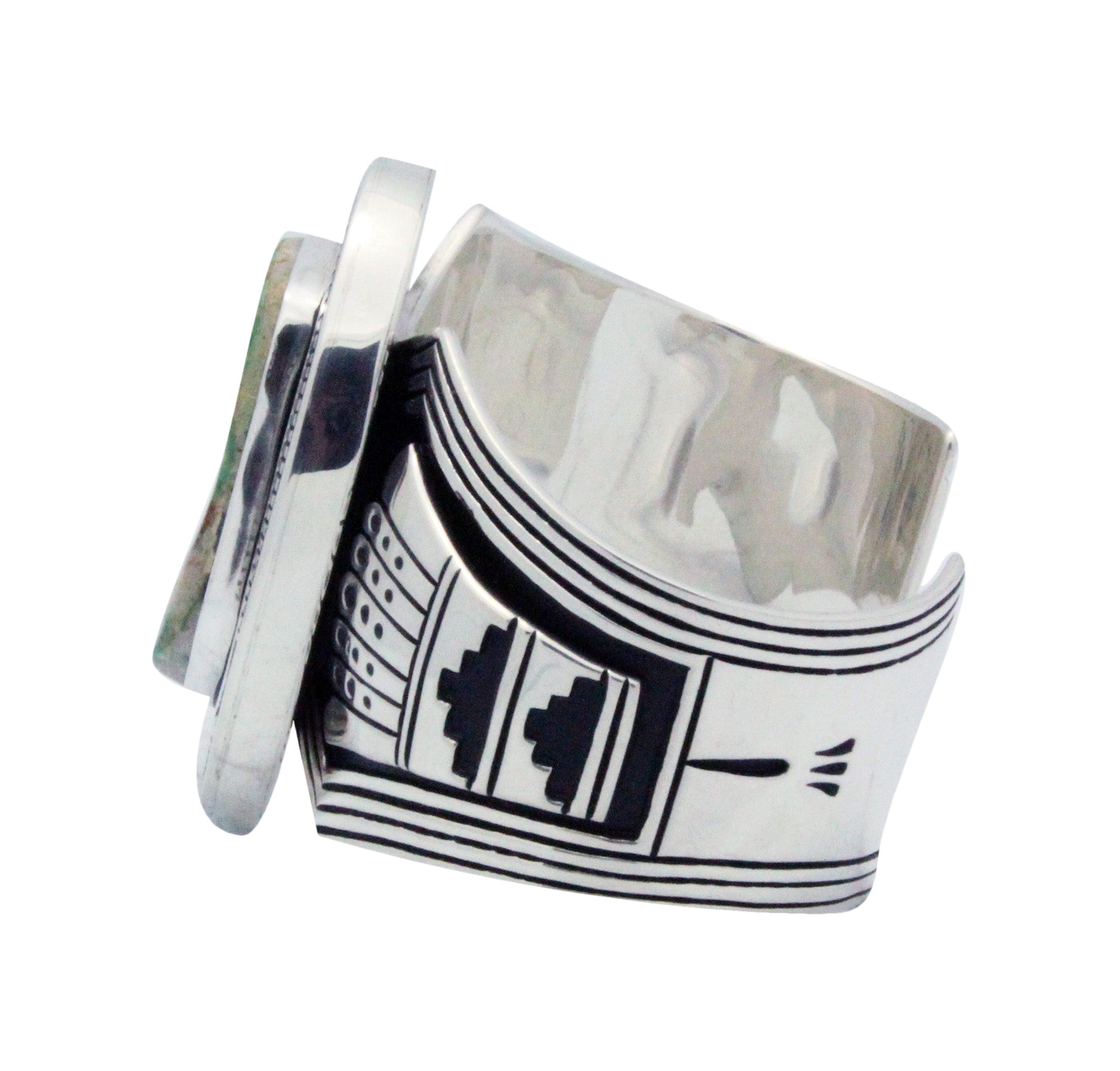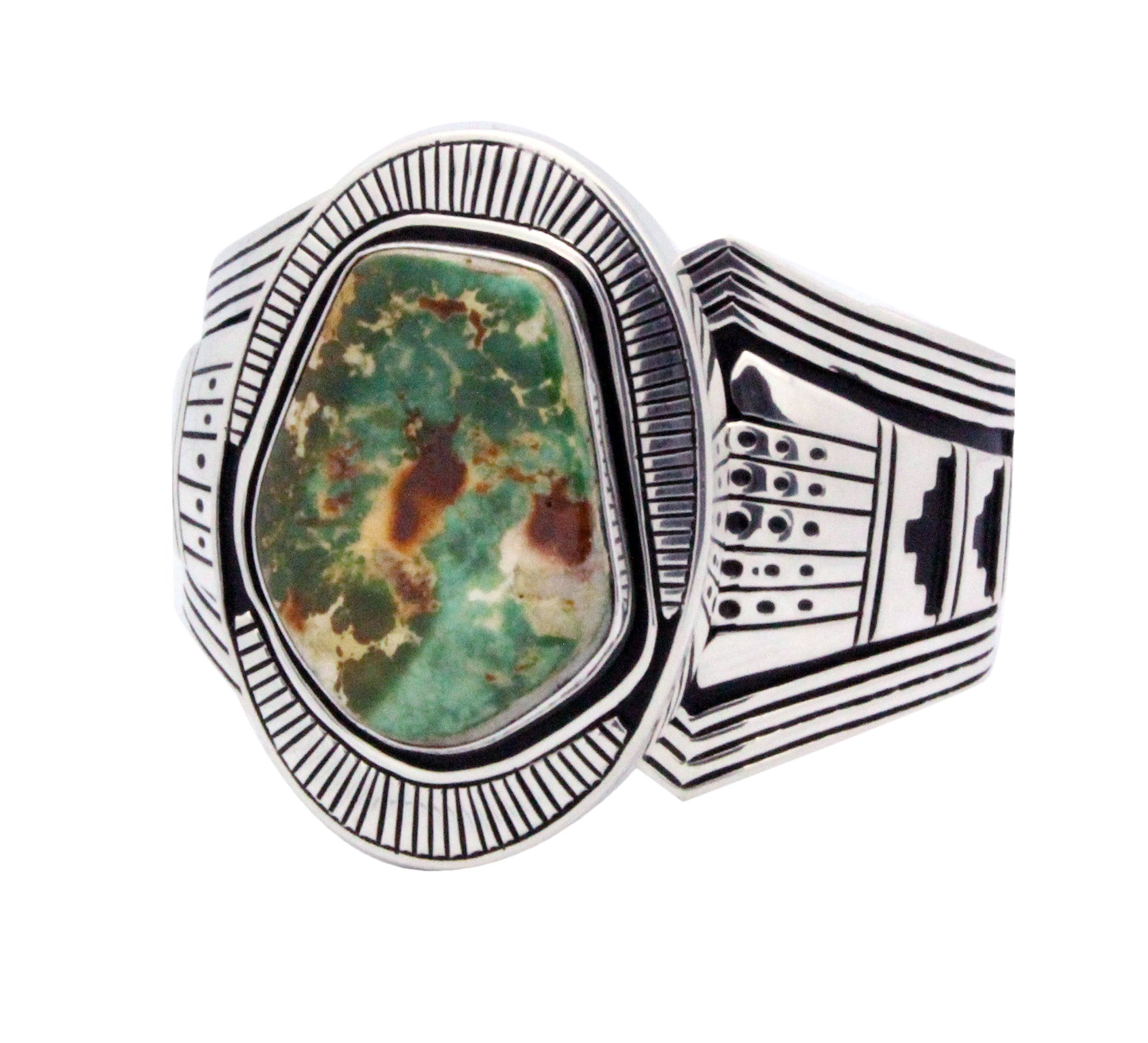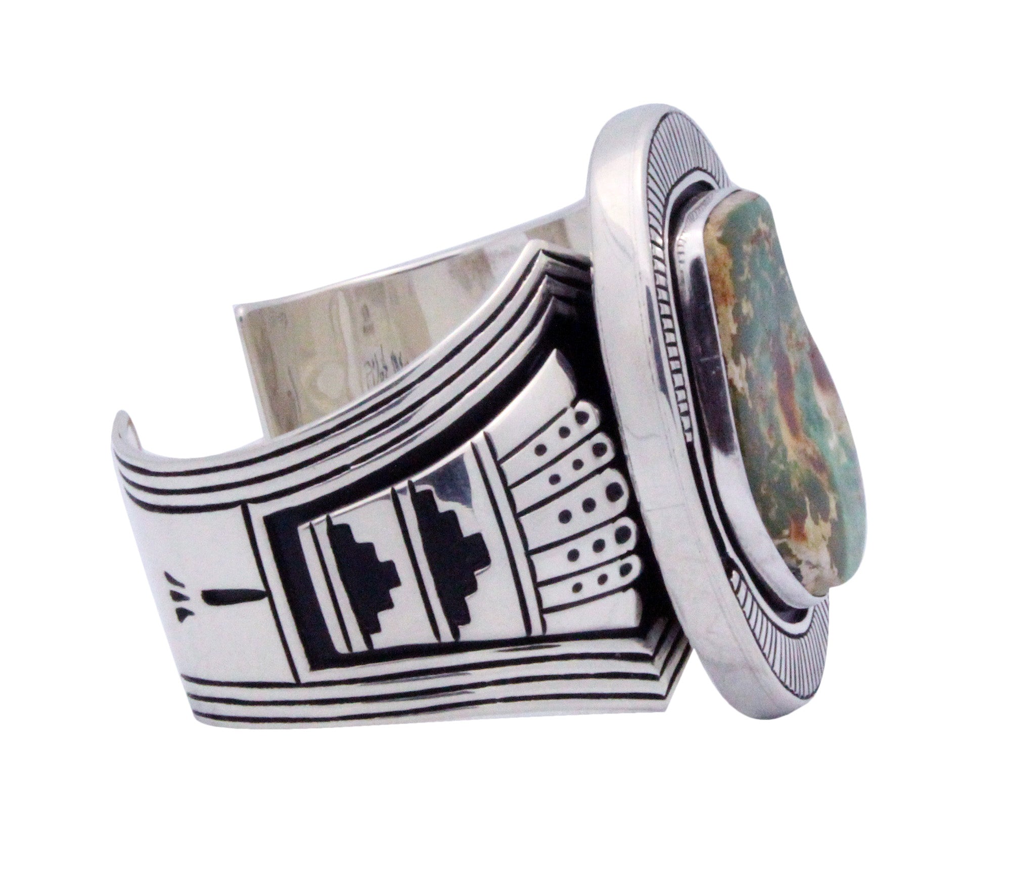 Nevada has produced many of America's most famous turquoise mines. It seems like the pieces that are legendary from Nevada have one thing in common, bold color. When you are lucky enough to come across a rock from this mineral rich state a good chance it is full of character and color. Royston Turquoise is known for colors because you can find this rock in blues and greens. However, the rock that found its way onto this cuff is only going to be known for its fabulous greens, shades of light and dark. Navajo artist Kary Begay uses the large free form cut Nevada beauty to fill the top of this large silver creation. The green stone is surrounded by Kary's amazing silver overlay style. This is an amazing piece of wearable art that is going to become your favorite the moment you take it out of the box.
