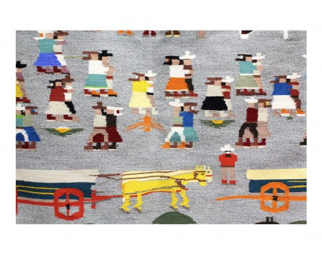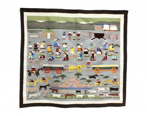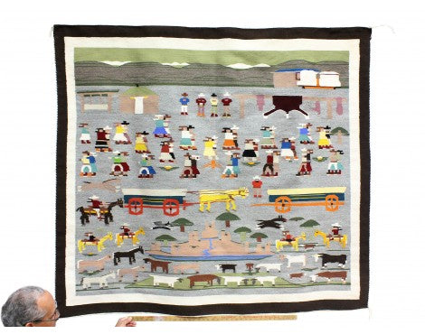 Storytelling is part of the Navajo culture. No history text had been written until the Europeans showed up, everything was passed down orally and through art. You will find storytelling in silver , basket weaving and other forms of art. That also holds true for rug weavings, where pictures and symbols tell the contemporary and traditional past of the Navajo people. Enjoy looking through our collection of pictorial rugs, some fascinating creations.