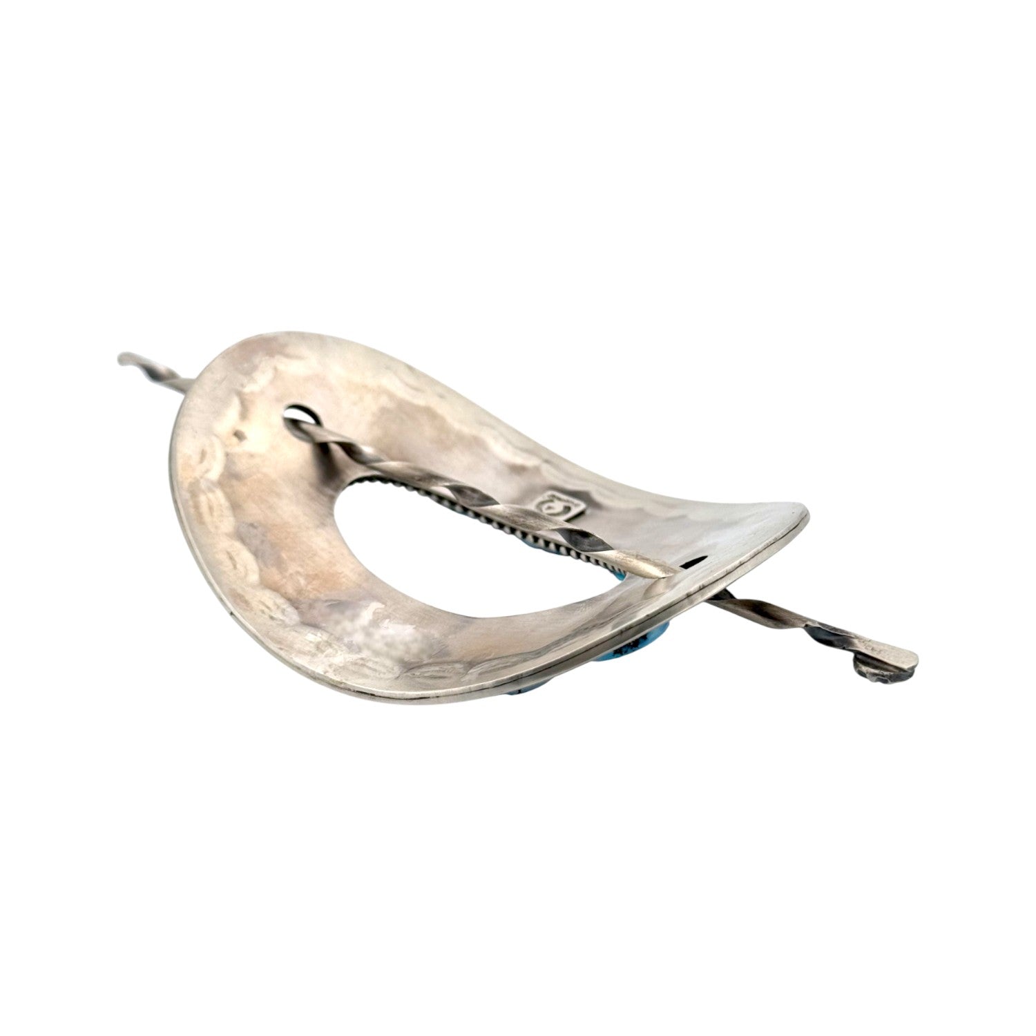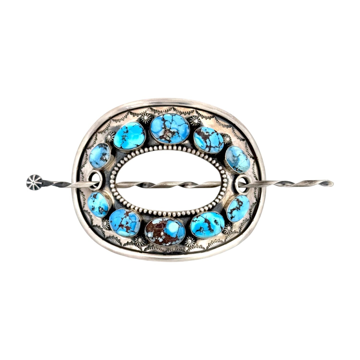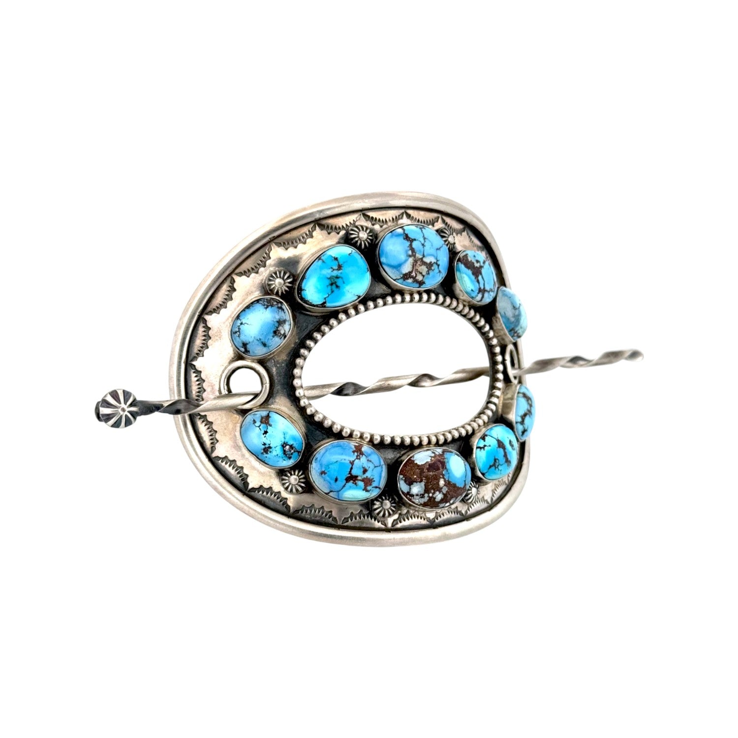 This Navajo handmade hair pin by Freddie Maloney is a striking blend of tradition and elegance. Crafted from sterling silver, it features an oval-shaped frame adorned with natural Golden Hills turquoise cabochons. The turquoise stones display vibrant blue hues with distinctive brown and golden matrix, making each piece truly unique. Hand-stamped details and a twisted silver pin add depth, texture, and artistry to the design. Both functional and ornamental, this hair pin serves as a beautiful way to secure and adorn hair with a touch of Southwestern heritage. Maloney’s expert silversmithing highlights the harmony between bold turquoise and finely worked silver. A wearable work of art, it honors Navajo craftsmanship while offering timeless style.