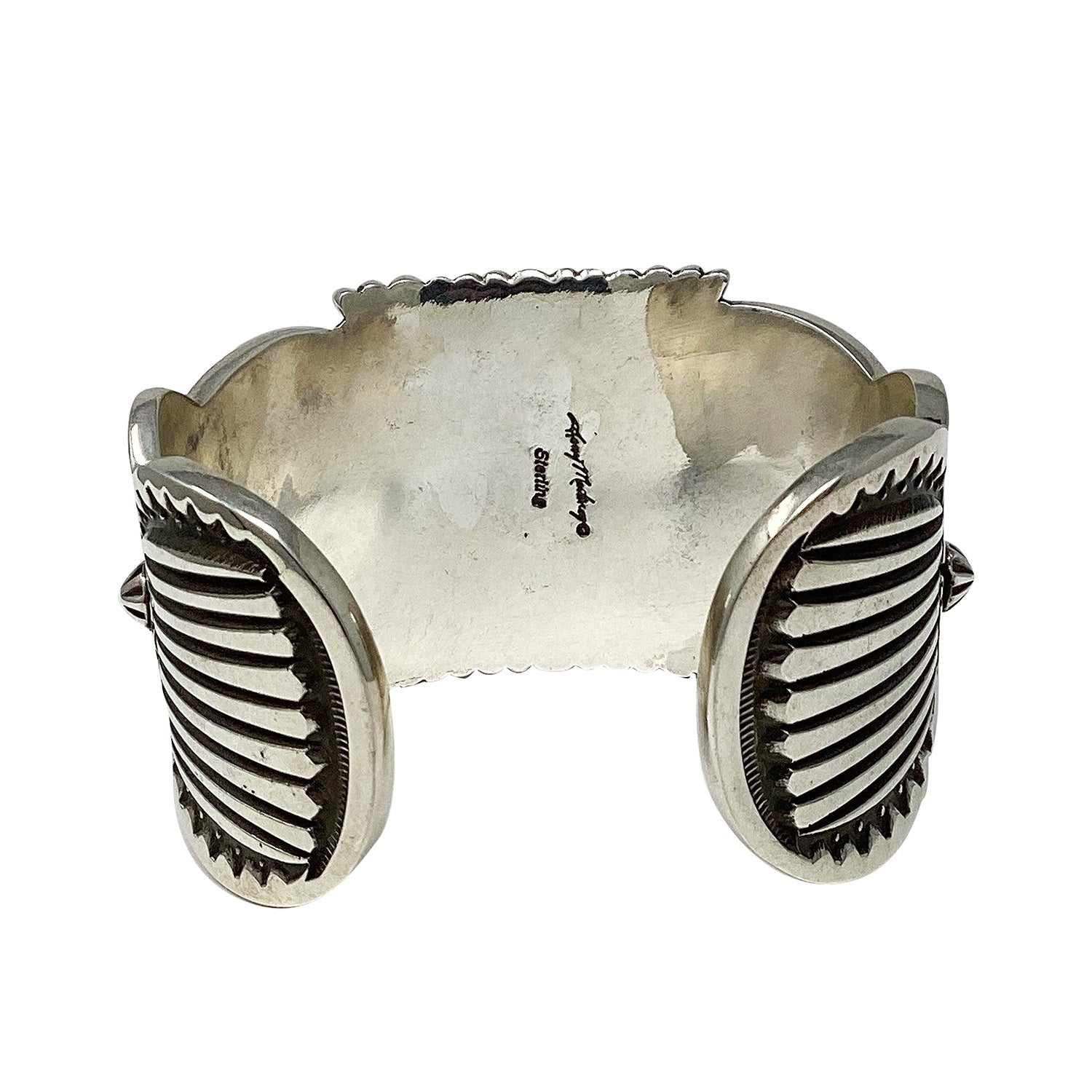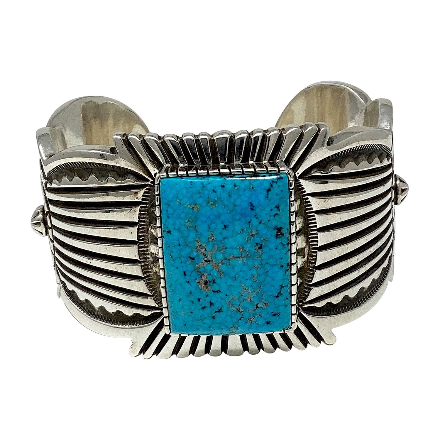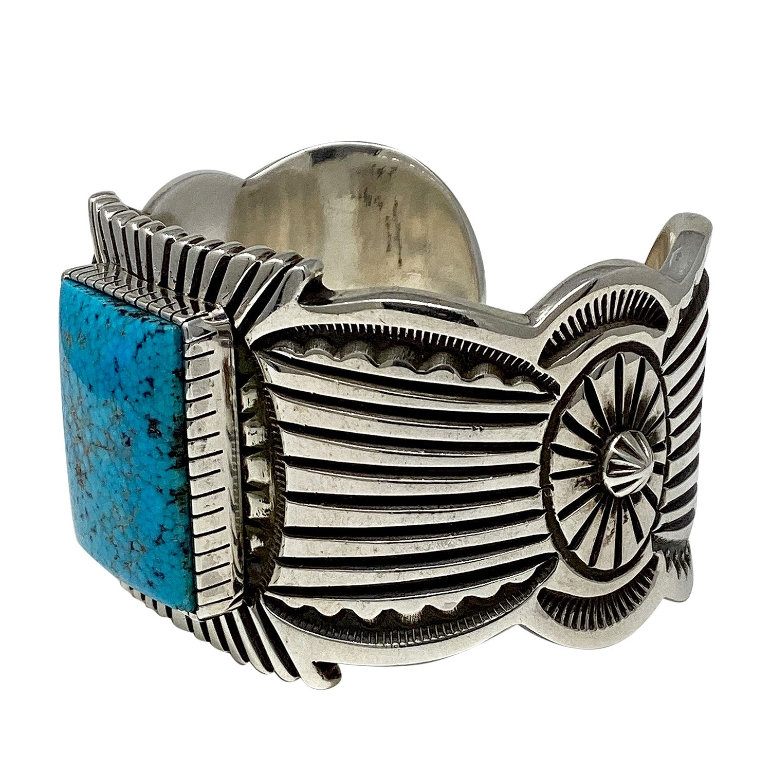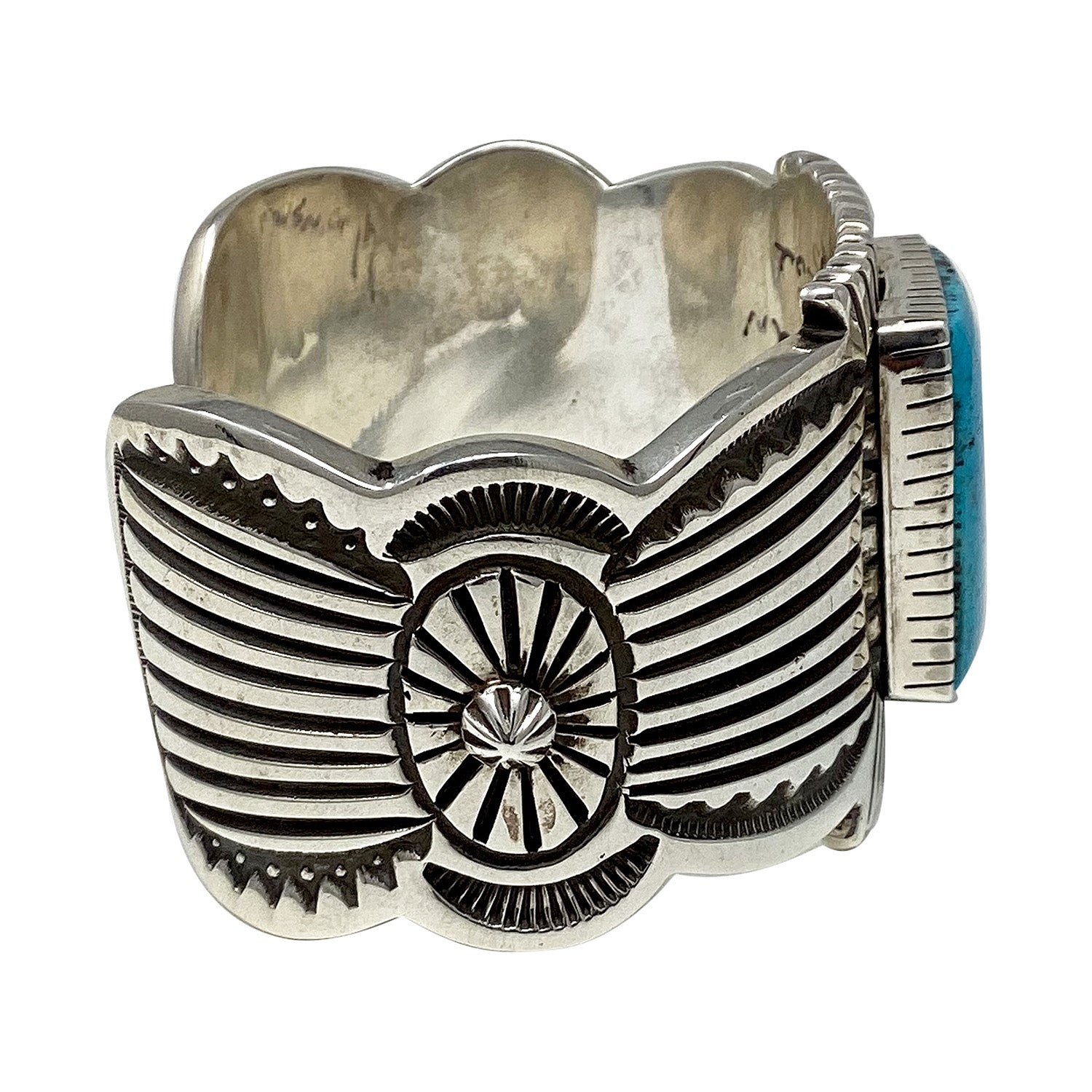 Navajo silversmith Terry Martinez made this amazing piece of silver and stone. Arizona is famous for turquoise, and Number Eight might be the most famous of them all. Since the late 1920s turquoise has been found on Navajo silver. The rock comes in many shades of blue and has a stunning matrix. This classic stone has that signature Kingman Turquoise look. Terry has set the stone on a heavy stamped bracelet shank. The silver work gives the cuff that desirable Navajo look and combined with the stone it gives you a piece of handmade art that you will definitely want to add to your collection. You don't get a whole bunch of opportunities to own a piece of Terry Martinez wearable art, so don't hesitate.