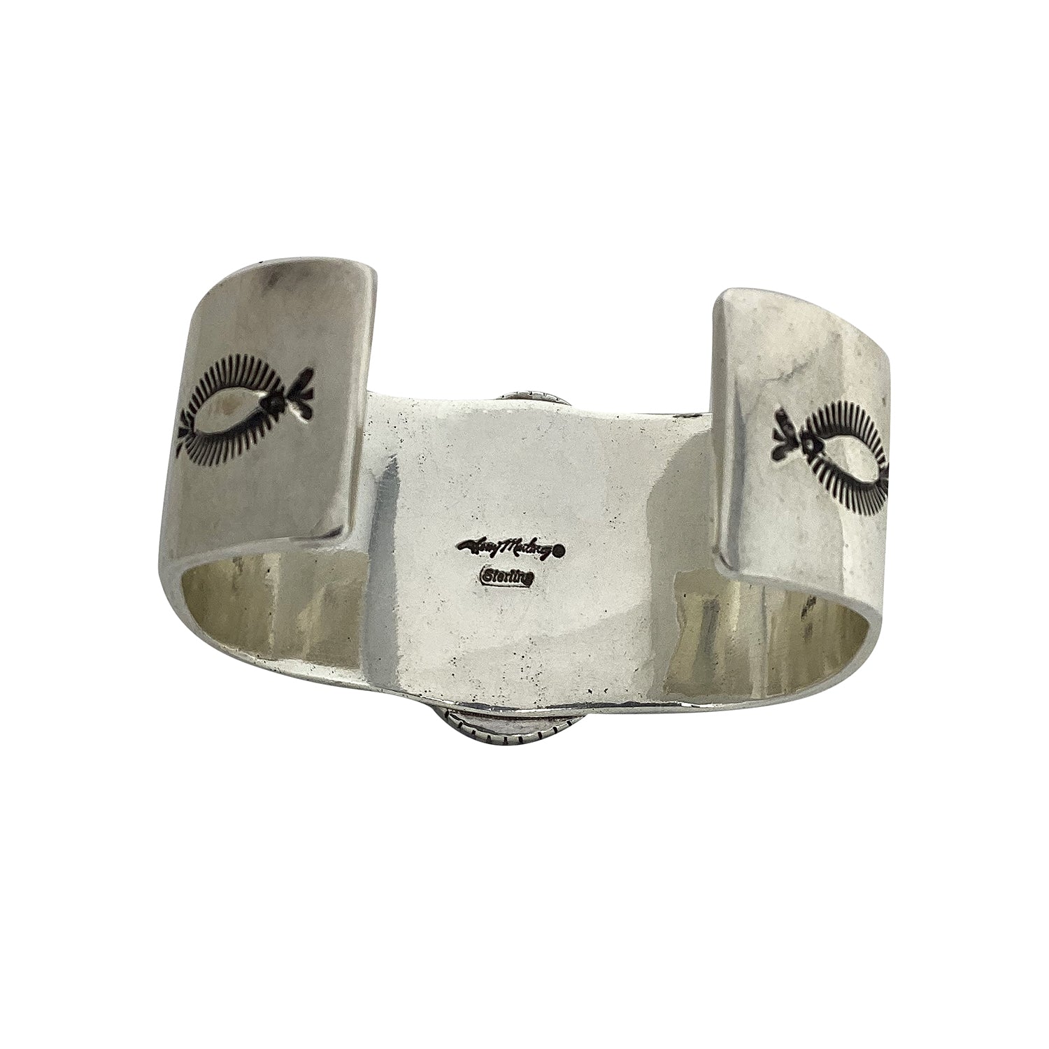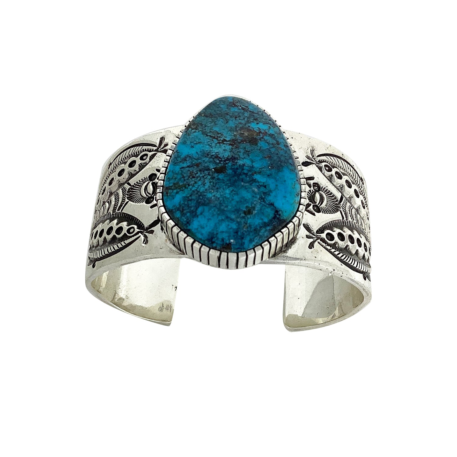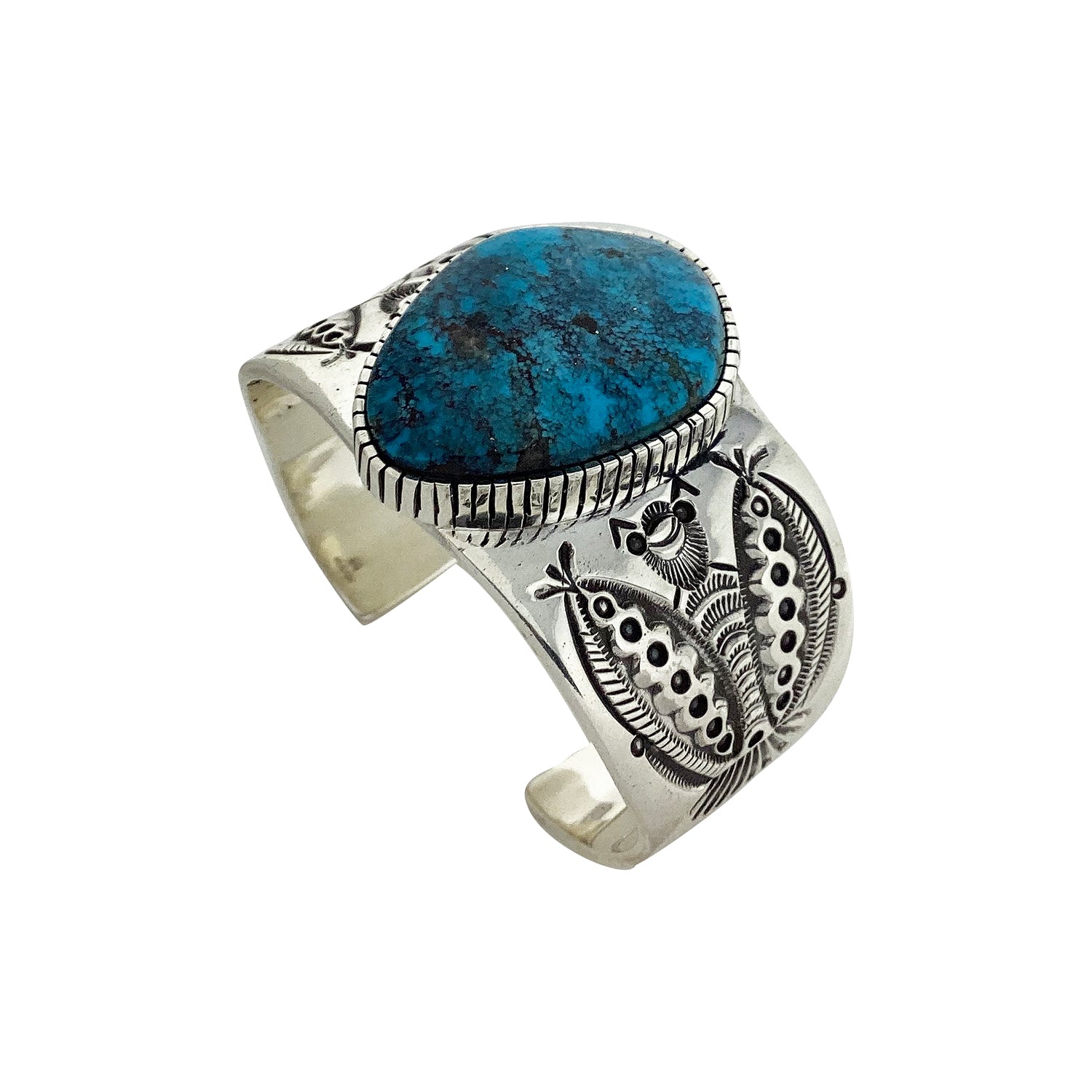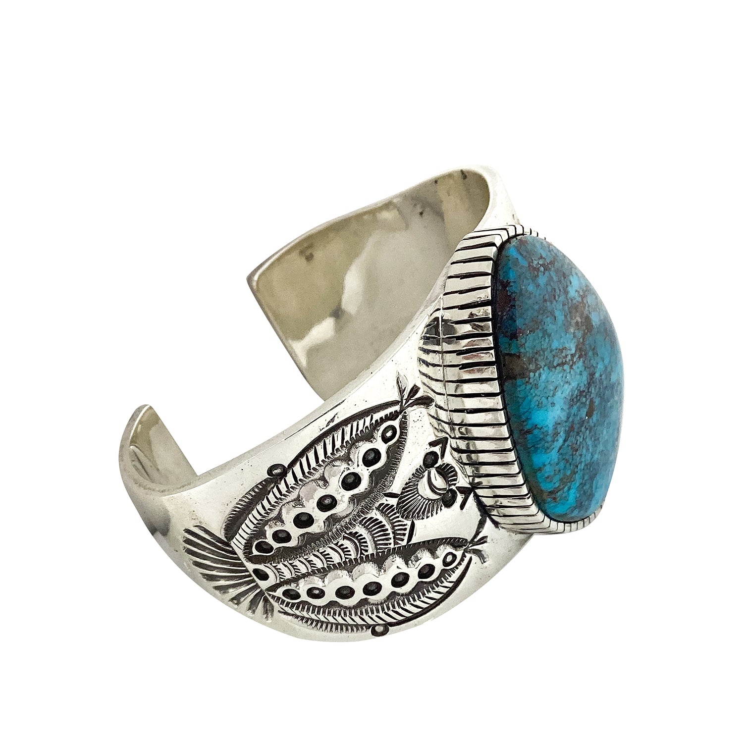 Navajo silversmith Terry Martinez loves to talk about his jewelry making. He is always trying to get his hands on great rocks and use traditional Navajo silver design to highlight them. Terry is capable of making some incredible pieces of wearable art, it is his patience and decades of experience. We always feel very fortunate to get his work in the Trading Post. This heavy stamped sterling silver cuff shows off an amazing piece of turquoise. The blue rock that is filled with a heavy dose of black and dark brown colored matrix is a freeform cut of Nevada Blue Turquoise. You will find that the rock radiates against the mirror shine of the silver.