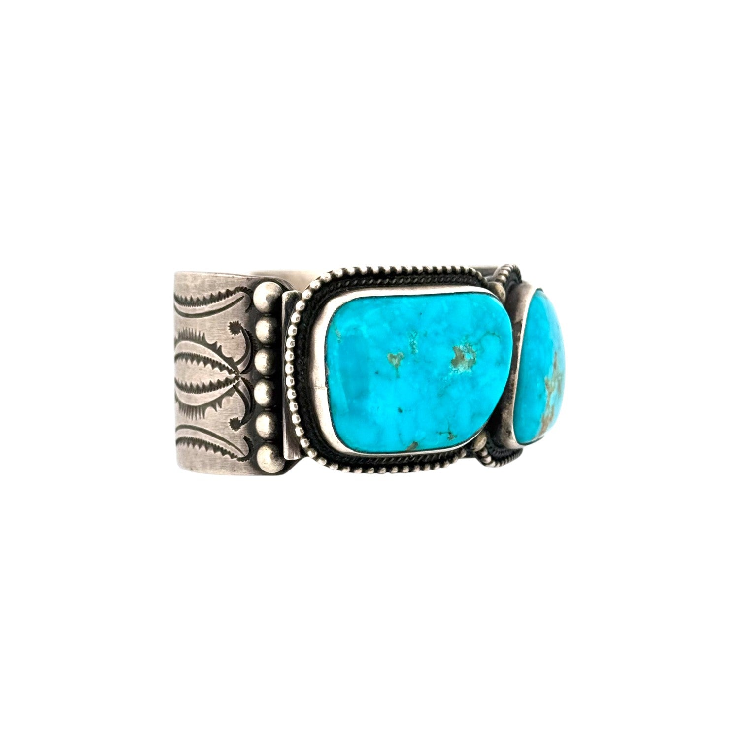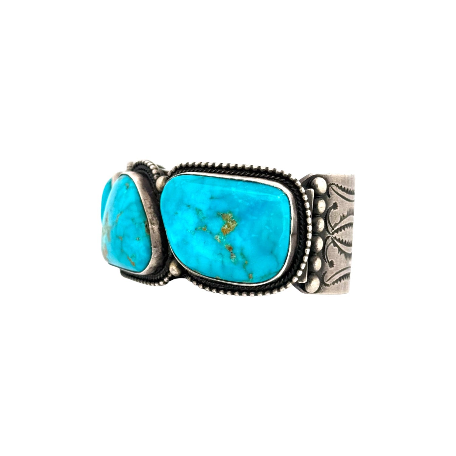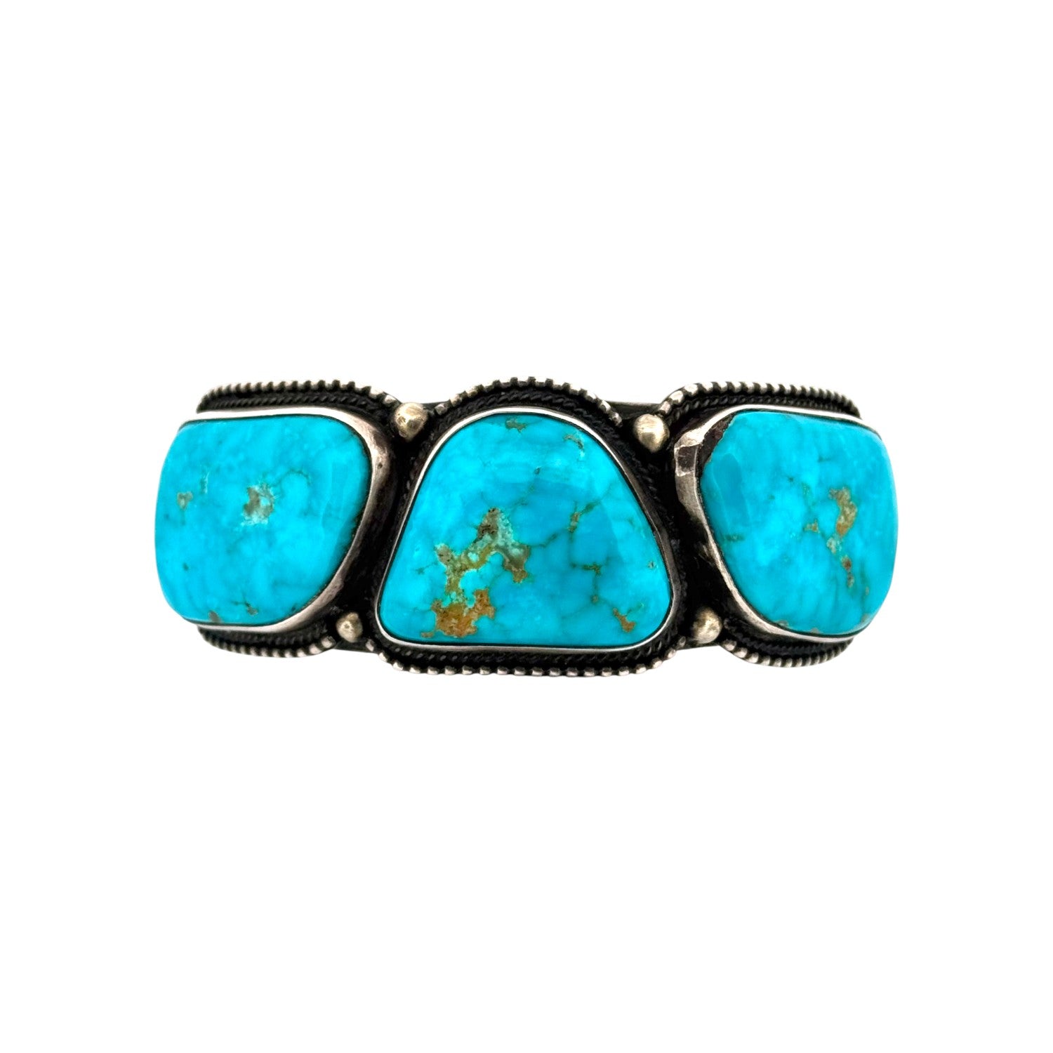 This Navajo bracelet by Calvin Martinez is a powerful example of traditional silversmithing paired with the beauty of Water web Kingman Turquoise. The cuff features three large turquoise cabochons, each with striking blue tones highlighted by intricate web-like matrix patterns unique to this variety of Kingman stone. The stones are set in bold bezels with fine silver beading along the edges, adding detail and contrast. The heavy sterling silver cuff showcases Martinez’s hallmark style; strong, balanced, and deeply rooted in Navajo tradition. The symmetry of the three-stone design gives it a timeless appeal, while the bold turquoise ensures it stands out as a statement piece. Substantial in weight and craftsmanship, it reflects both durability and elegance.