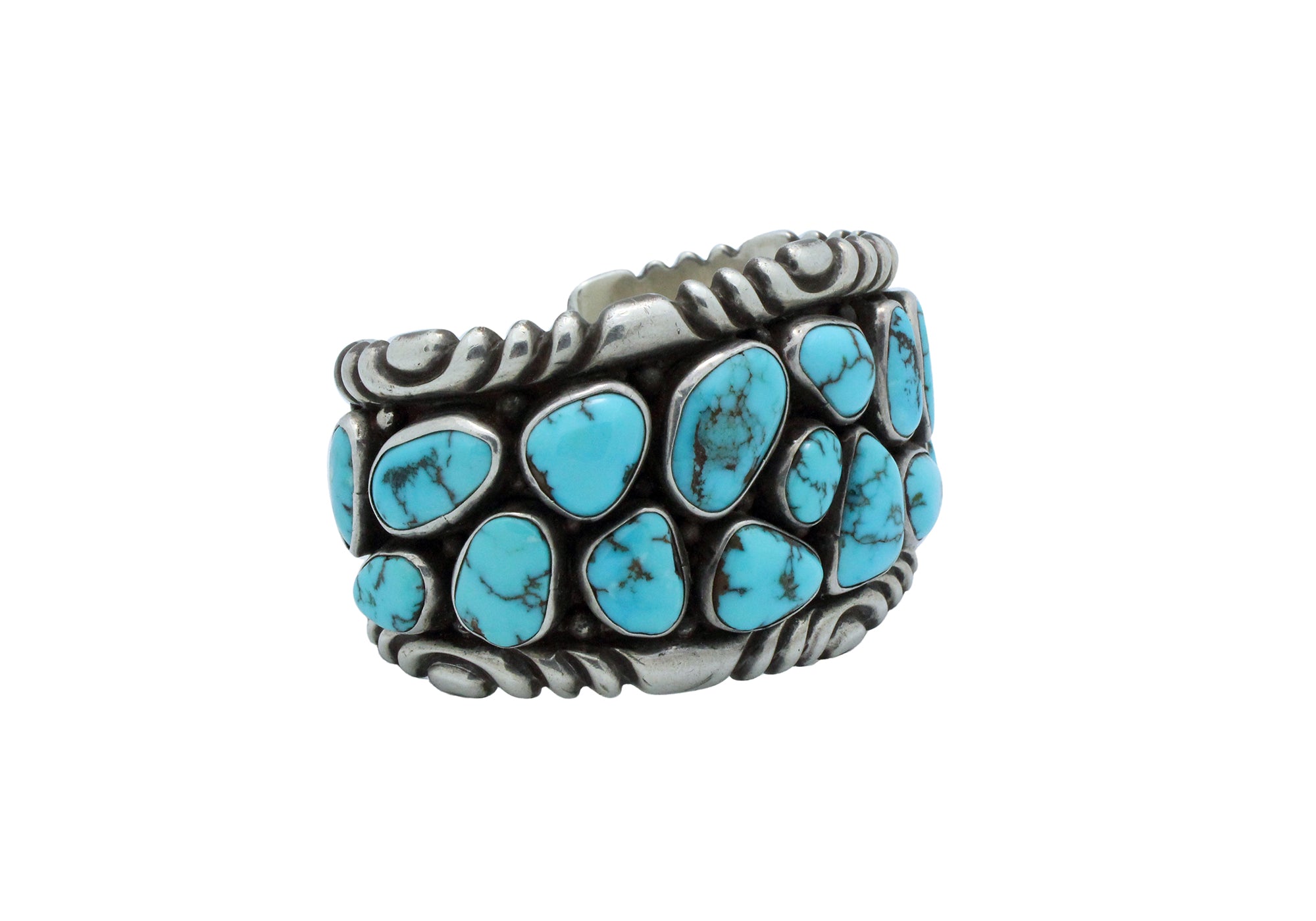 A number of great Navajo and Zuni artists have made this style of bracelet. Names like Henry Roanhorse, Ben Touchine and the late Robert Leekya loved this style. Heavy stamped silver borders surrounding incredible blue stones. Navajo silversmith Wilford Nez made this beauty. He has used a fascinating collection of Candelaria Turquoise stones that showoff an amazing blue color with that legendary maroon shaded matrix. A total of twenty stones fill this classic heavy Navajo bracelet. This is something that you will treasure for a lifetime.