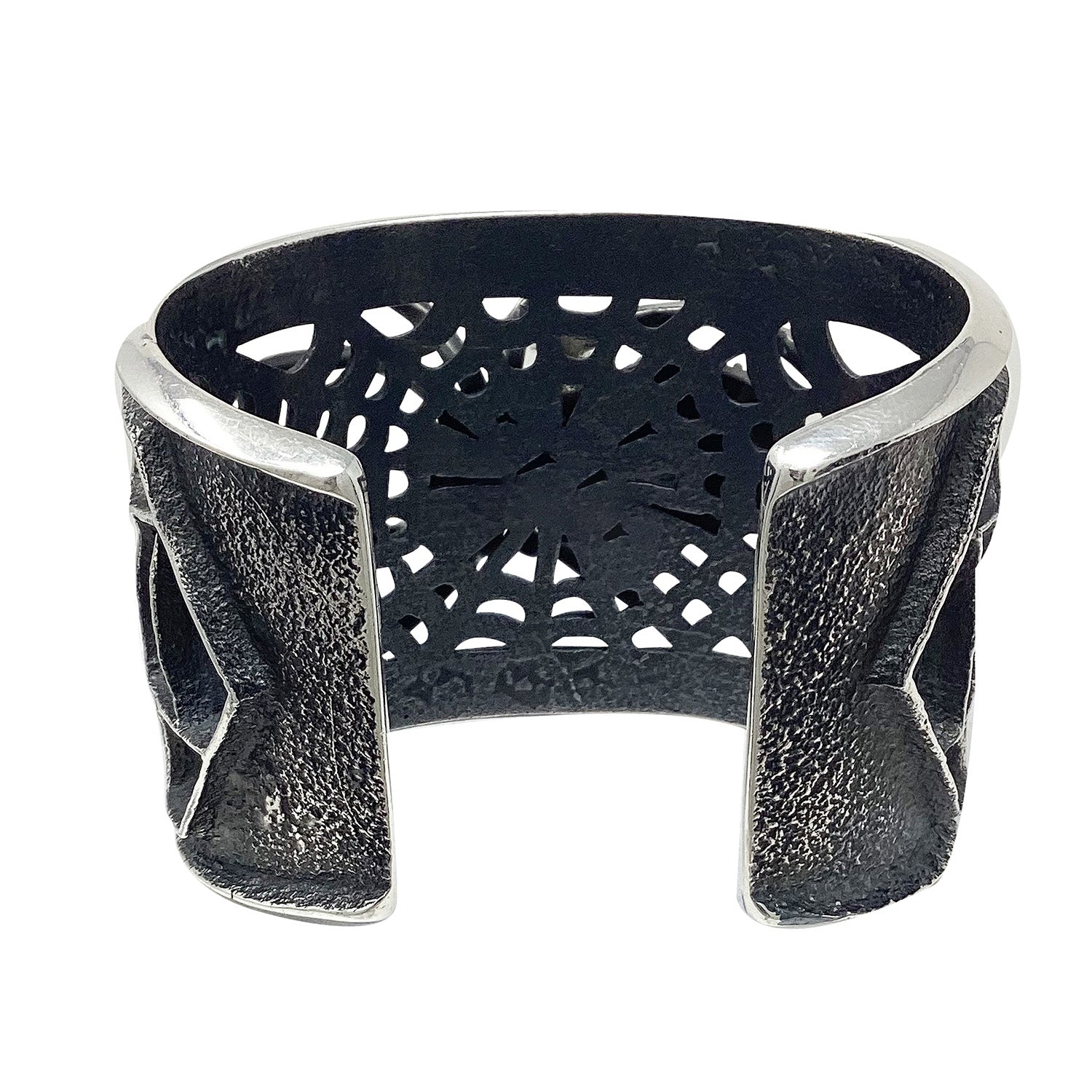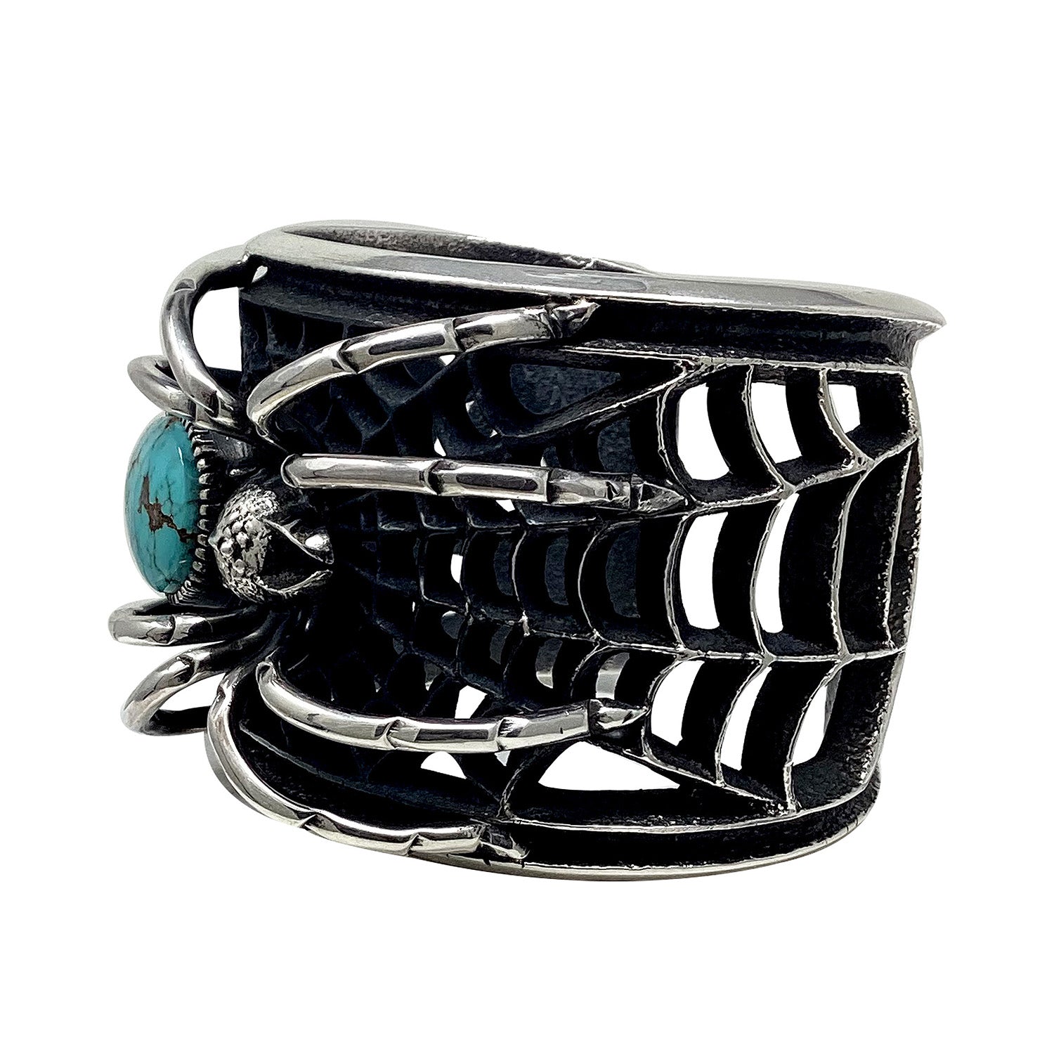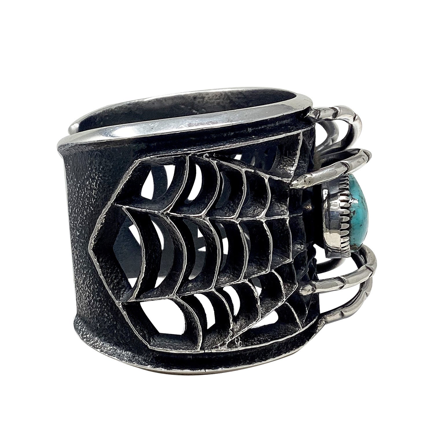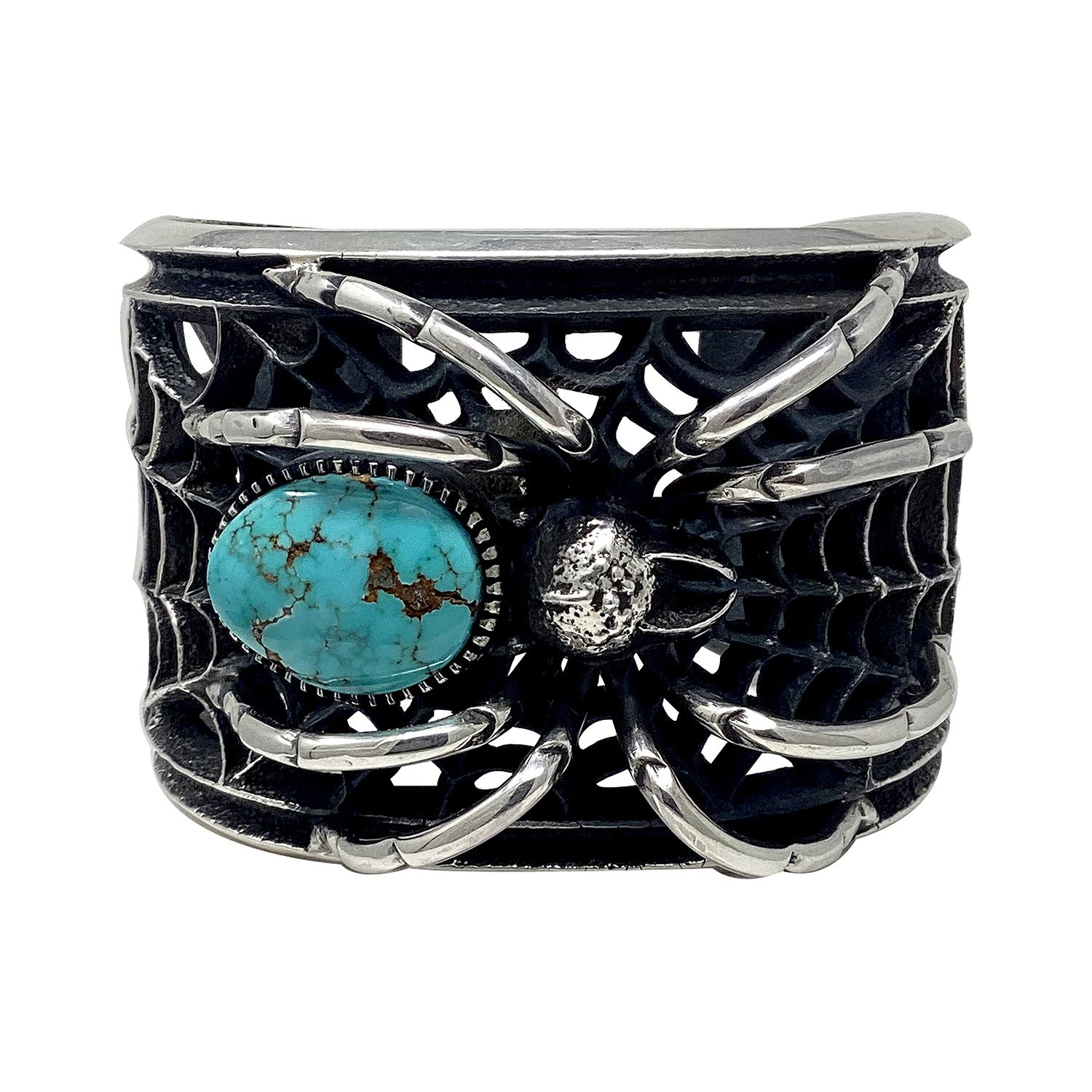 Navajo artist Floyd Parkhurst can turn silver and stone into a remarkable piece of art. This talented artist is turning out some very impressive pieces of handmade art. He is also versatile; we get pieces done using tufa casting techniques as well as traditional fabricated silver. This incredible bracelet is a classic tufa cast sterling silver. You are going to be blown away by the amount of silver design that fills the cuff, including the stunning bezel and spider design that surrounds the stone. All of the silver work is appropriate for the collectible Turquoise Mountain rock found at the center. This vibrant turquoise stone has that signature color along with an amazing brown matrix. We don't get many pieces by Floyd, enjoy his stunning work.