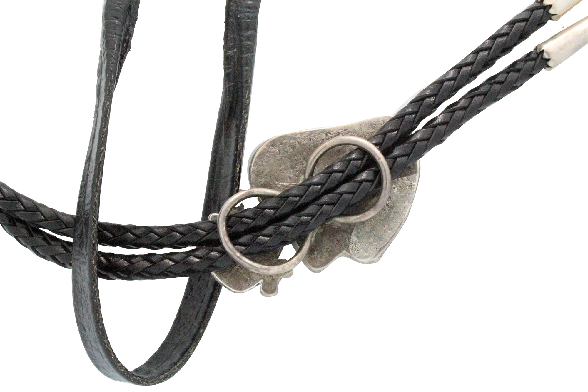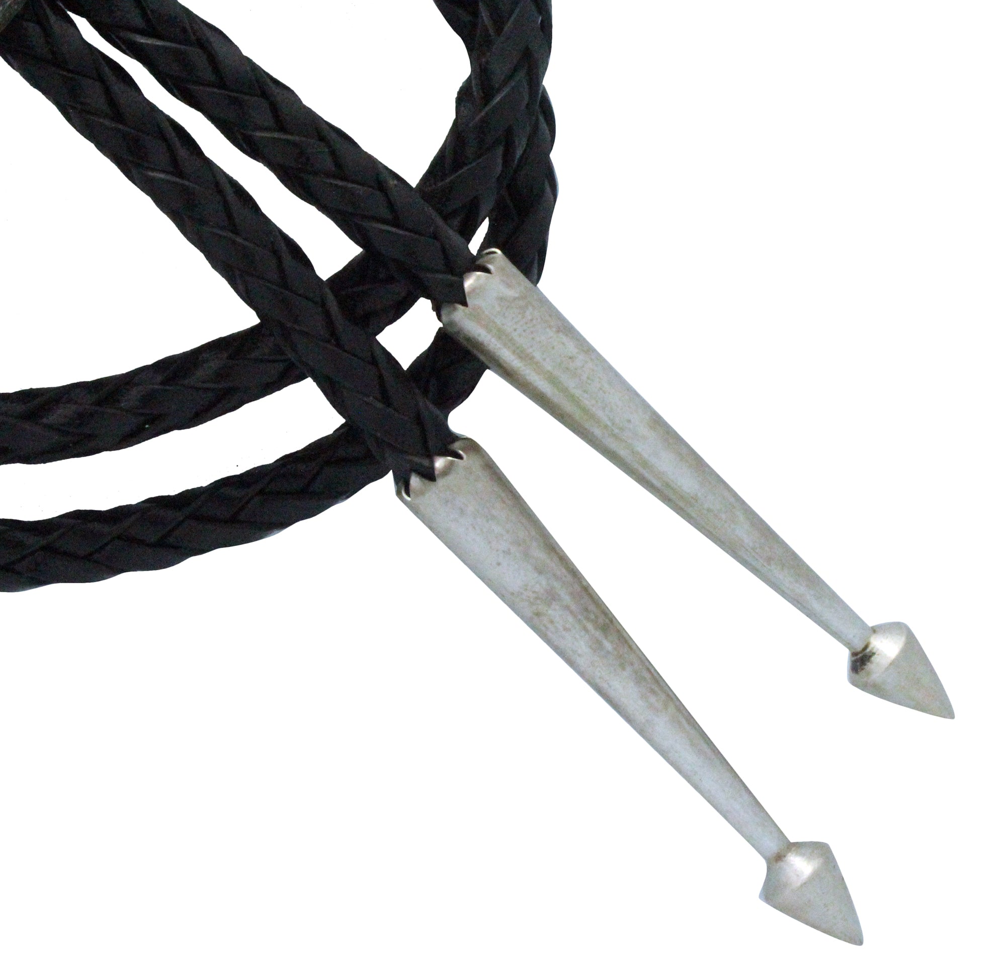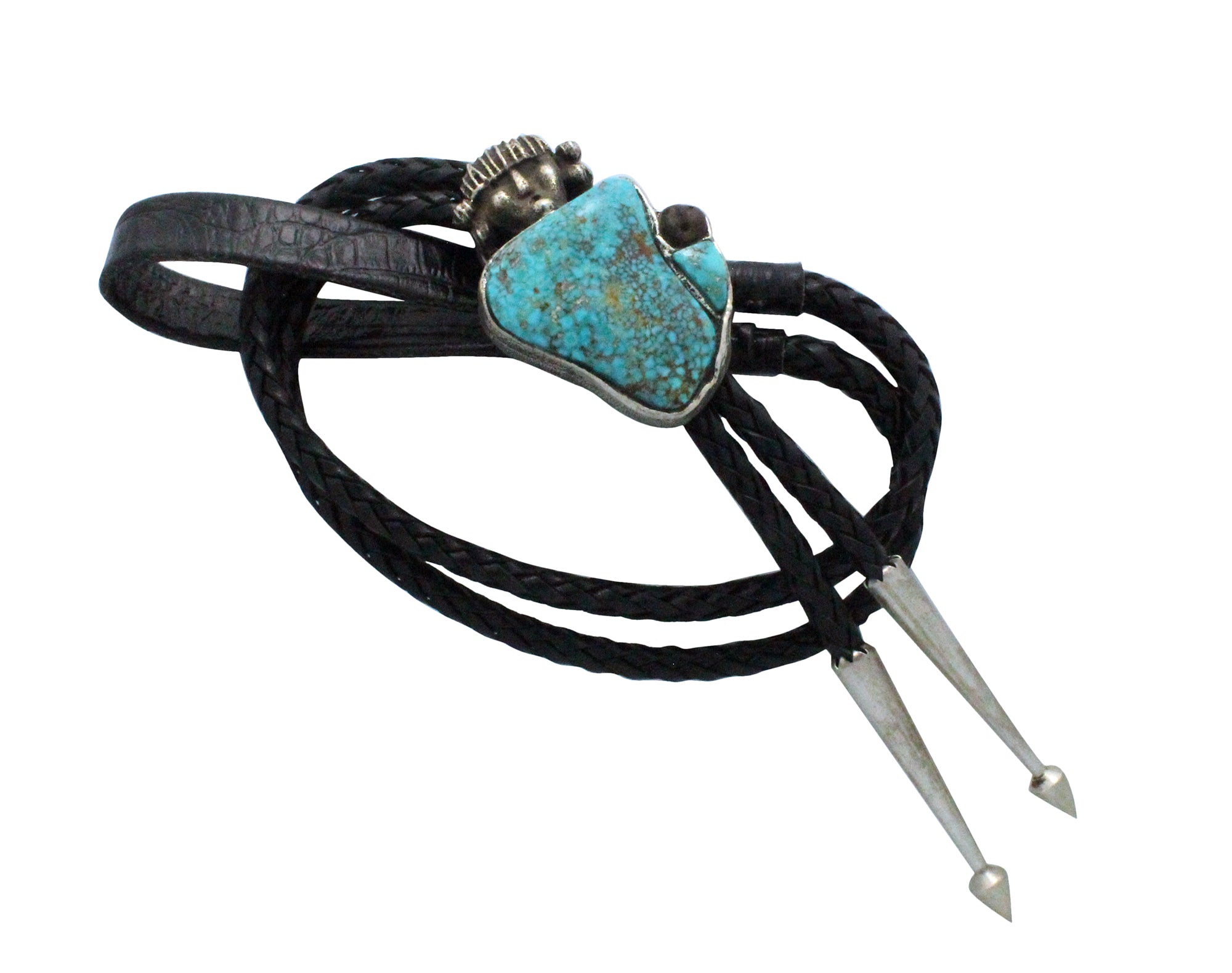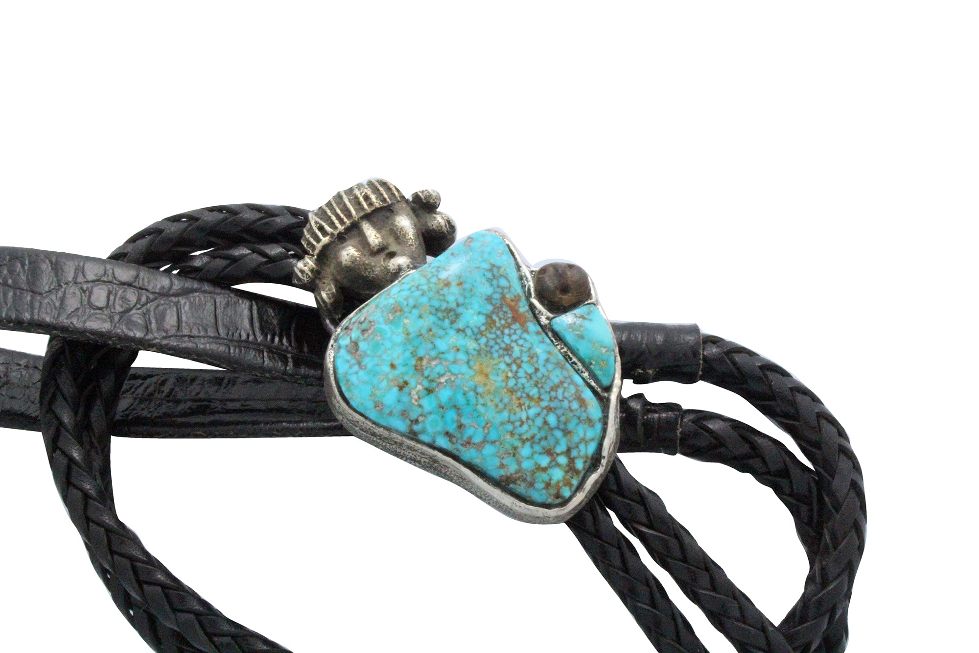 Navajo tufa cast artist Philander Begay makes incredible pieces of hand-carved silver art. Philander is an award-winning artist who is influenced by many powerful sources. One is his Native American culture that is filled with a long rich history here in the Four Corners. He also draws from the Native American art that came before him, like the work of Charles Loloma. Last, his work reflects on his childhood where he spent many days on the land of the Hopi. This bolo pulls from the Hopi influence with a tufa carved Hopi Maiden along with a child. The two figures surround two amazing cuts of Turquoise Mountain. Finished with a braided leather cord and sterling silver tips.