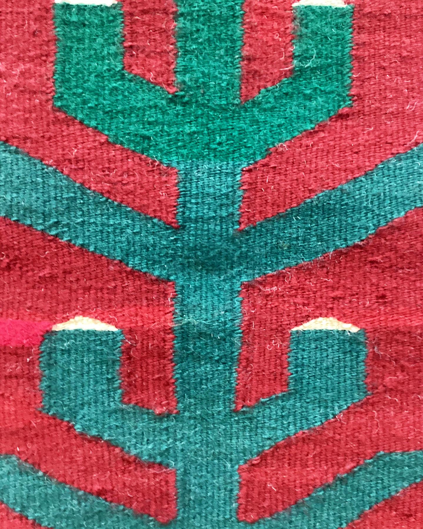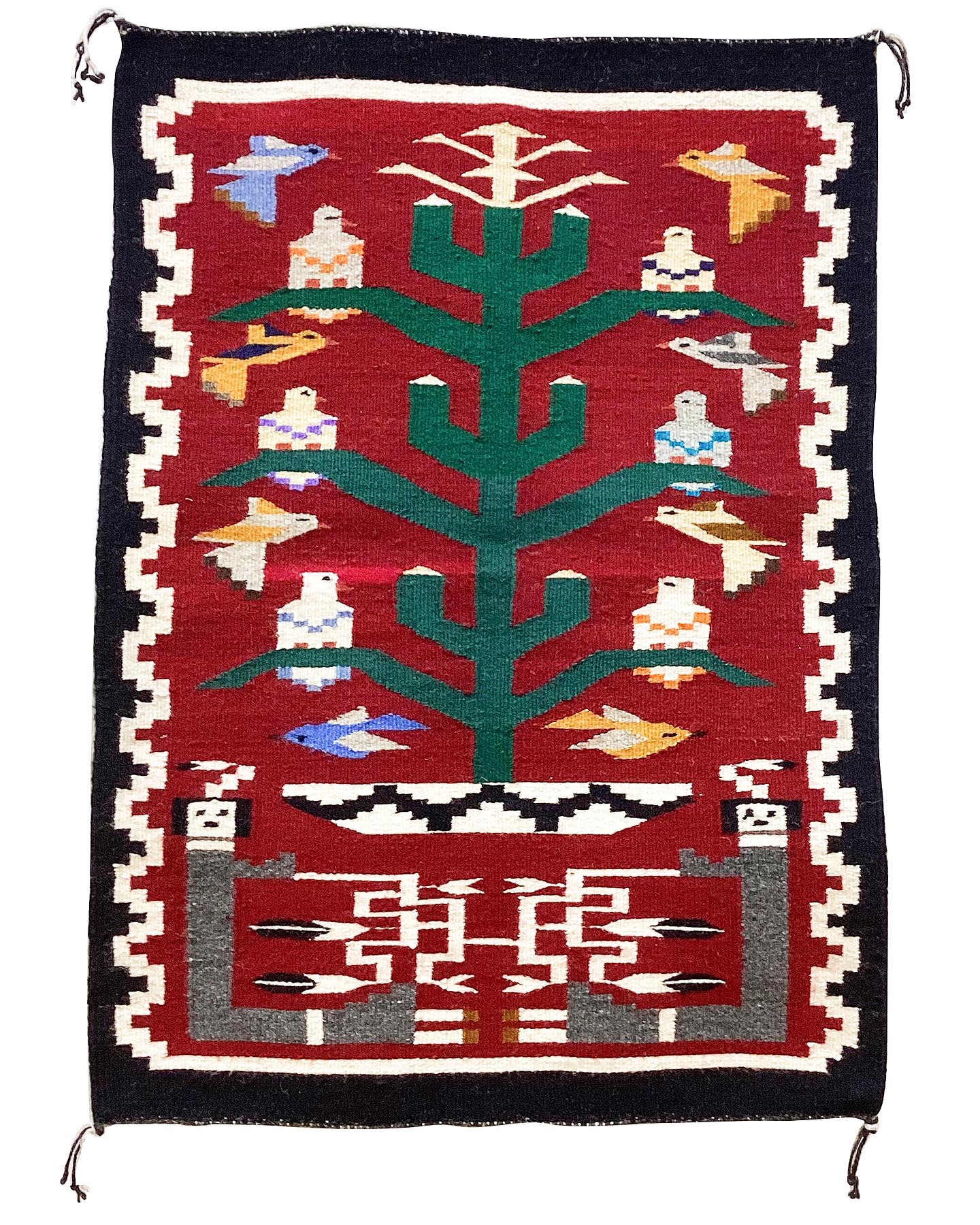 From the beginning of recorded history man has revered trees as sacred symbols of creation, fertility, resurrection and immortality. With roots firmly planted in the earth, sturdy trunks and branches reaching to the sky, trees were believed to connect the three realms of existence: underworld, terrestrial and celestial. Since the days of Mesopotamia trees such as the palm, ash, beech, oak and pine have been viewed as ladders leading from the unconscious to enlightenment, sheltering canopies for all of creation, shamanic routes to knowledge and pillars between heaven and earth. The Tree of Life Navajo Rug, or Cosmic Tree, is associated with the sacred feminine, with springs, vegetation and life giving waters.