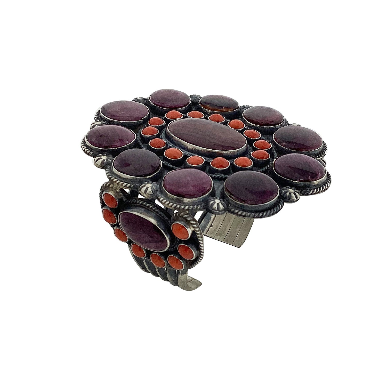 Navajo silversmith Anthony Skeets made this very impressive piece of handmade cluster art. You can always count on Anthony to make something different. This talented artist loves doing clusters and makes this amazing piece in many different stone patterns. He does the impossible again with this crazy cuff, an explosion of stone cluster. Anthony has styled a gorgeous summertime bracelet with lots of Coral that is mixed with rich purple spiny oyster shell stones. Anthony has surrounded the stone with a twist wire border, and given the silver his signature brushed finish. Anthony uses a comfortable five-triangle wire bracelet shank, one that displays the large cluster top perfectly. If you want something that is different and jaw dropping you found it.