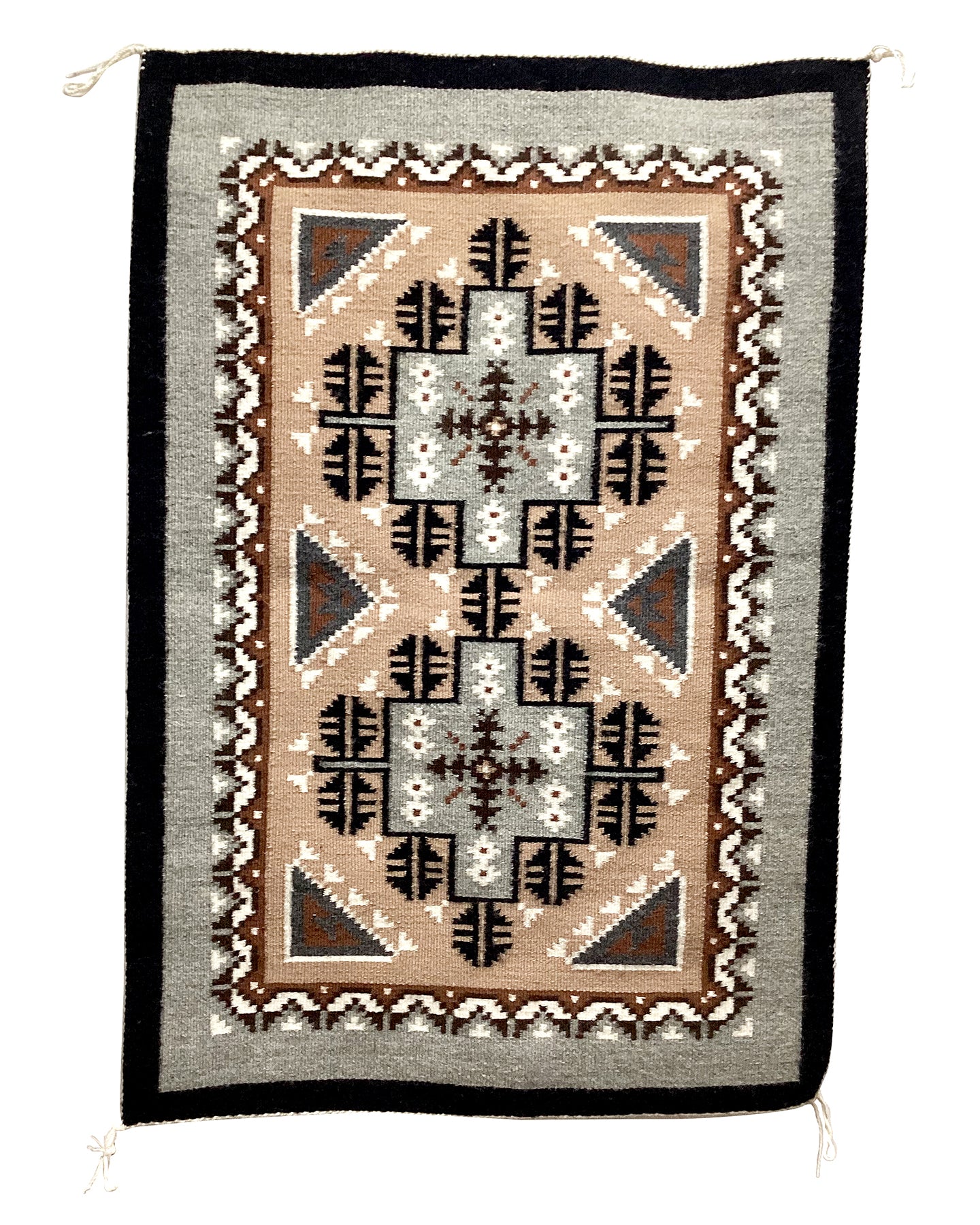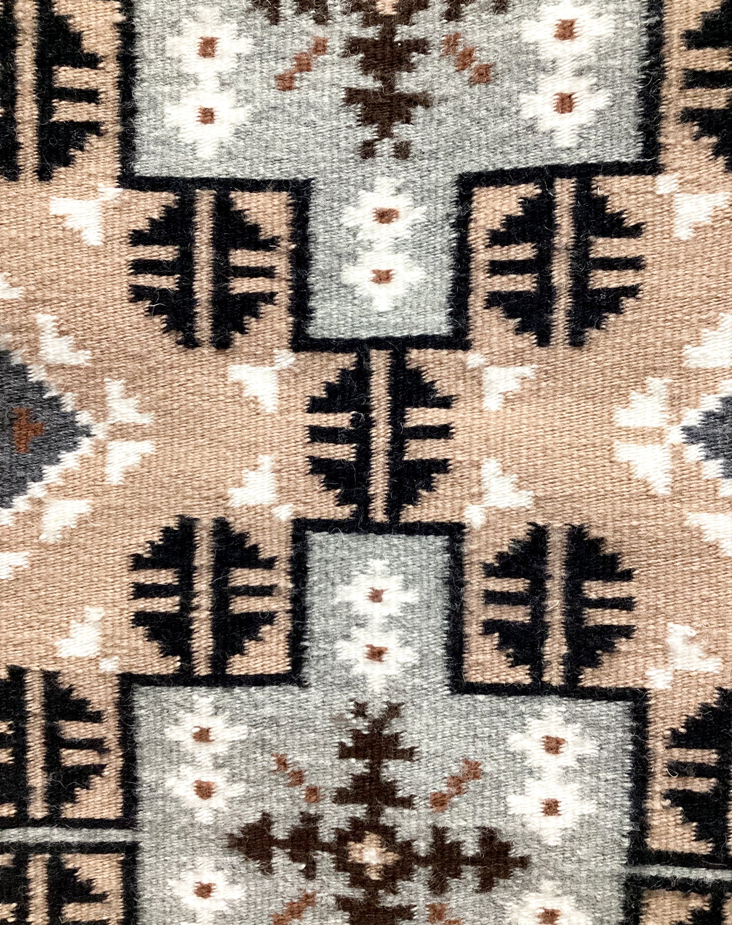 The favorite weaving for many collectors is the Two Grey Hills. Famous because of the natural sheep colors and the stiff feel of churro wool. Many Two Grey Hills will have very complex patterns, and it takes a significant amount of time to realize all of the hidden symbols. Patterned after the classic Diamond designs this is definitely a style you need in your growing collection of rugs.