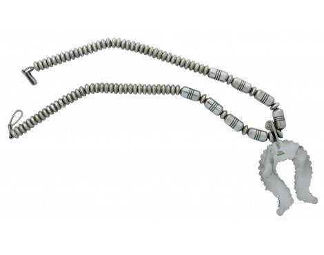 Navajo artist Thomas Jim doesn't make jewelry, but instead makes pieces of wearable art. Every piece of this necklace was planned. The combination of saucer and barrel beads are perfect. Simple lines decorated the heavy barrels. You will notice the naja is a combination of styled drops, cutouts, twisted wire and traditional Navajo stamp work. Thomas shapes the naja in a classic narrow shape. Then he gives the naja a mirror shine while the beads have a more rustic brushed finish, that combination seems unusual but works magnificently. As soon as you pick this necklace up you know that you are holding something very special. Check out the online Trading Post for more of Thomas Jim wearable art.