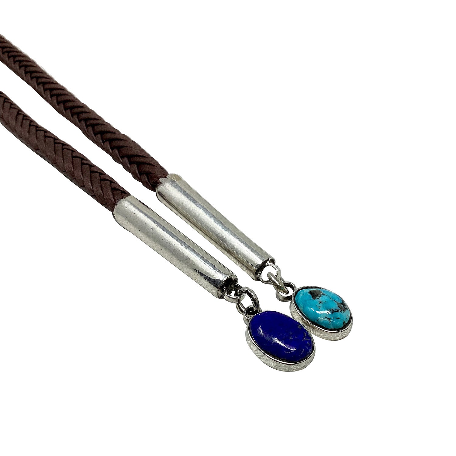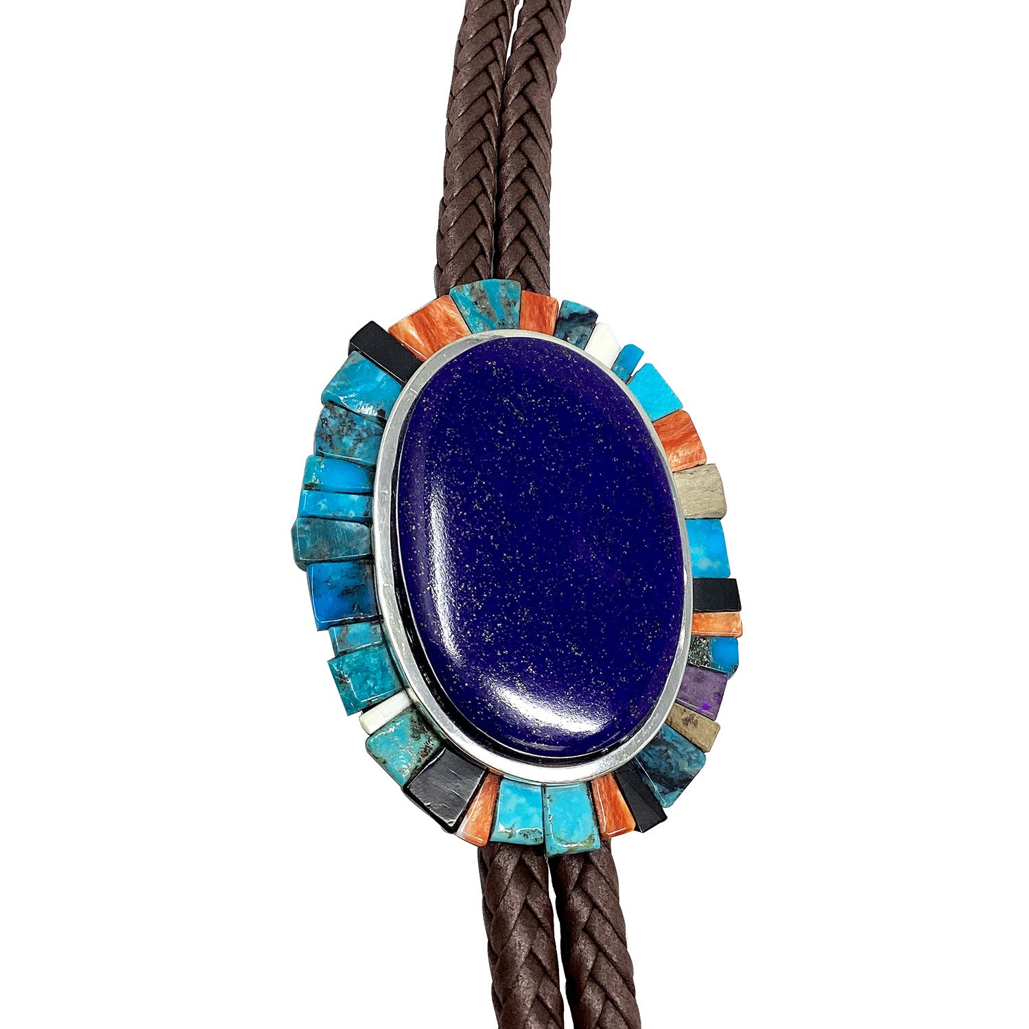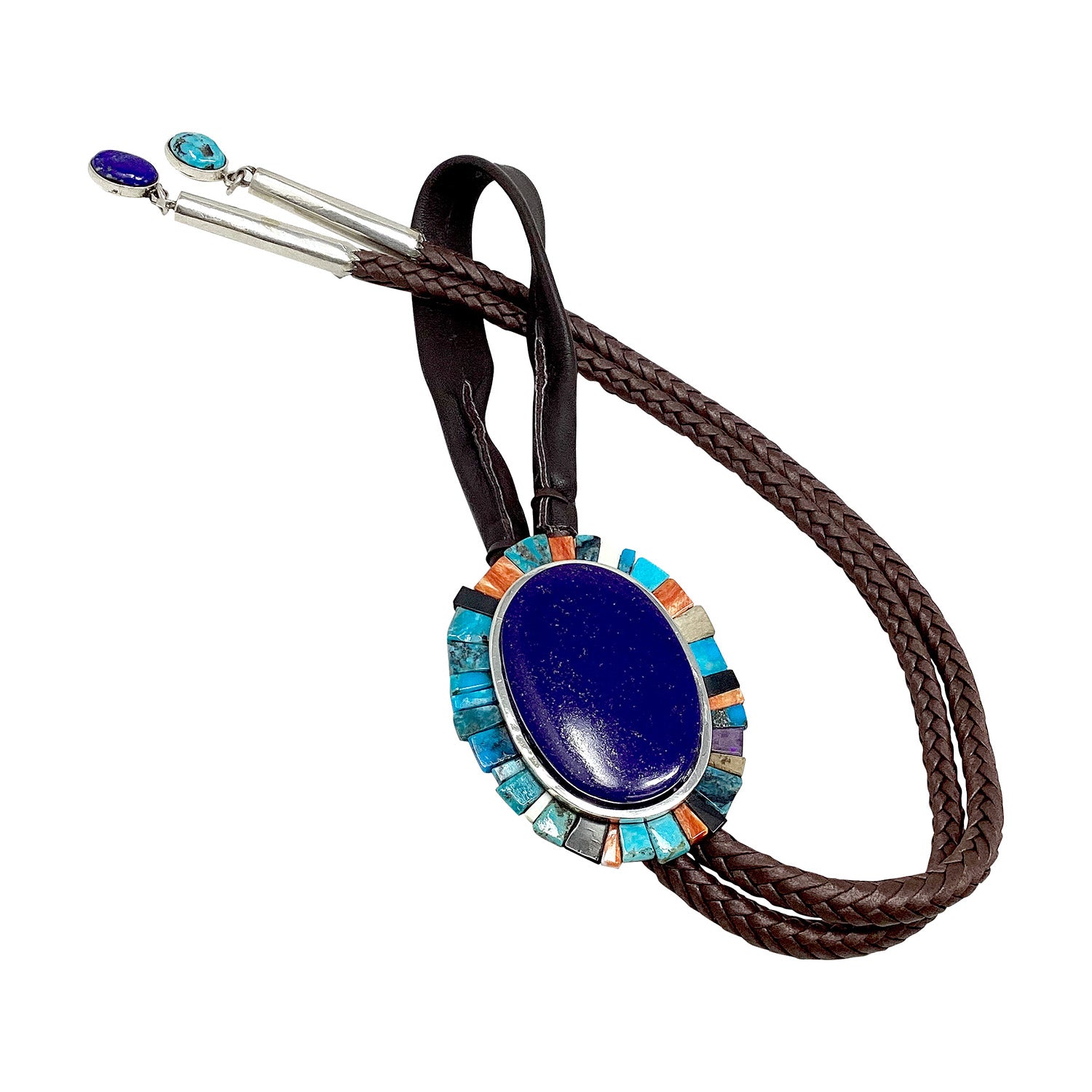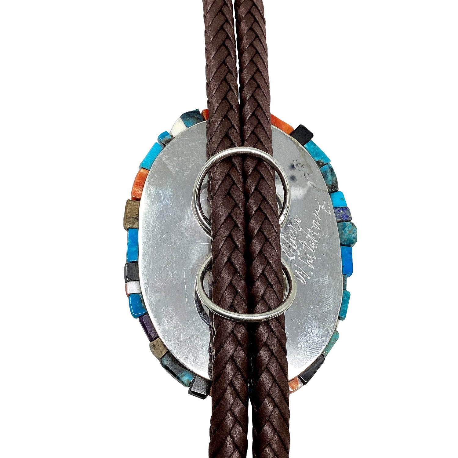 Navajo artist Olivia Whitethorne made this fascinating bolo. She is the wife of Hank Whitethorne and the two artists have a very similar style of handmade art. The bolo has an inlaid style that is a part of the traditional Navajo culture. Olivia uses traditional beliefs and captures the mystical powers of the Divine Dine in this original piece of handmade art with the various stone colors. Olivia uses a combination of jet, shell, lapis, Sugi lite, lapis, and turquoise to fashion this gorgeous bolo. It is on a heavy brown leather braided cord and finished with nice handmade sterling silver tips. Make sure to add this to your Whitethorne collection.