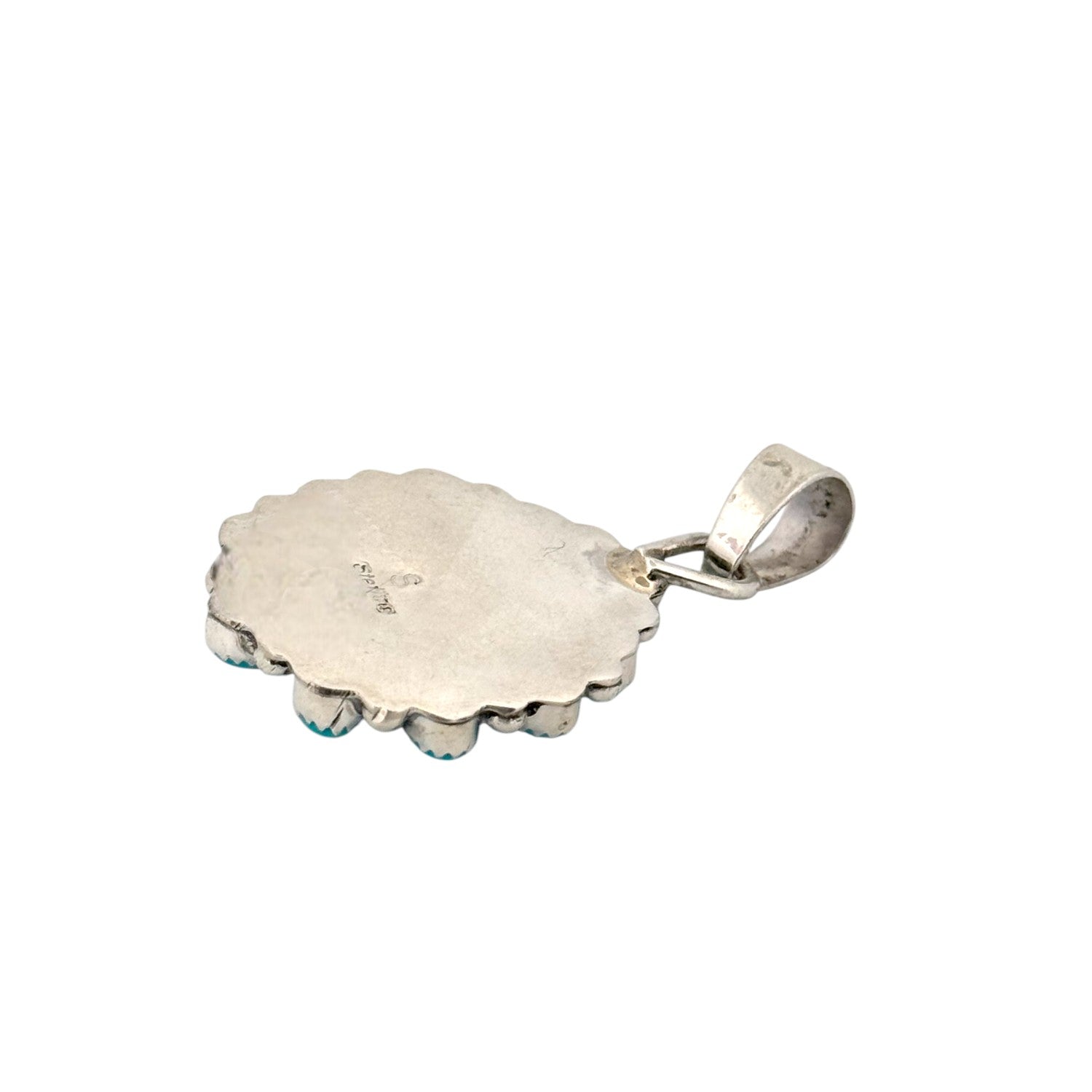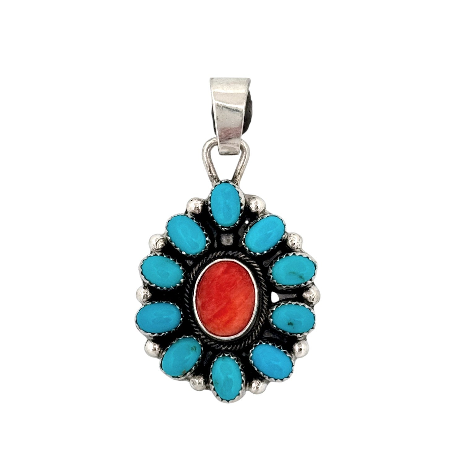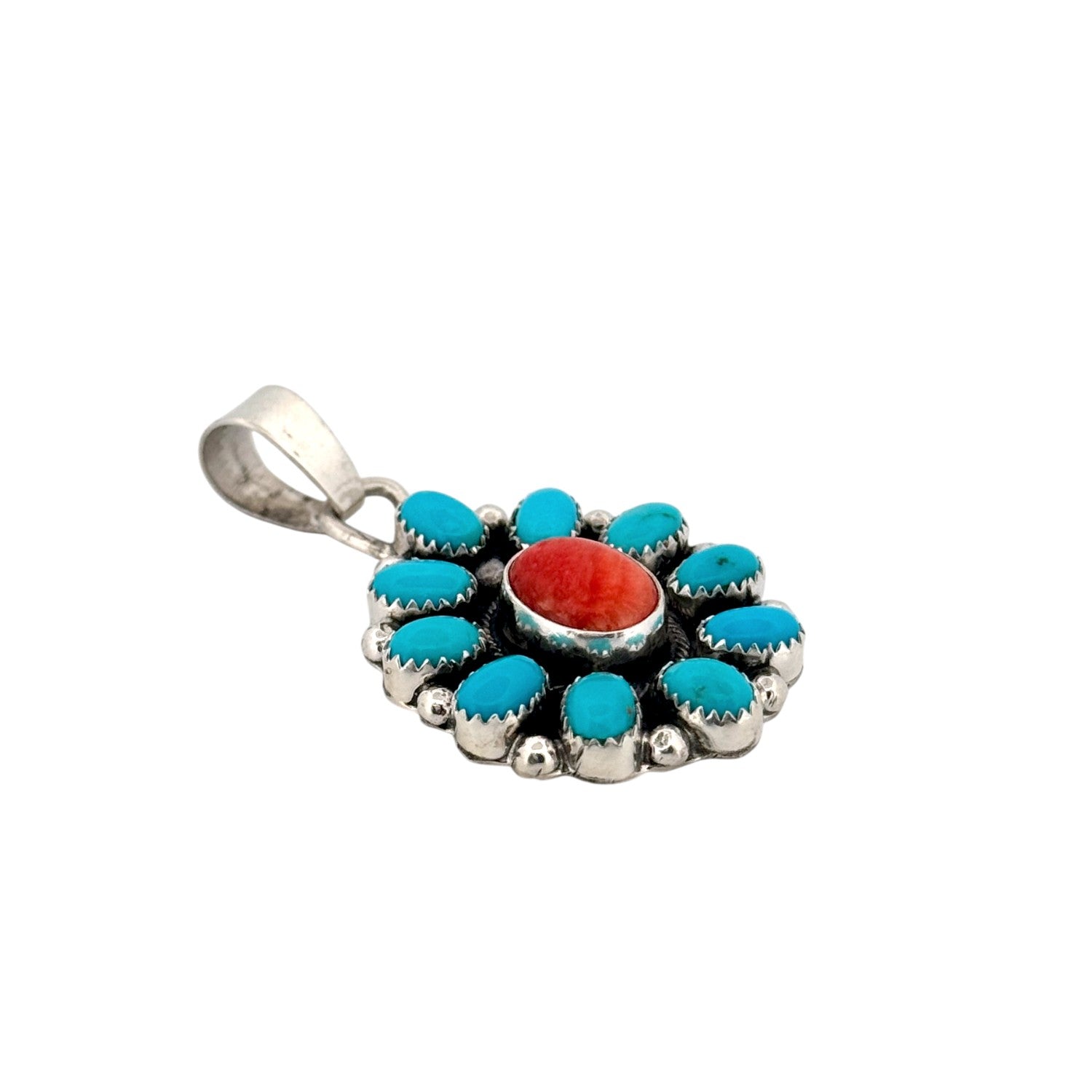 Handcrafted by acclaimed Navajo silversmith Sheila Becenti, this multi-stone sterling silver pendant beautifully unites tradition and artistry. The design features a radiant red spiny oyster shell centerpiece, surrounded by a brilliant halo of natural turquoise cabochons, each stone hand-selected and set with precision. The vivid contrast between the turquoise and coral hues captures the spirit of the Southwest where desert skies meet sunlit canyon walls. Finely detailed sterling silver beadwork frames each gem, reflecting Becenti’s dedication to Navajo silversmithing excellence and her deep cultural roots. Every element of this pendant tells a story of balance, craftsmanship, and heritage passed through generations.