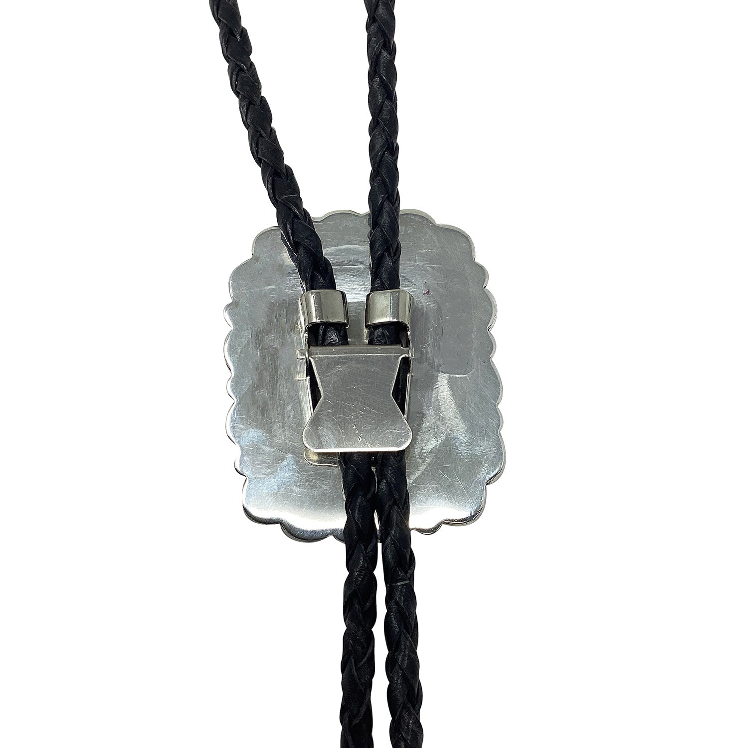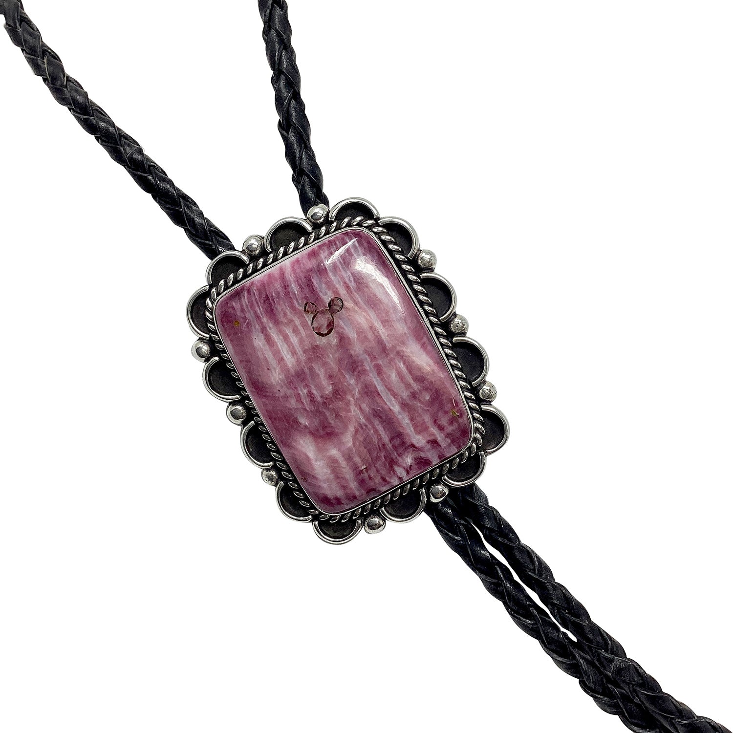 Navajo silversmith Albert Begay made this beautiful one stone bolo. He uses a good size spiny oyster stone that is a part of a unique collection. Albert uses a Purple Spiny Oyster stone to give the bolo an eye-catching design. The Purple oyster stone sits on a sterling silver plate with handmade silver twist wire and handmade drops on the side. Along the edge are handmade waves of silver to bring this gorgeous bolo together, with a mirror polished finish. Add this bolo to your collection and feel free to look at Albert's other pieces of jewelry.