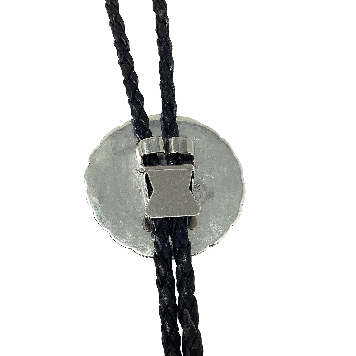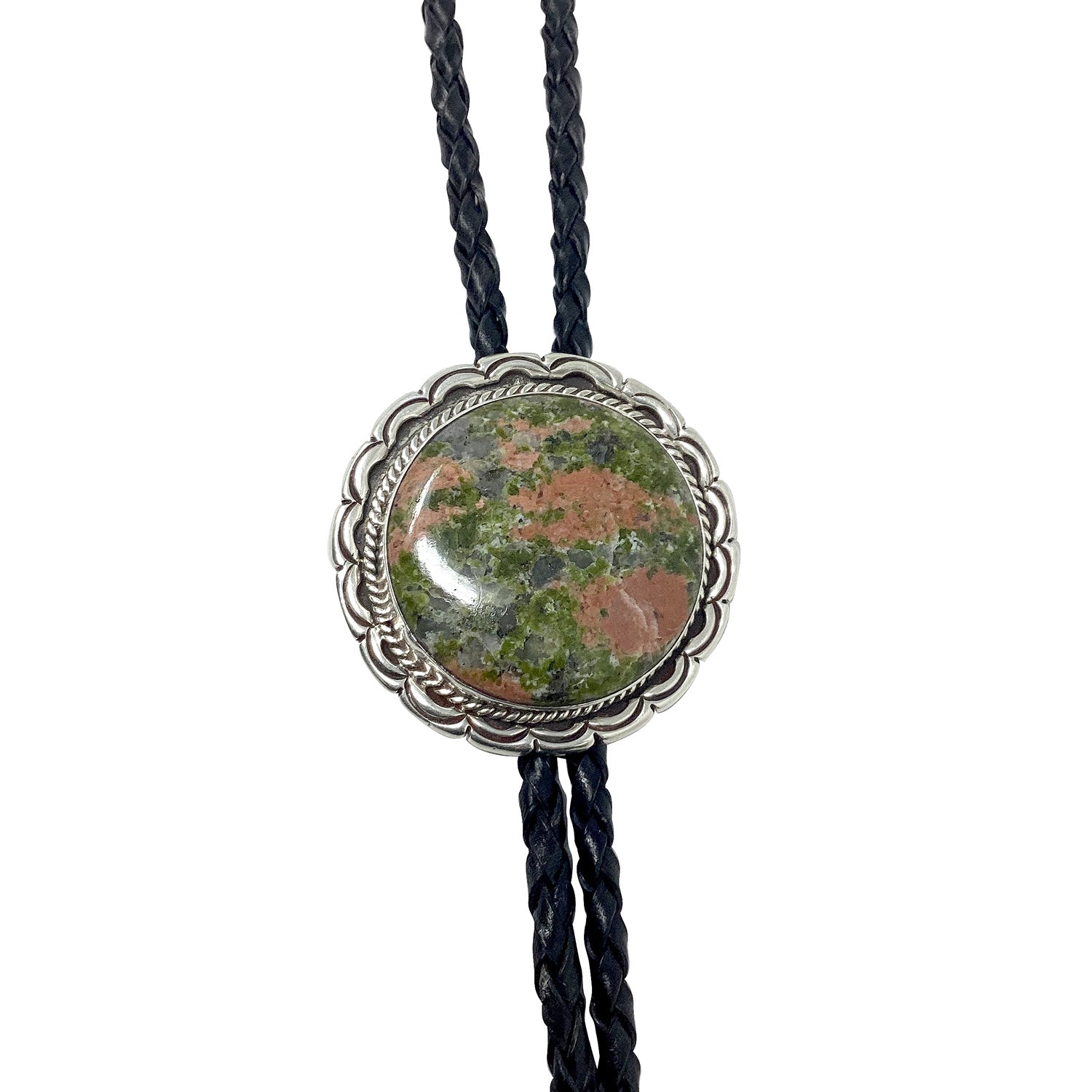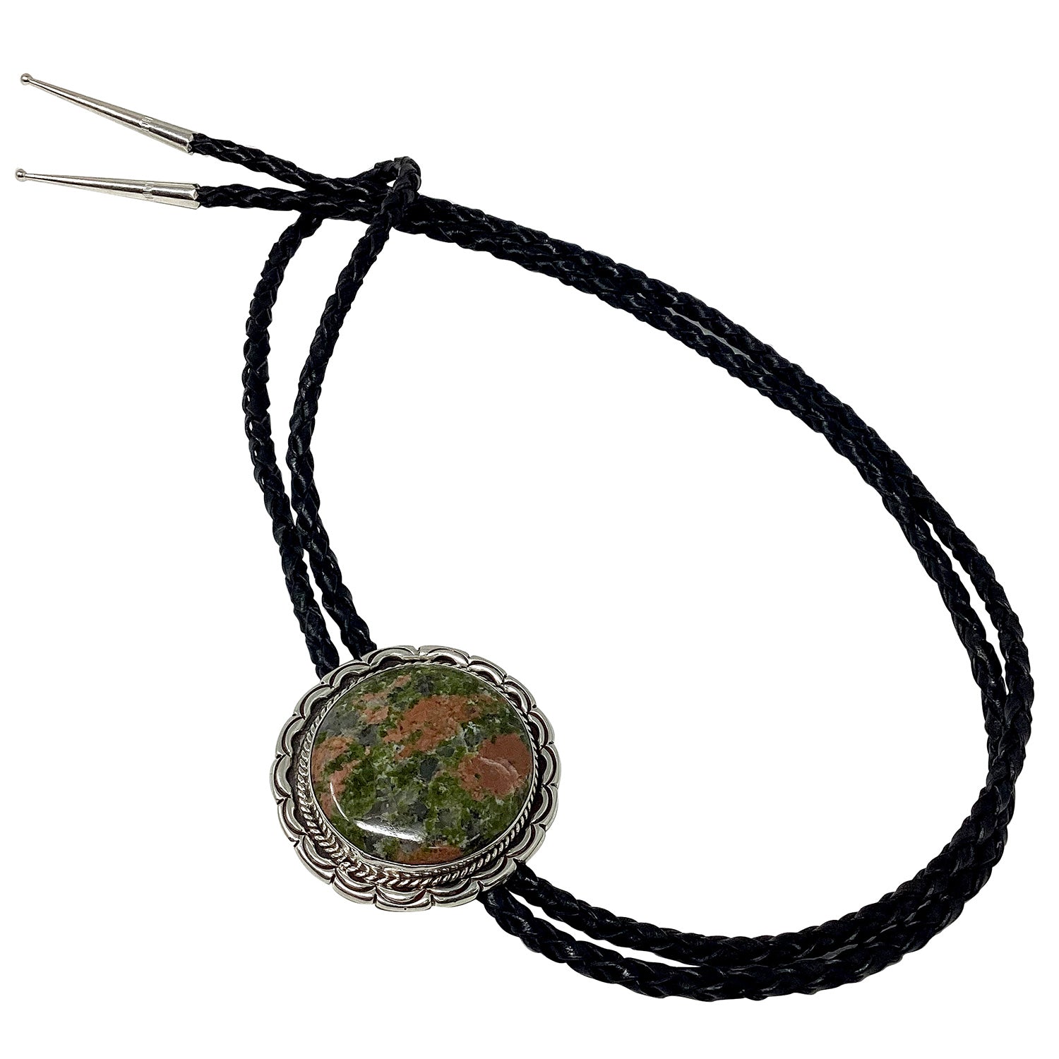 Navajo silversmith Albert Begay made this beautiful one stone bolo. He uses a good size Unakite stone that is a part of a unique collection. Albert uses a round Unakite stone to give the bolo an eye-catching design. The Unakite stone sits on a sterling silver plate with handmade silver twist wire and deep stamping cuts surrounding the stone. And around the stone is a smooth bezel, with a mirror polished finish. Add this bolo to your collection and feel free to look at Albert's other pieces of jewelry.