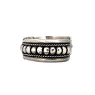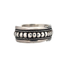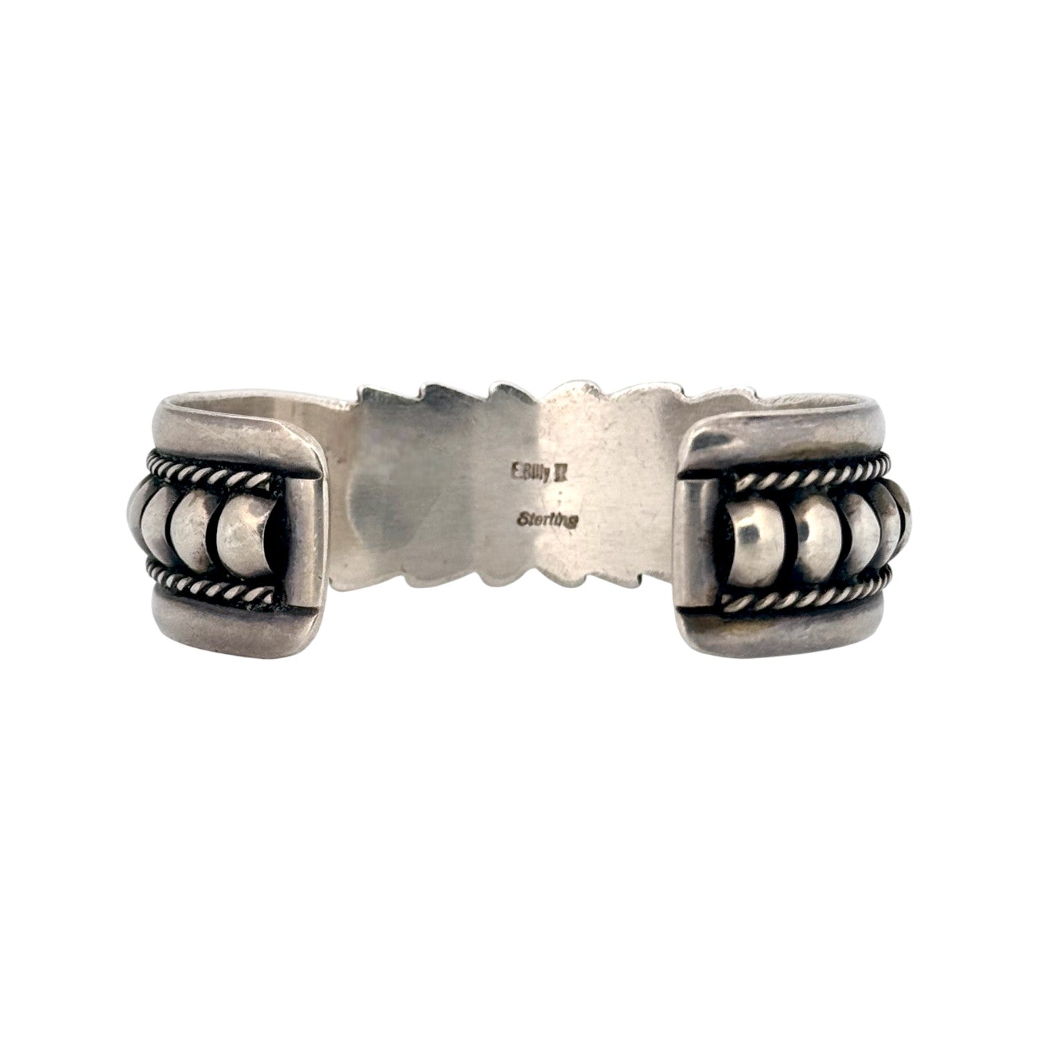 This masterfully crafted Navajo bracelet by E. Billy showcases the timeless artistry of traditional silverwork. Made from solid sterling silver, the cuff features bold repoussé domes framed by elegant twisted rope accents and intricate hand-stamped designs. The combination of texture and symmetry gives this bracelet a strong yet refined presence. Its substantial weight and craftsmanship reflect the silversmith’s attention to detail and deep connection to Navajo heritage.
