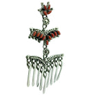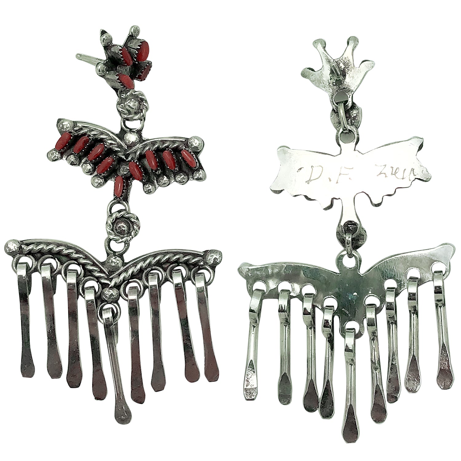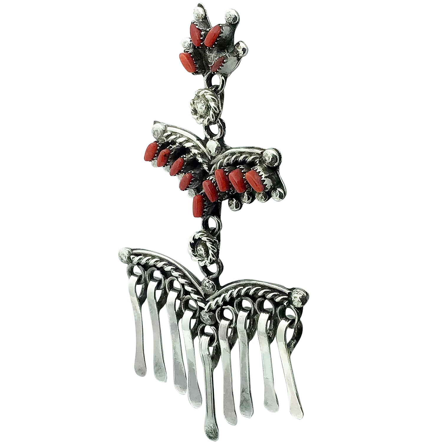 These are incredible earrings. You are going to be blown away by the design of this handmade creation. Zuni artist Rose Fambrough has used long beautiful needlepoint cuts of deep red Mediterranean Coral to make the pair of spectacular dangles. It begins with a cluster of stones that leads to two levels of rock art and silver dangles. You cannot be bashful if you plan on adding these to your collection because they are an attention getter.