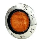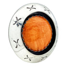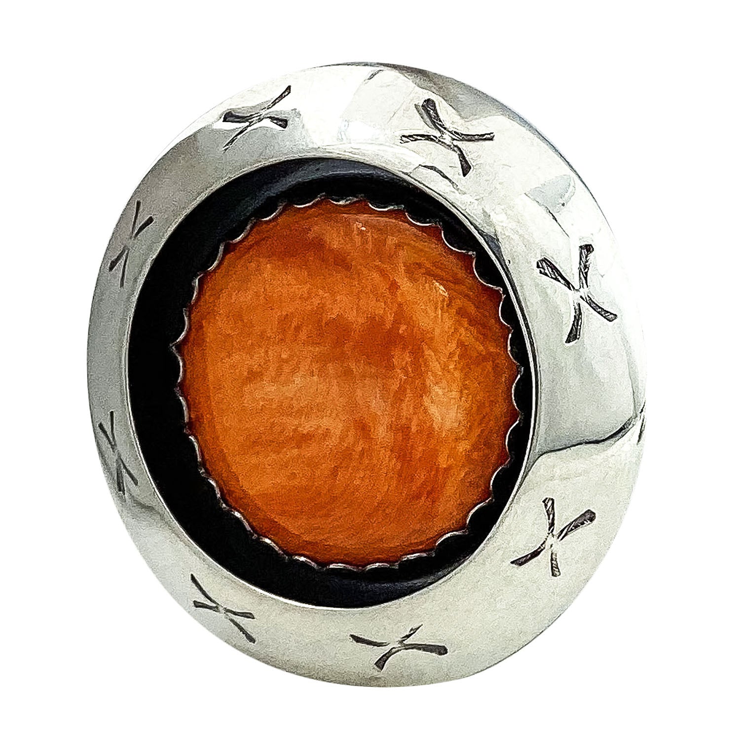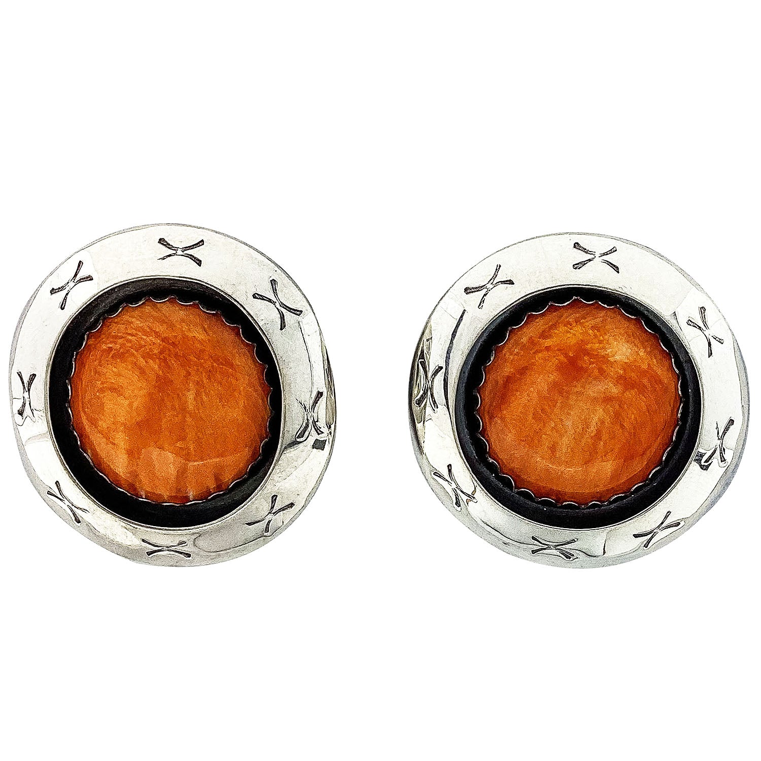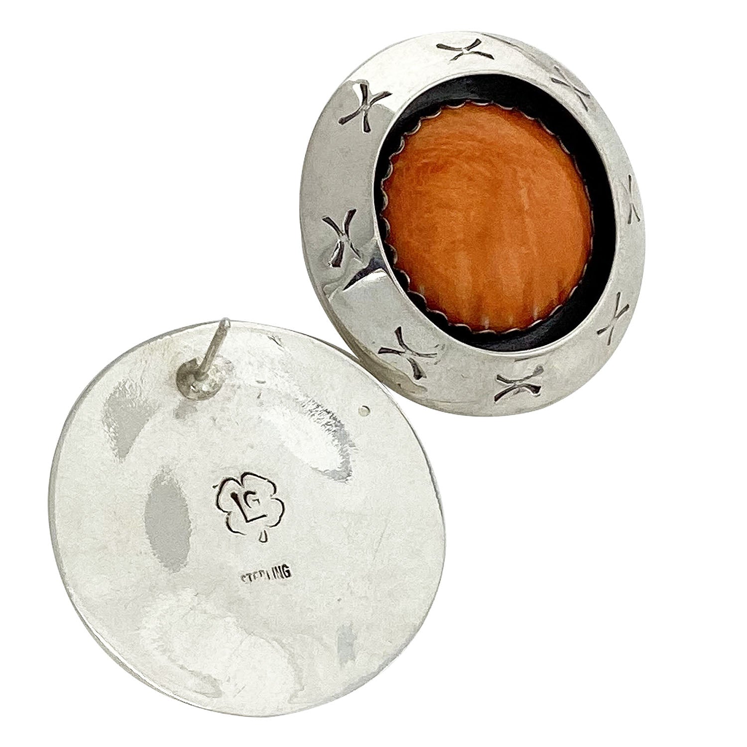 Navajo silversmith Lyanne Goodluck learned the art of silver from her mother and father. Her family has a rich history associated with Navajo silver, going back to her great-great-grandfather Hosteen Goodluck. This pair of pierced earrings has an vibrant cut of orange spiny oyster shell. The rich colored stone shows off a mix of light and dark streaks. Lyanne surrounds the stone in a classic shadow box setting that has been finished with a spectacular mirror shine.
