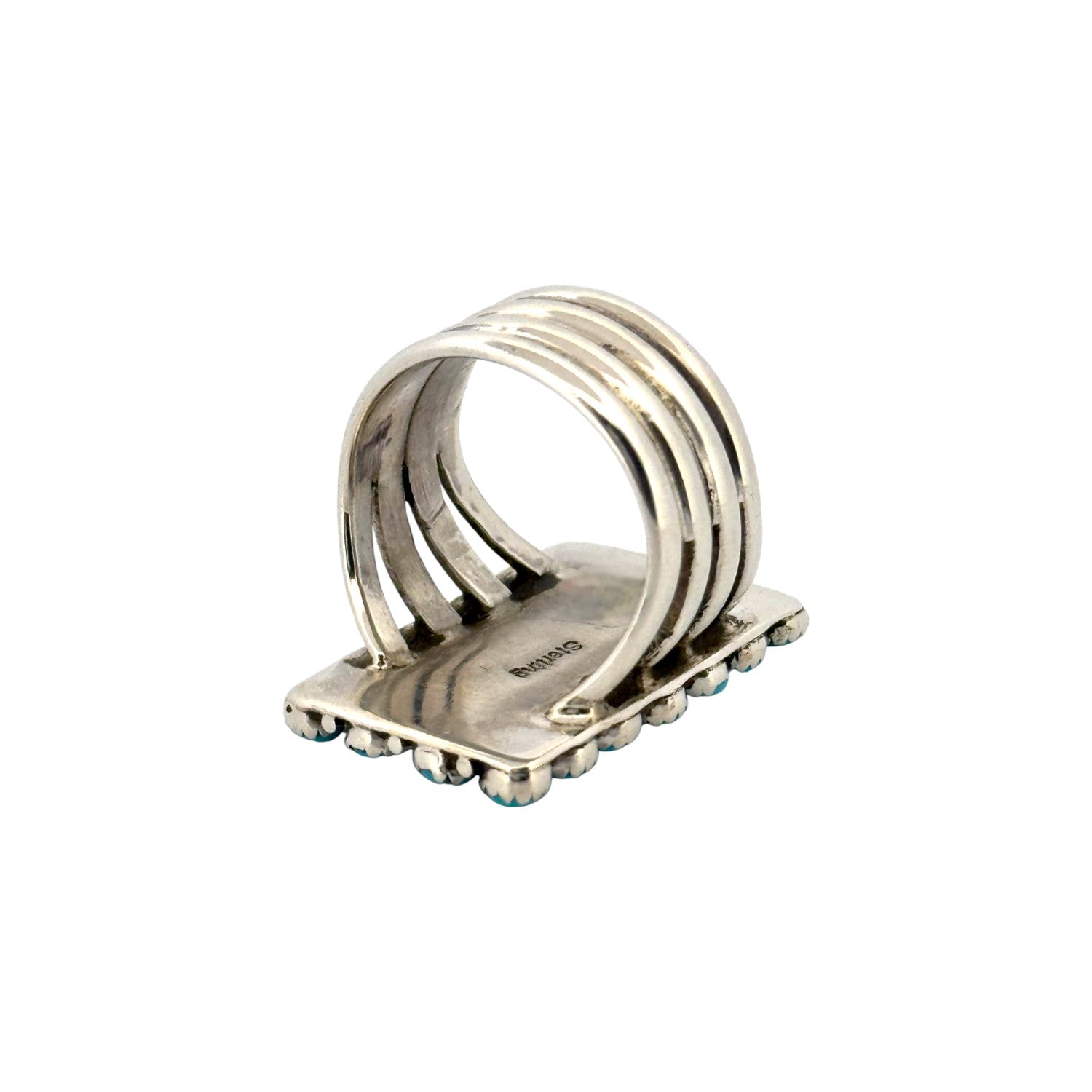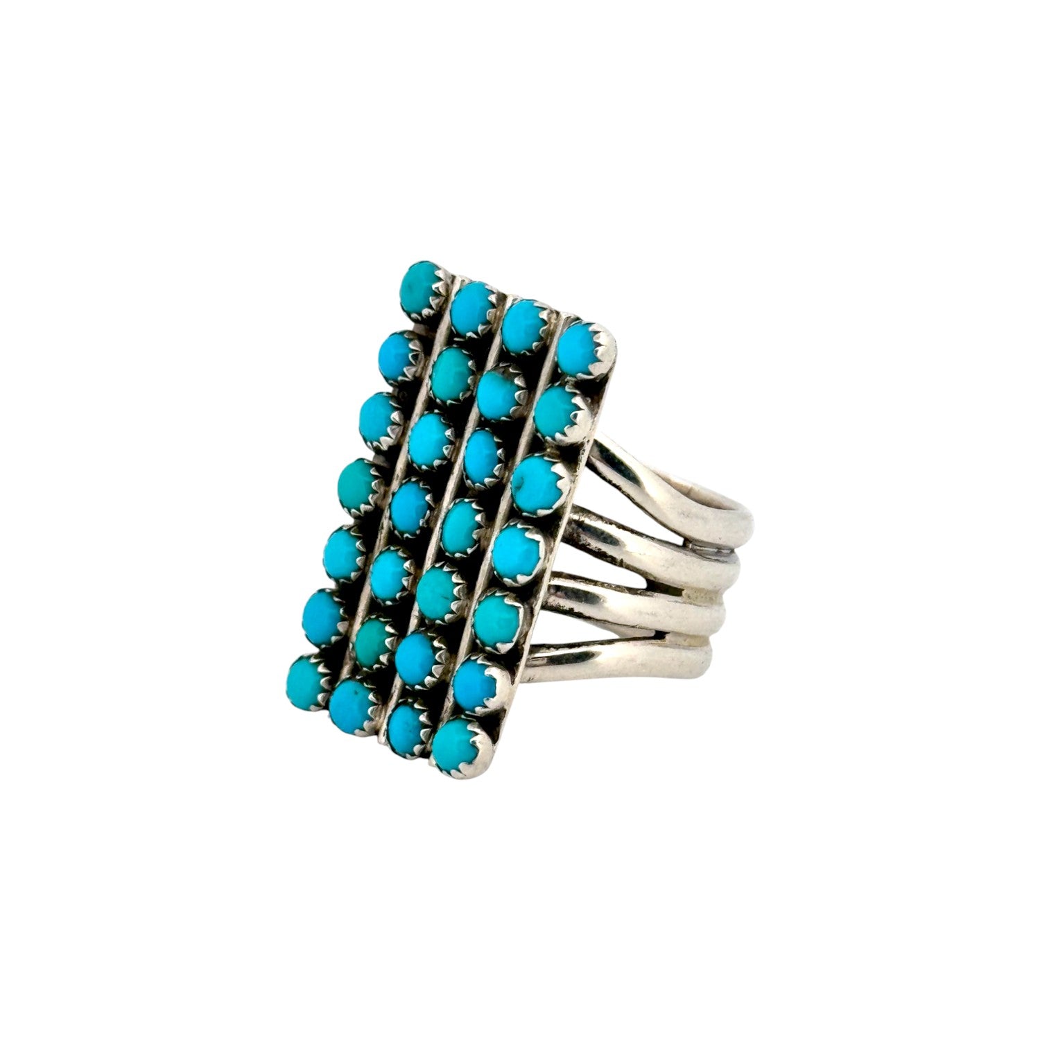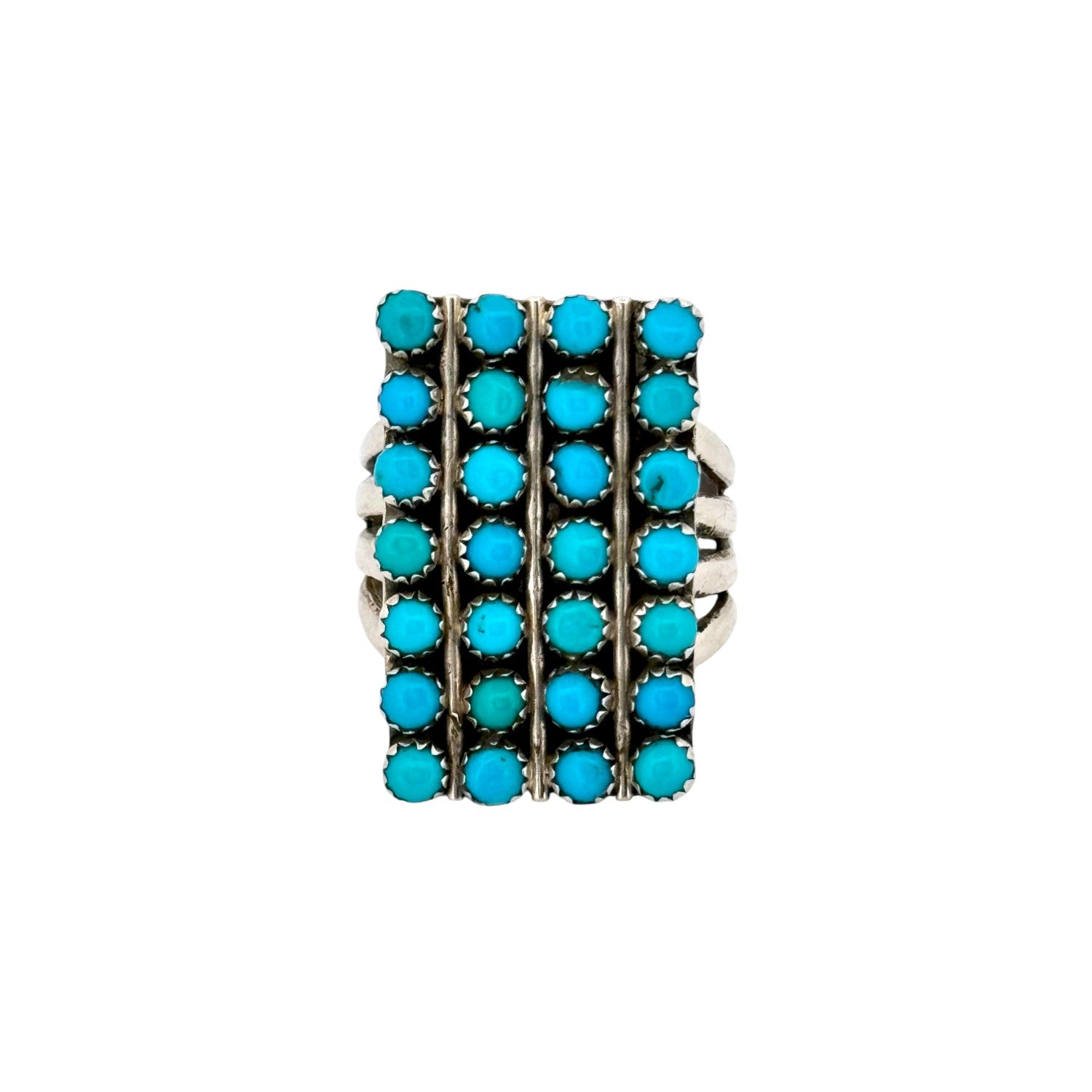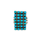 This striking Navajo handmade ring showcases the timeless beauty of Kingman turquoise set in sterling silver. The bold rectangular design features rows of vibrant turquoise stones, each carefully set in traditional sawtooth bezels. The stones are arranged in a clean, grid-like pattern, giving the piece a balanced and eye-catching look. Crafted by skilled Navajo artisans, this ring embodies both cultural heritage and refined craftsmanship. The multi-shank sterling silver band adds strength, comfort, and a touch of elegance to the bold face of the ring. Kingman turquoise, prized for its rich blue hues, has been cherished for generations in Native American jewelry. This piece is a stunning statement ring, blending tradition with a timeless Southwestern style.