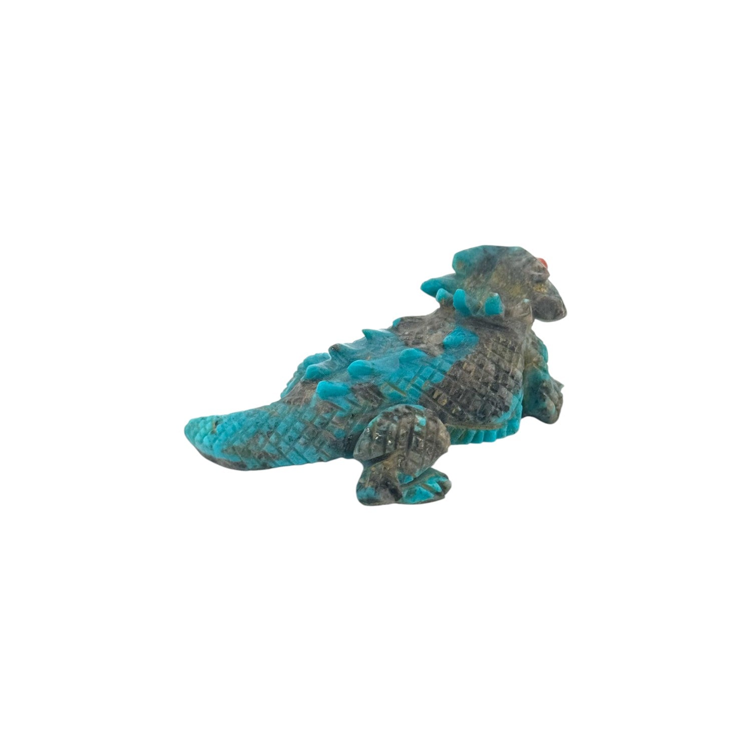 This striking Zuni horned toad fetish is hand-carved from vibrant turquoise, showcasing the stone’s natural matrix for added depth and character. Every detail, from the spiny ridges along its back to the textured scales, is masterfully rendered, reflecting the carver’s skill and precision. Inlaid coral eyes bring the piece to life, offering a vivid contrast against the turquoise body. In Zuni tradition, the horned toad is revered as a symbol of protection, longevity, and perseverance, often associated with good fortune. The combination of turquoise and coral not only enhances its visual appeal but also carries traditional meanings of healing, balance, and vitality. Smoothly polished yet rich with carved detail, this fetish captures both artistic beauty and cultural significance.