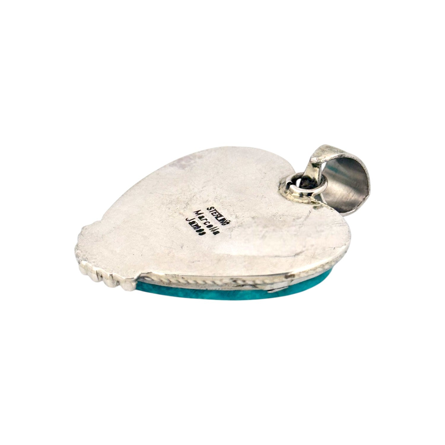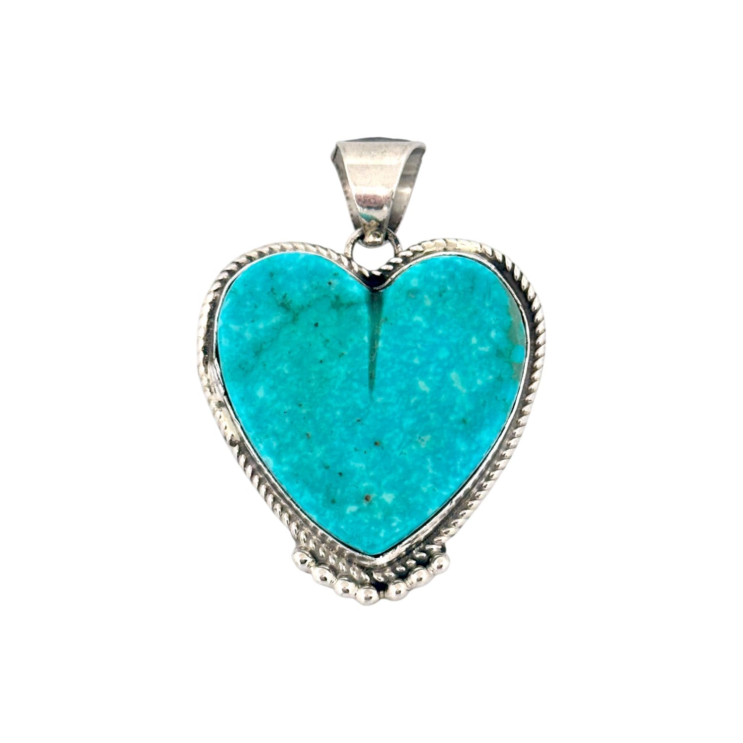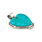 This elegant pendant by Navajo silversmith Marcella James highlights the natural beauty of Kingman Turquoise. Shaped into a bold heart, the turquoise stone radiates with a rich sky-blue hue, accented by subtle matrix patterns that make each piece unique. The stone is set in sterling silver, framed with a delicate rope-edge border and finished with silver bead accents at the base, adding depth and texture to the design. Its smooth polish enhances the turquoise’s vibrant color, making it the centerpiece of the pendant. The sturdy silver bail allows it to pair beautifully with a favorite chain or strand of beads. As a handmade piece, it reflects the artistry and tradition of Navajo jewelry-making, blending cultural heritage with timeless elegance.