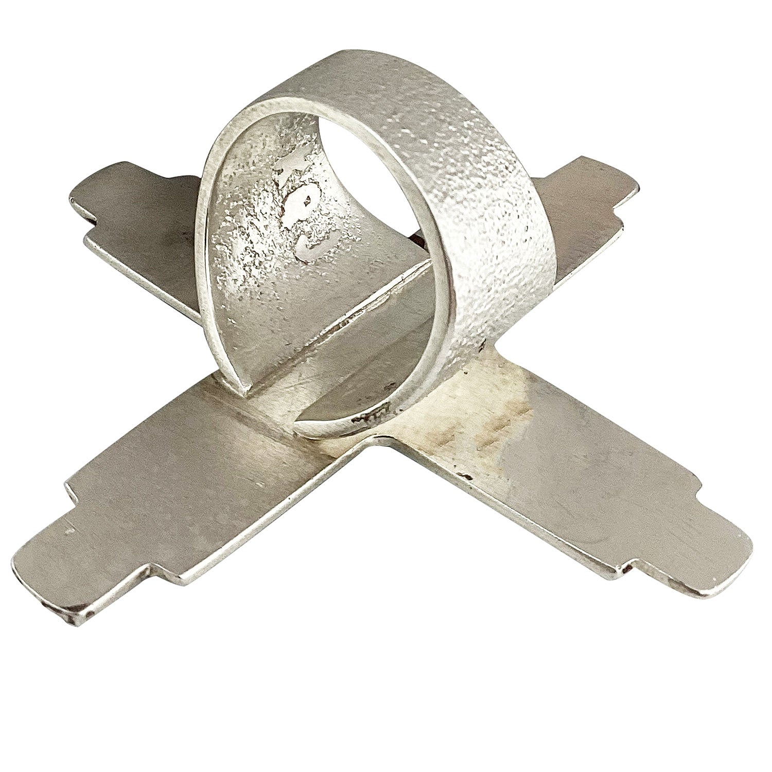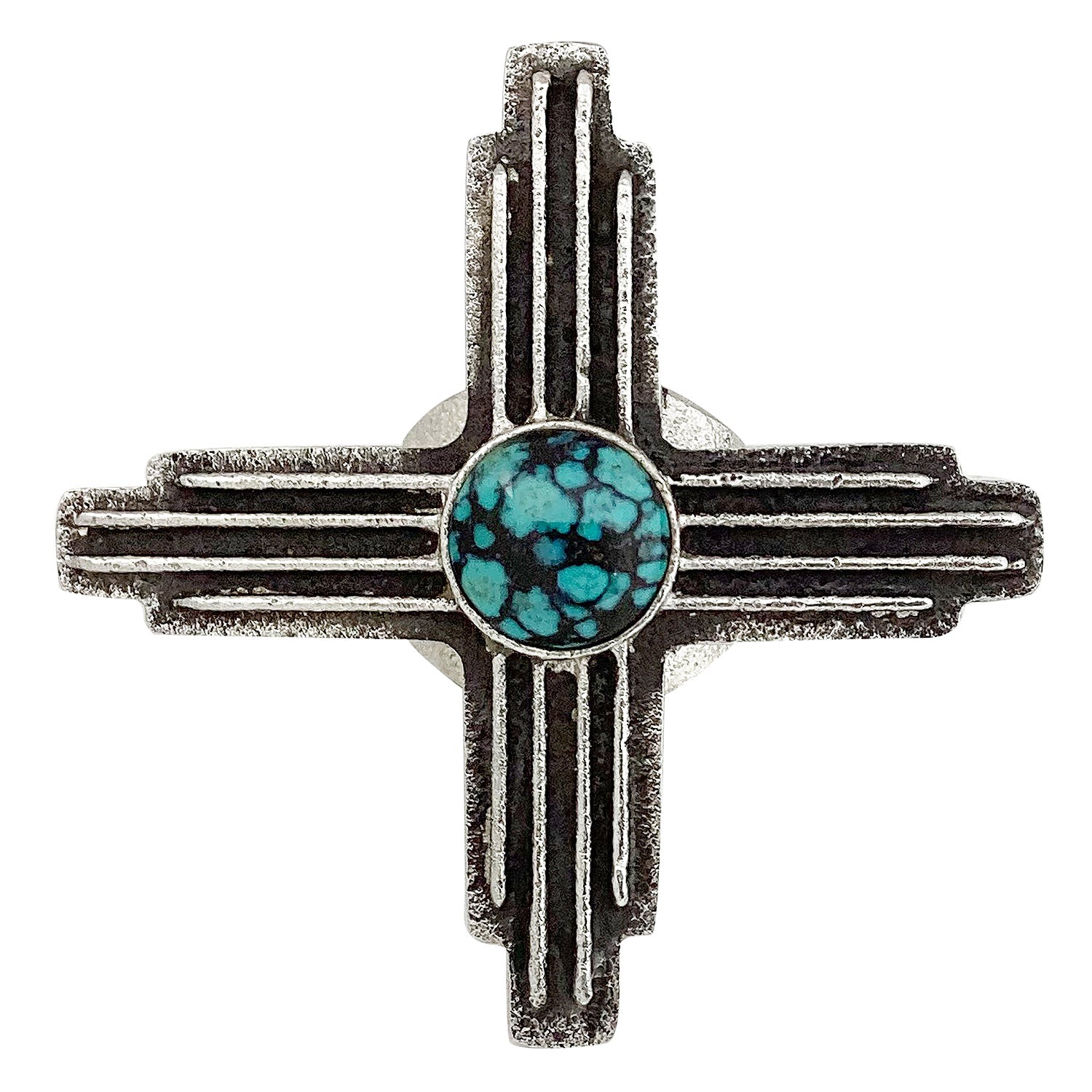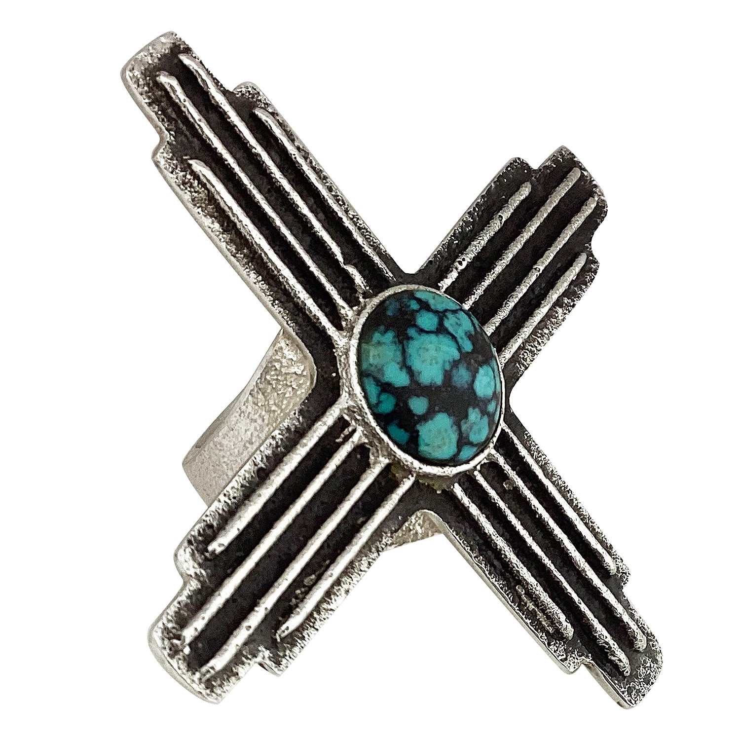 Navajo tufa cast artist Kelsey Jimmie learned his craft in the workshop of Darryl Dean Begay. His work is about perfection, polishes, design, and technique. That is what he learned from his teacher. He makes his silver using a tufa stone and that allows the work to have a beautiful earth sand texture. This stunning ring has been fashioned after the New Mexico Zia. Kelsey places a stunning piece of Chinese Turquoise in the center. You are going to appreciate how long he makes the four directions of the Zia and the comfortable tapered ring band. Check out his other work in the online Trading Post.