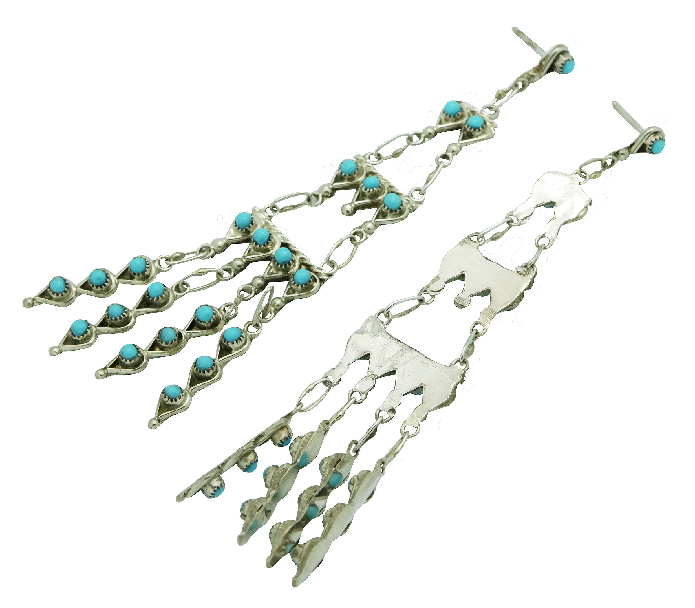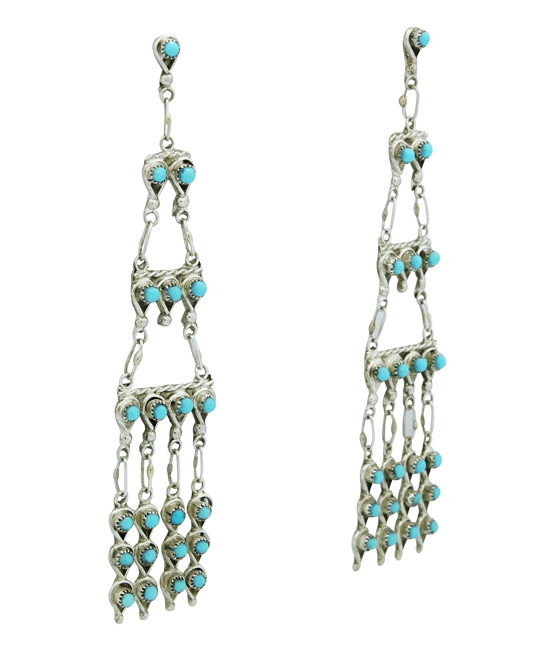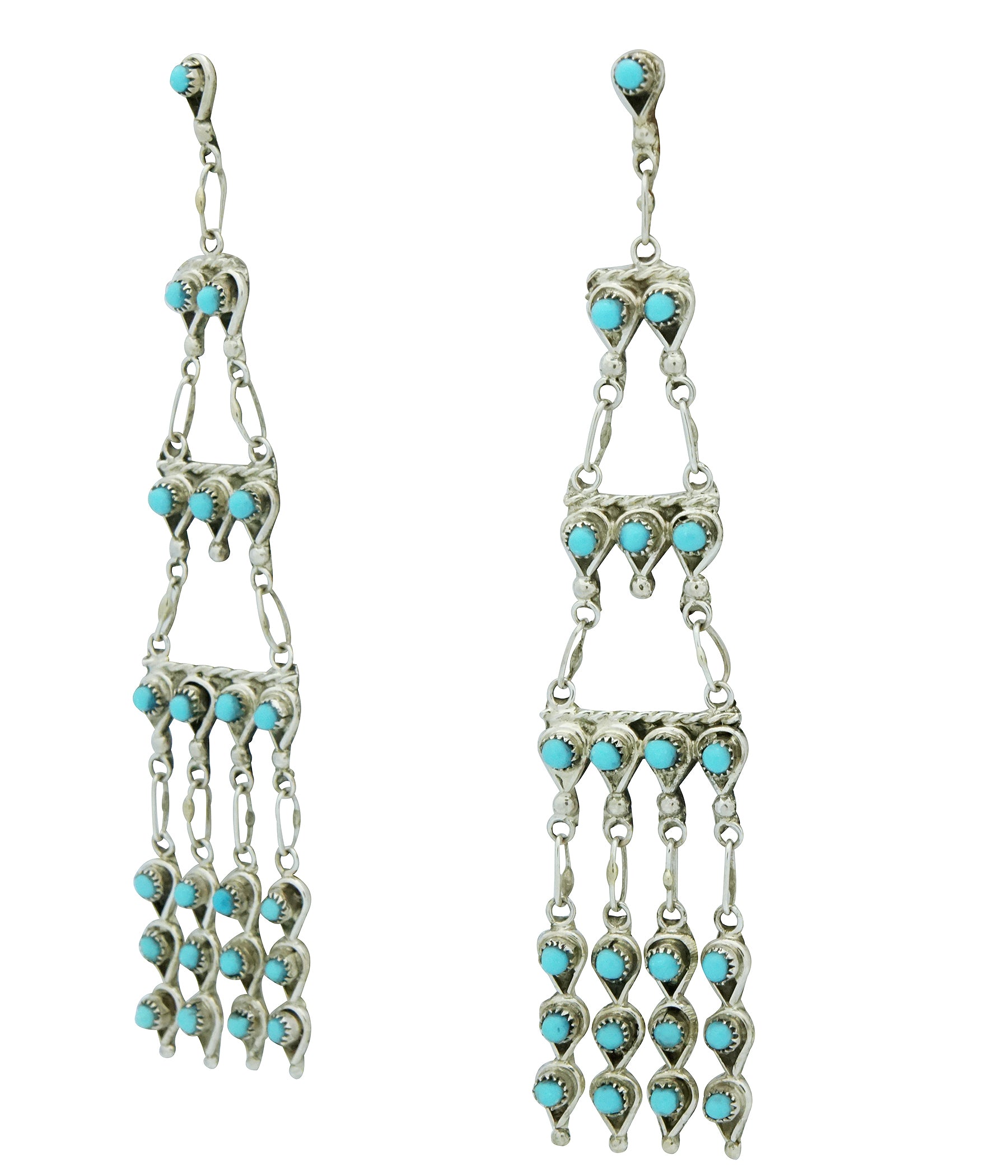 This chandelier style earring is a showcase of signature Zuni lapidary art. The Northern New Mexico Pueblo is full of amazing lapidary artists. You will find pieces of art that are full of gorgeous clusters of stones. This long earring is a classic cluster creation that displays a cluster of petit point cuts of hand shaped Sleeping Beauty Turquoise stones. All of the sky blue rocks are filled with a gorgeous clear color. Silver drops and twisted wire surround the stones. This cluster piece is made by Zuni artist Waylon Johnson.