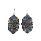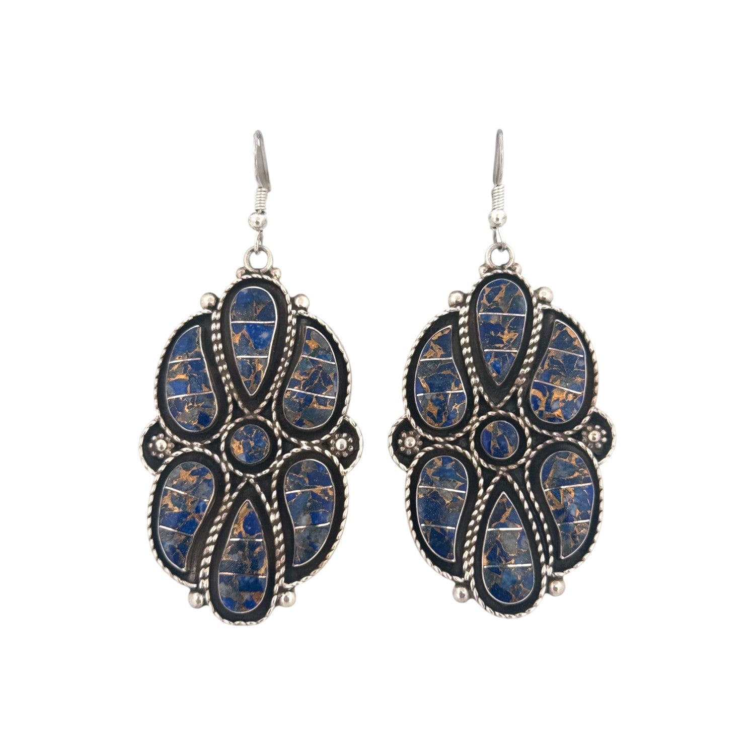 These exquisite earrings by Zuni artist B.C. Leekity showcases the intricate beauty of traditional stone inlay work. Handcrafted in sterling silver, each earring features a bold floral-inspired design set with deep blue Lapis Lazuli, highlighted by its natural golden Pyrite flecks. The stones are carefully inlaid in a mosaic pattern, framed by twisted silver rope detailing that adds depth and texture. The symmetrical layout creates a harmonious balance, reflecting both precision and artistry. Lightweight yet striking, the dangle style allows for elegant movement, making them perfect for both everyday wear and special occasions. Leekity’s craftsmanship reflects the celebrated Zuni tradition of fine inlay jewelry, combining beauty, symbolism, and heritage.