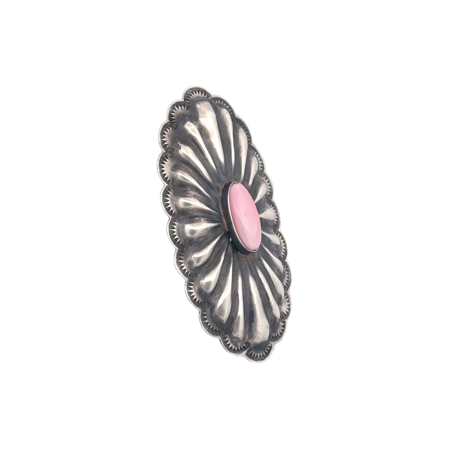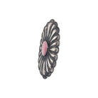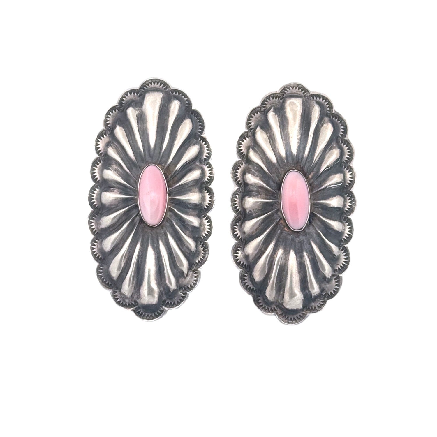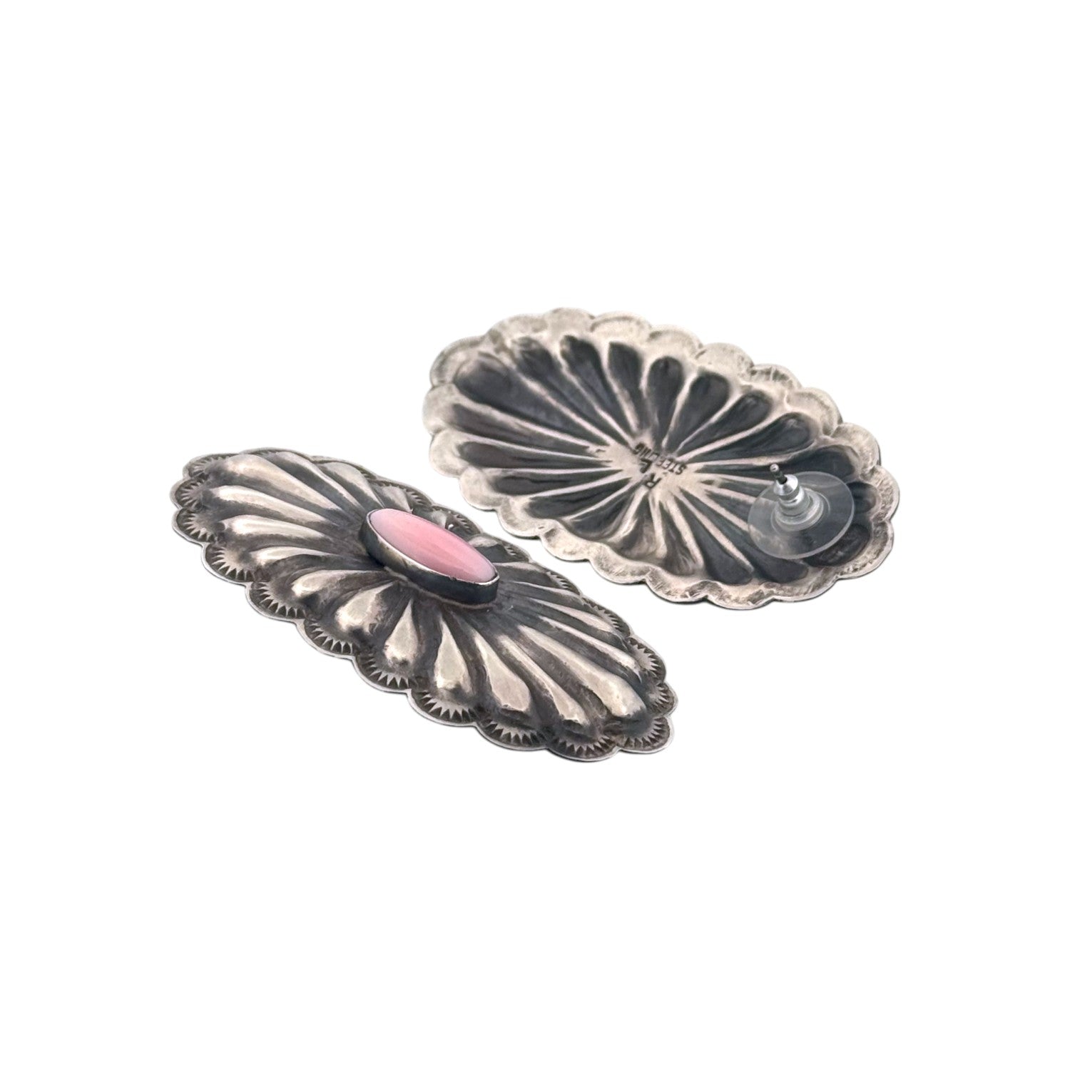 These exquisite earrings by Navajo artist Rita Lee showcase the timeless beauty of traditional craftsmanship with a graceful modern touch. Handcrafted from sterling silver, each piece features bold repoussé work radiating outward in a scalloped design, creating depth and movement. At the center lies a polished pink shell cabochon, its soft blush hue offering a delicate contrast to the oxidized silver. The floral-inspired motif symbolizes growth and harmony, while the elongated shape adds elegance and presence. Meticulously detailed, the earrings reflect the balance of strength and femininity that defines Navajo silversmithing. Perfect for both everyday wear and special occasions, they bring sophistication with a touch of Southwest charm.