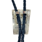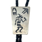 Crafted by renowned Hopi silversmith Ambrose Namoki, this handmade bolo tie is a striking tribute to traditional Hopi overlay artistry. The sterling silver slide features a finely cut figure of a Kachina dancer in motion, flanked by traditional Hopi symbols representing rain and prayer for abundance. Namoki’s expert overlay technique—where the upper layer of silver is meticulously cut by hand and soldered over a darkened base—gives the imagery bold contrast and dimensional depth. Each detail is steeped in symbolism, honoring the spiritual and cultural roots of Hopi ceremonial life. The piece is mounted on a classic black braided leather cord with sterling silver tips, blending traditional design with wearable sophistication. Powerful yet understated, this bolo tie is more than adornment—it's a piece of living heritage.