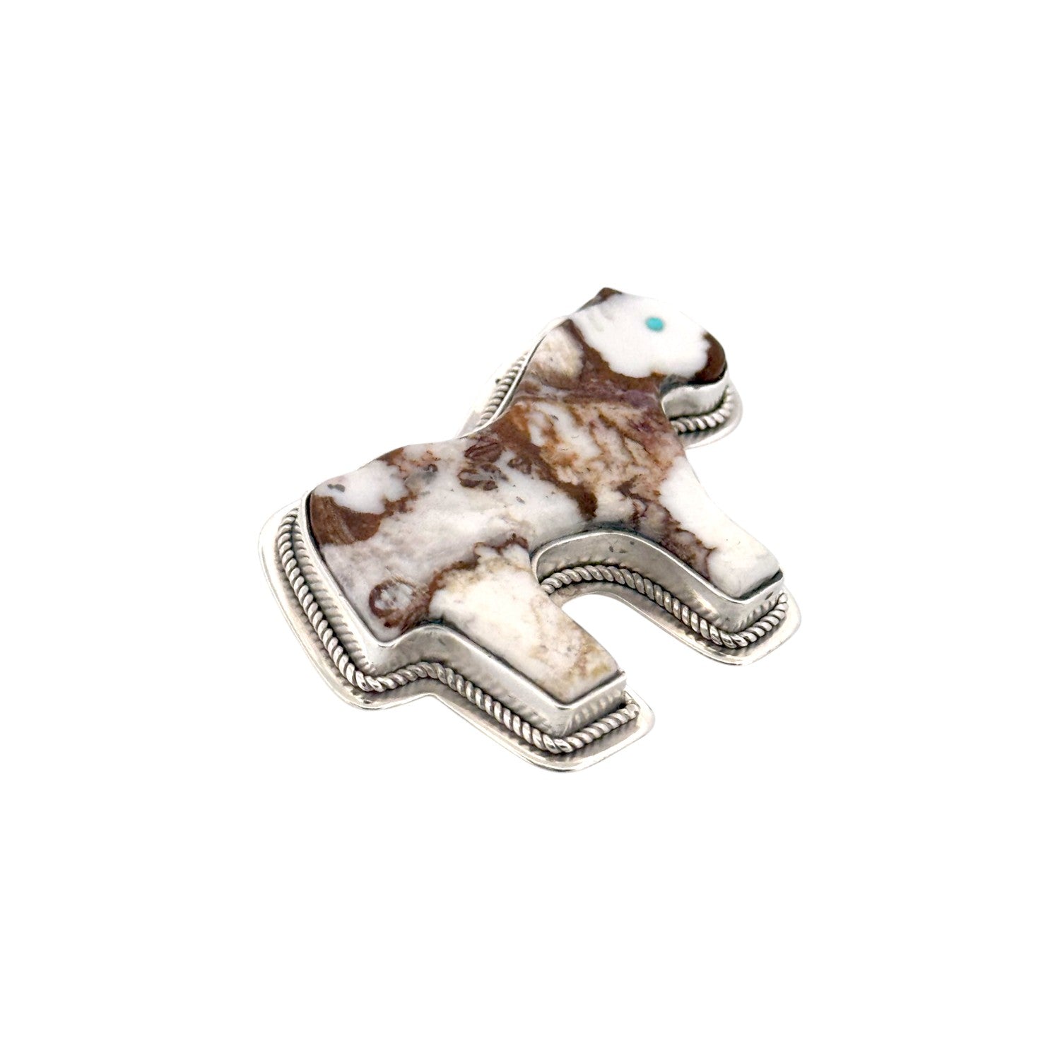This pendant by Zuni artist Miranda Peynetsa is a striking example of traditional stone inlay and symbolism. Handcrafted in sterling silver, it is shaped into a bear, an enduring symbol of protection, healing, and strength in Native culture. The body of the bear features a multi-stone inlay of Crazy Horse Turquoise with its distinctive white, brown, and russet matrix, accented with a small Sleeping Beauty Turquoise eye for a touch of vivid color. The stone is carefully set within a silver bezel, bordered by a delicate twisted rope design that enhances its natural beauty. Its highly polished finish highlights both the craftsmanship and the unique character of the stone. A silver bail at the top allows it to be worn on a chain or beaded necklace with ease. As a Zuni handmade piece, it carries both artistry and cultural meaning, making it a beautiful addition to any Native jewelry collection.