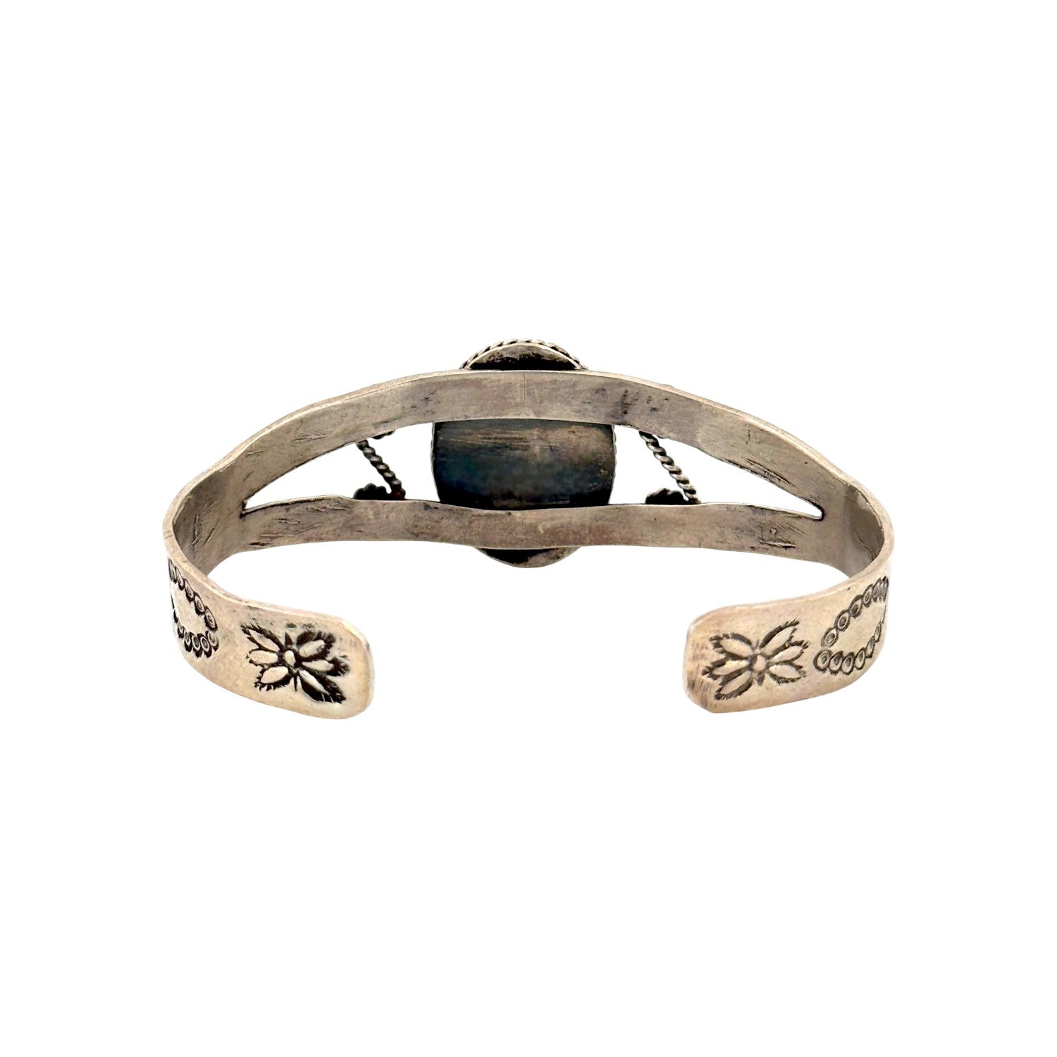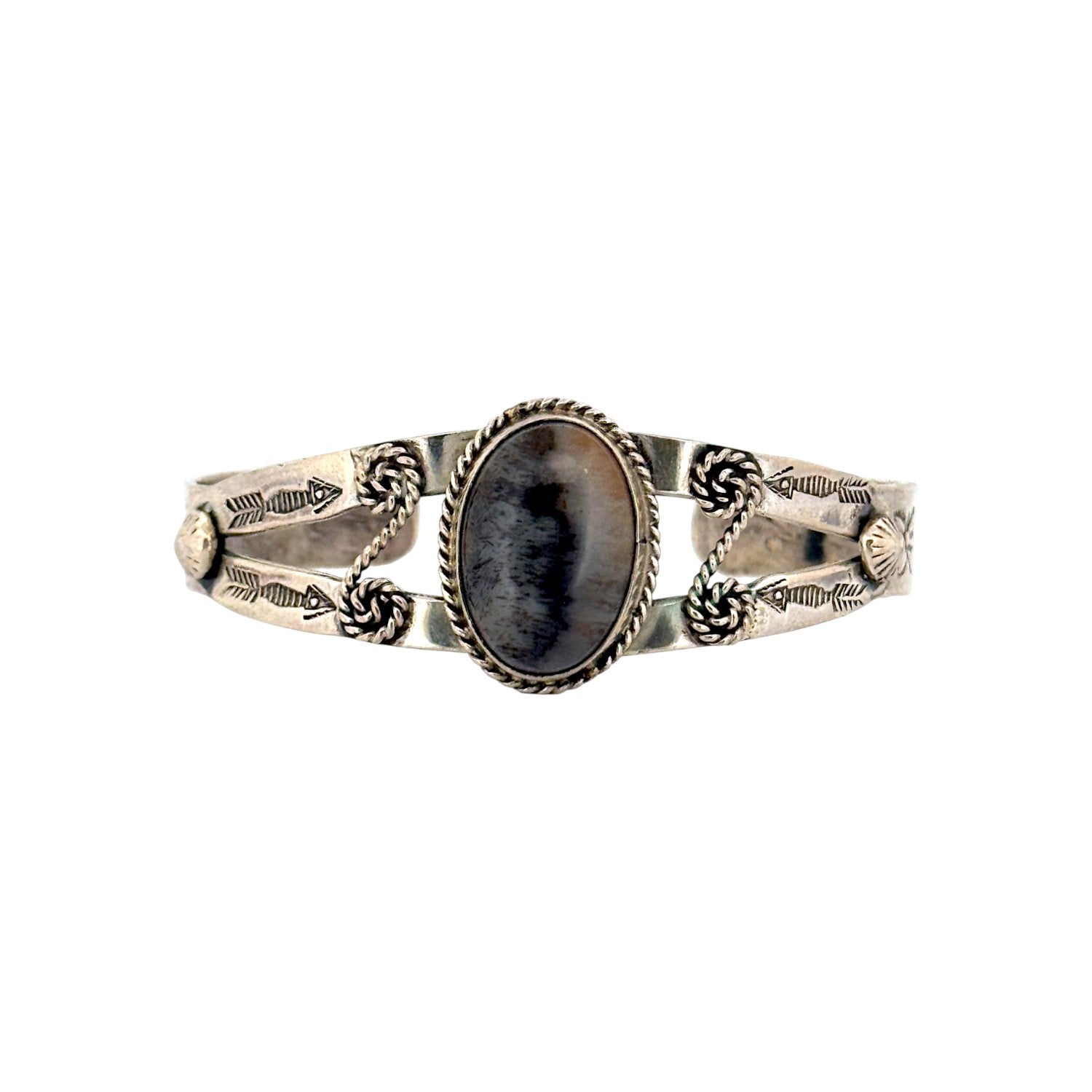 This vintage Navajo bracelet, crafted in the 1990s, features a striking Montana Agate gemstone set in sterling silver. The oval stone displays earthy tones and natural patterns unique to Montana Agate, giving the piece an organic and timeless beauty. Surrounding the stone is a twisted silver rope border, a hallmark of Navajo silversmithing, which adds depth and texture. The split-band design is adorned with hand-stamped details, including arrow and sunburst motifs, symbolizing direction, protection, and life. Each element of this bracelet reflects the artistry and cultural symbolism deeply rooted in Navajo tradition. The wide cuff style ensures a comfortable fit while making a bold statement on the wrist. Collectors and admirers of authentic Native jewelry will appreciate both its craftsmanship and the natural beauty of the agate.