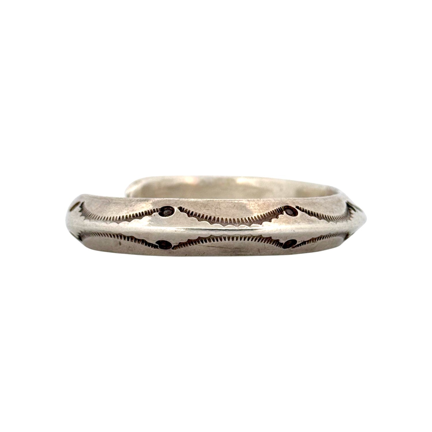 This vintage Navajo bracelet from the 1990s is a refined example of traditional silverwork. Handcrafted from sterling silver, the cuff features delicately stamped designs that flow in repeating patterns along its surface, creating a balanced and rhythmic look. The stamping is highlighted with subtle oxidization, enhancing the depth and detail of the design. Its rounded, slightly domed form gives the bracelet a smooth, comfortable fit while maintaining a solid and durable feel. The understated elegance of this piece makes it versatile, suitable for both everyday wear and layering with other jewelry. Its natural patina adds character and authenticity, reflecting its age and handmade origin.