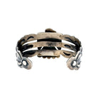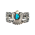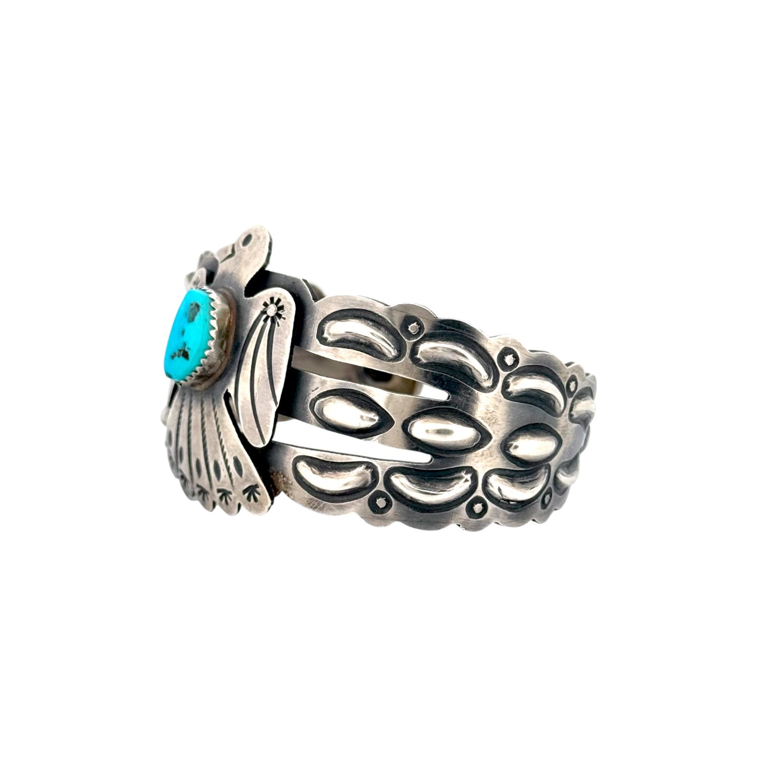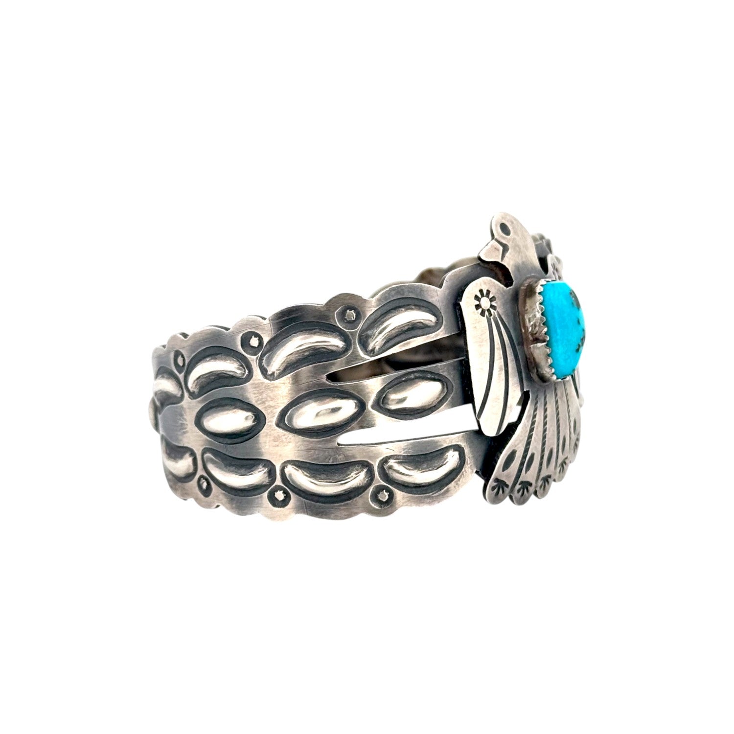This sterling silver bracelet by Tim Yazzie is a powerful example of Navajo handmade artistry. The centerpiece features a traditional thunderbird design, symbolizing strength, protection, and spiritual power, accented with a vivid Kingman Turquoise stone at its heart. The Kingman Turquoise, with its rich blue hue and natural matrix, adds both beauty and cultural meaning to the piece. Surrounding the thunderbird are bold repoussé and stamped details, creating depth and texture that reflect expert silversmithing techniques. The wide cuff design gives the bracelet a strong presence while remaining comfortable to wear. Oxidized silver backgrounds enhance the contrast, making the details stand out with striking clarity.