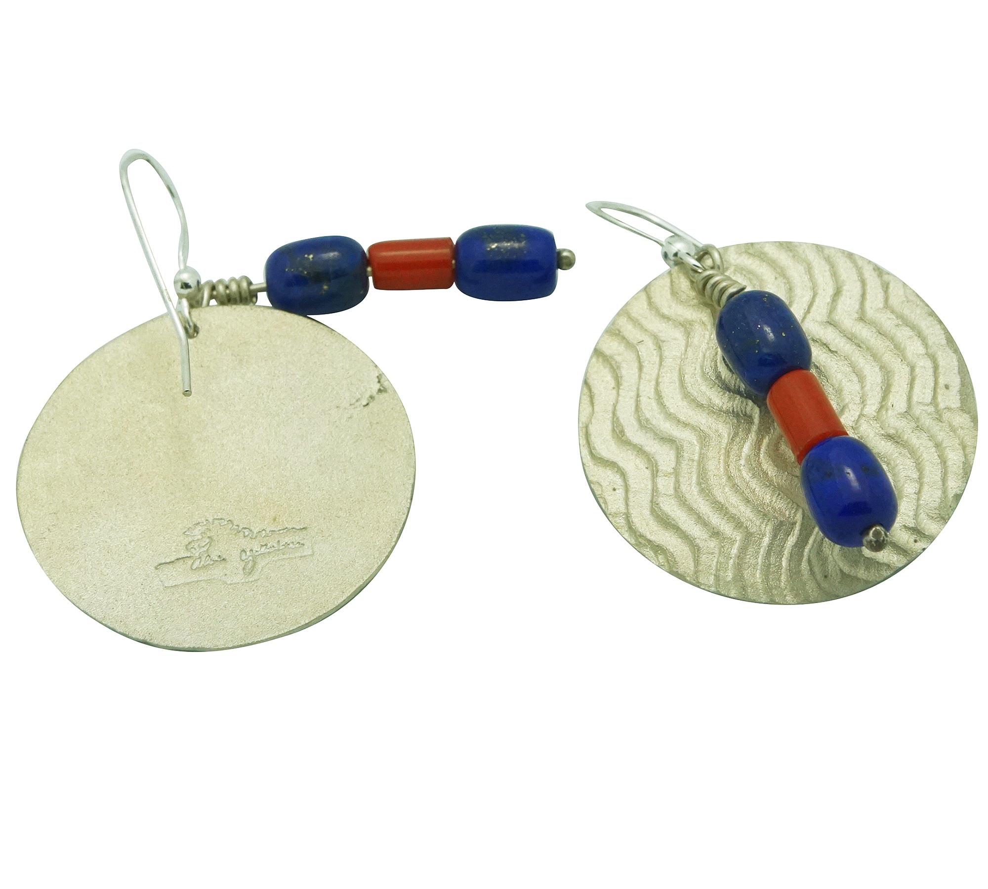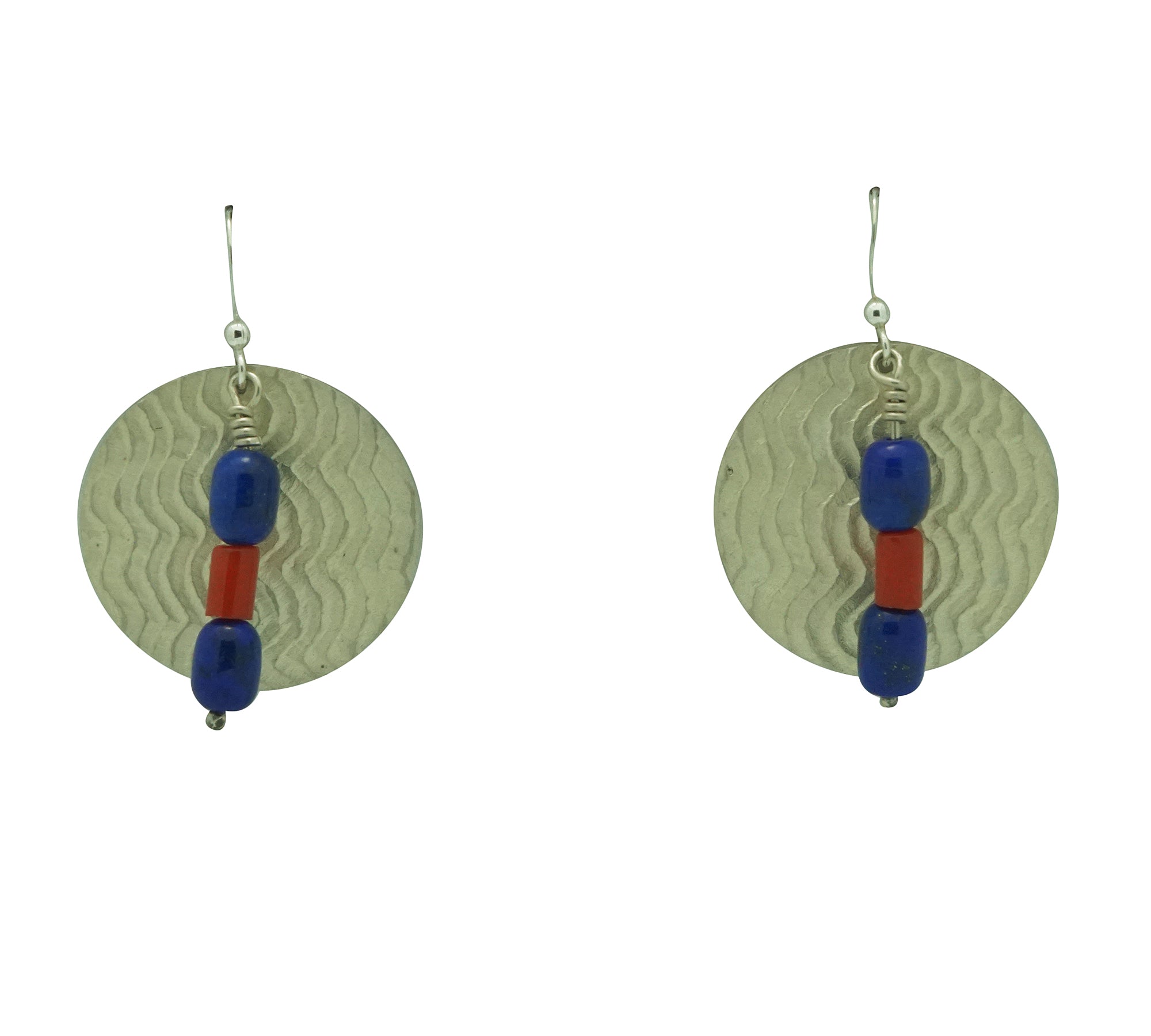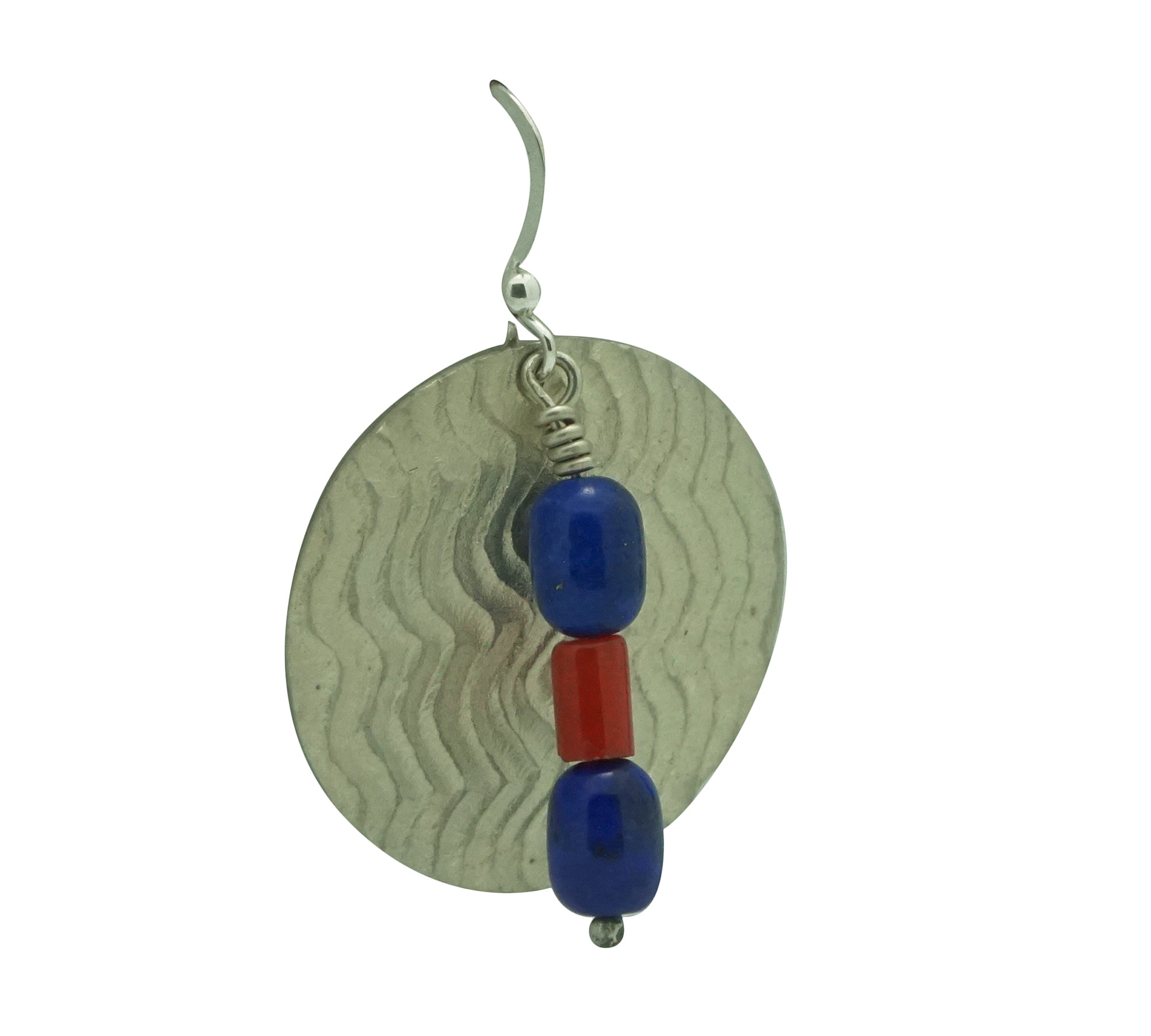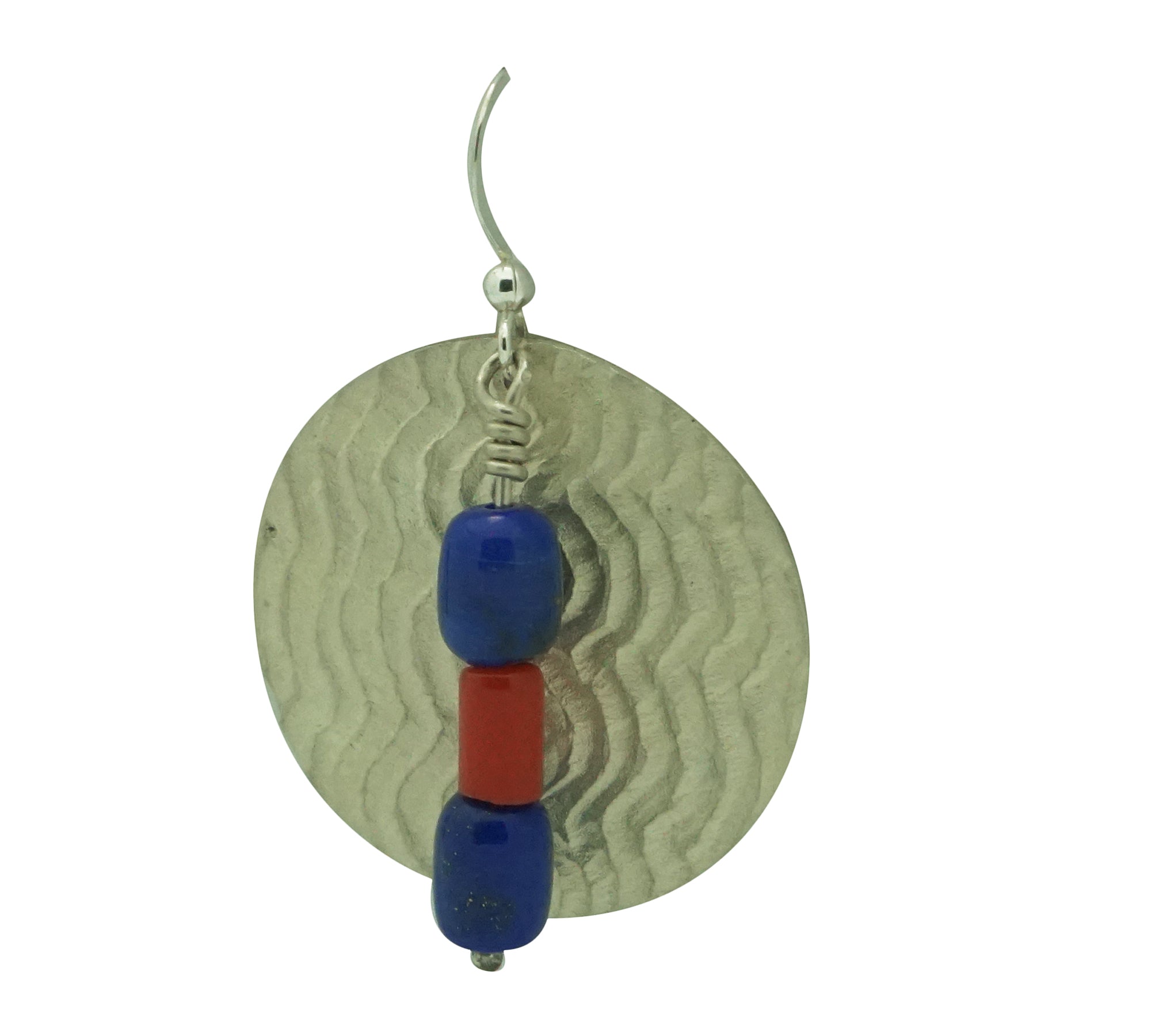 You will immediately be drawn to the colors of this gorgeous earring. It includes deep blue lapis beads around a dark red coral with this large silver backdrop. The warrior shield inspired silver design dangles from French hooks. The textured shield has a unique old rock art look. You are going to love wearing your new pair of Alvin Yellowhorse earrings